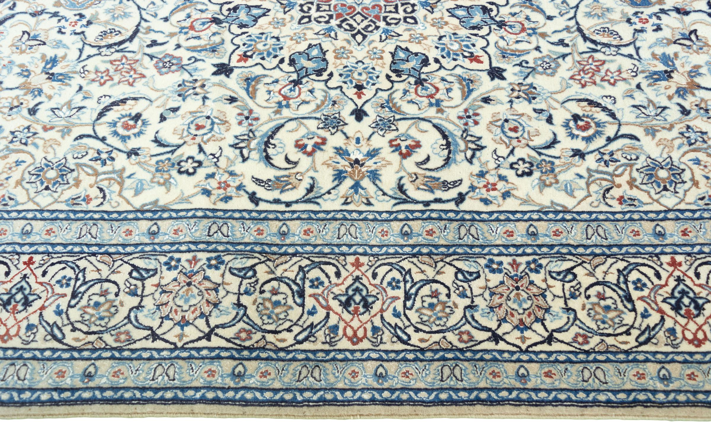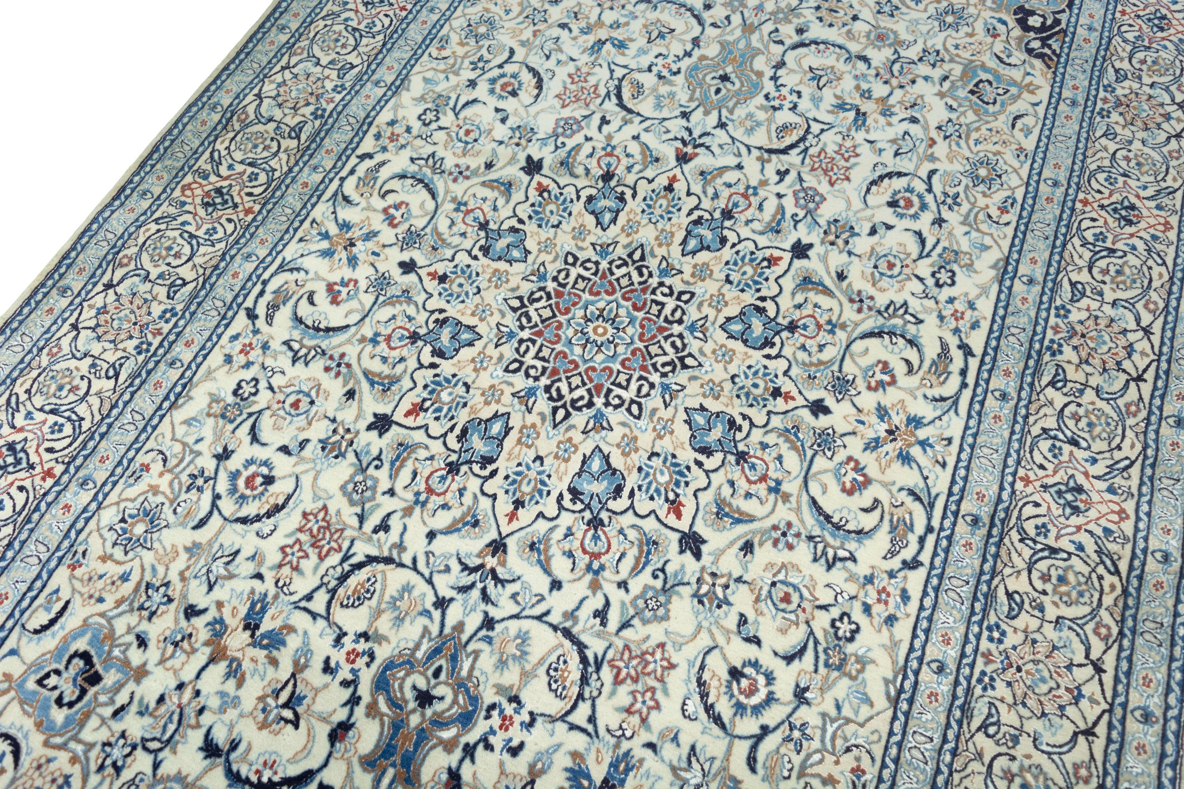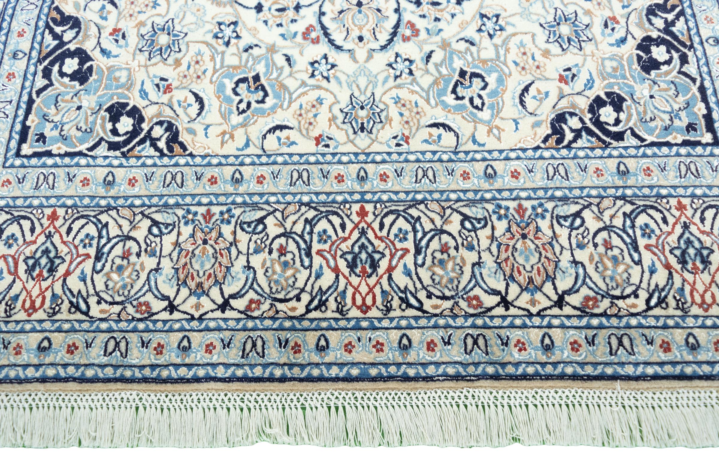 This Nain rug combines quality, tradition and an unmistakable design. It was hand-knotted from high-quality cork wool and natural silk in the desert town of the same name, Nain. Lovers of valuable rugs from Iran will love this Persian rug. With Nain rugs in the 6La and 4La classifications, you have a real work of art with an incredible level of detail that you can really lose yourself in. Nain 4La rugs are almost impossible to find today, as they are extremely elaborate to produce.