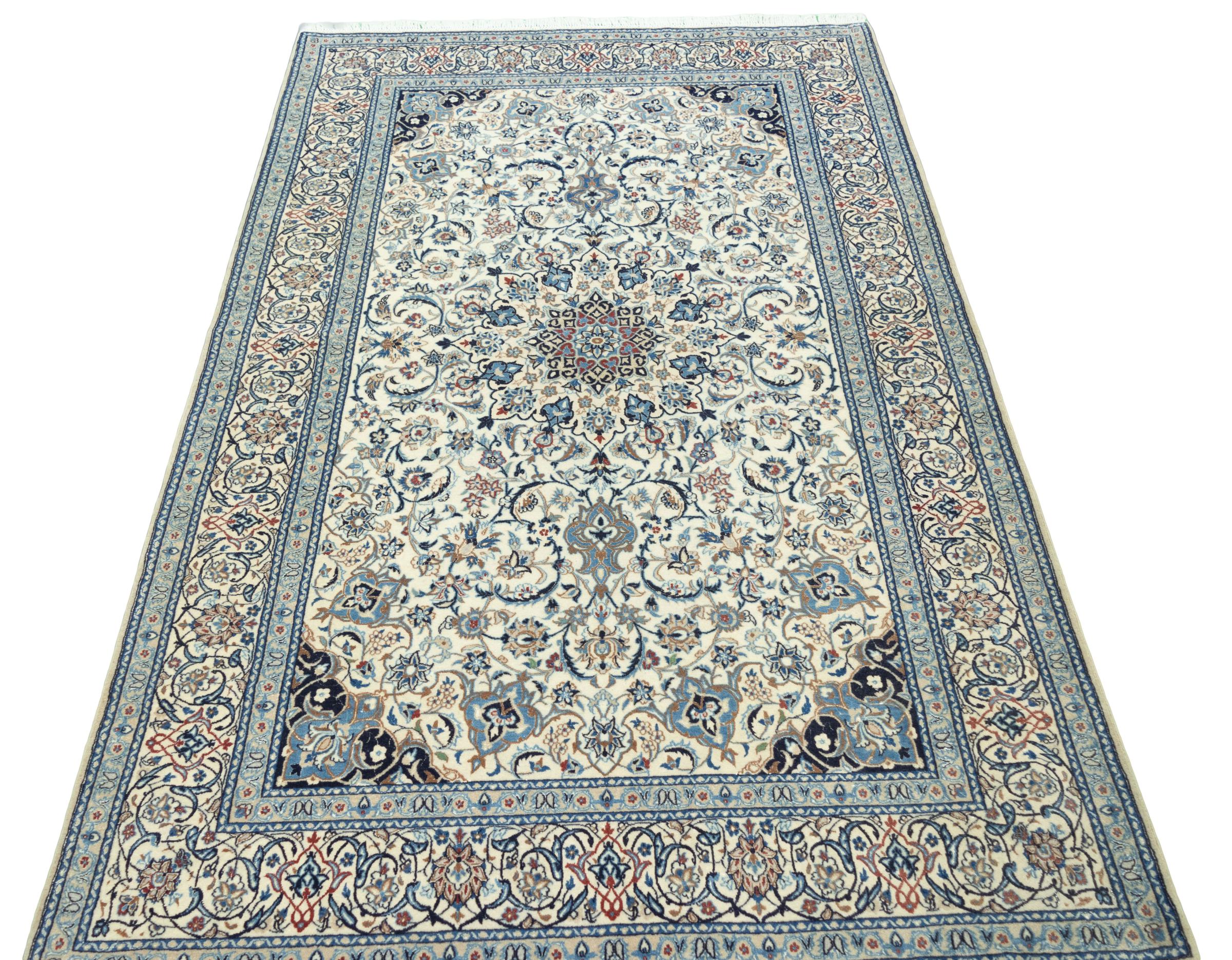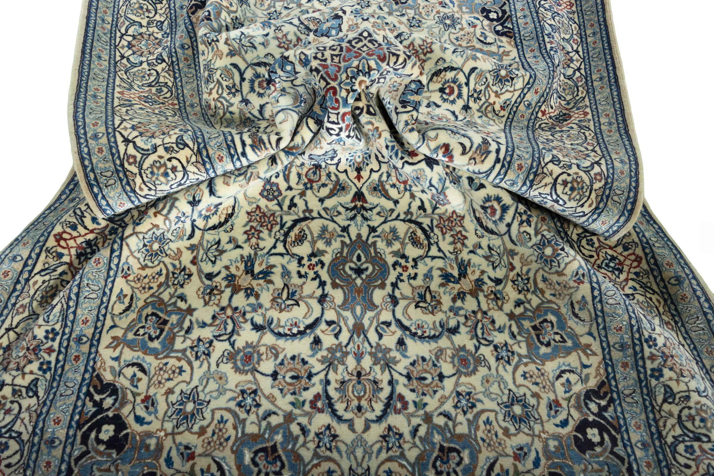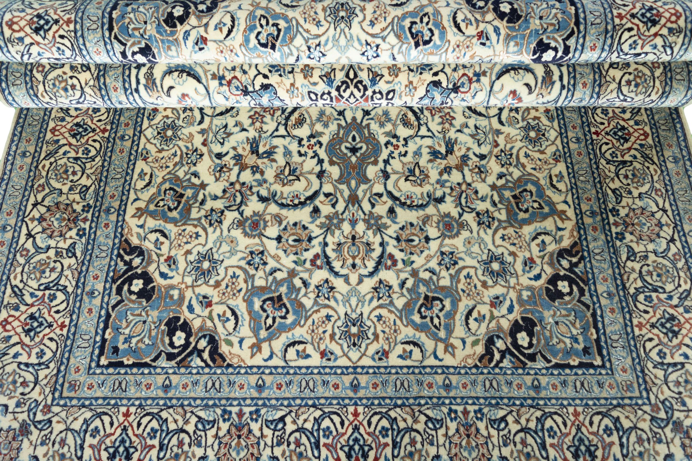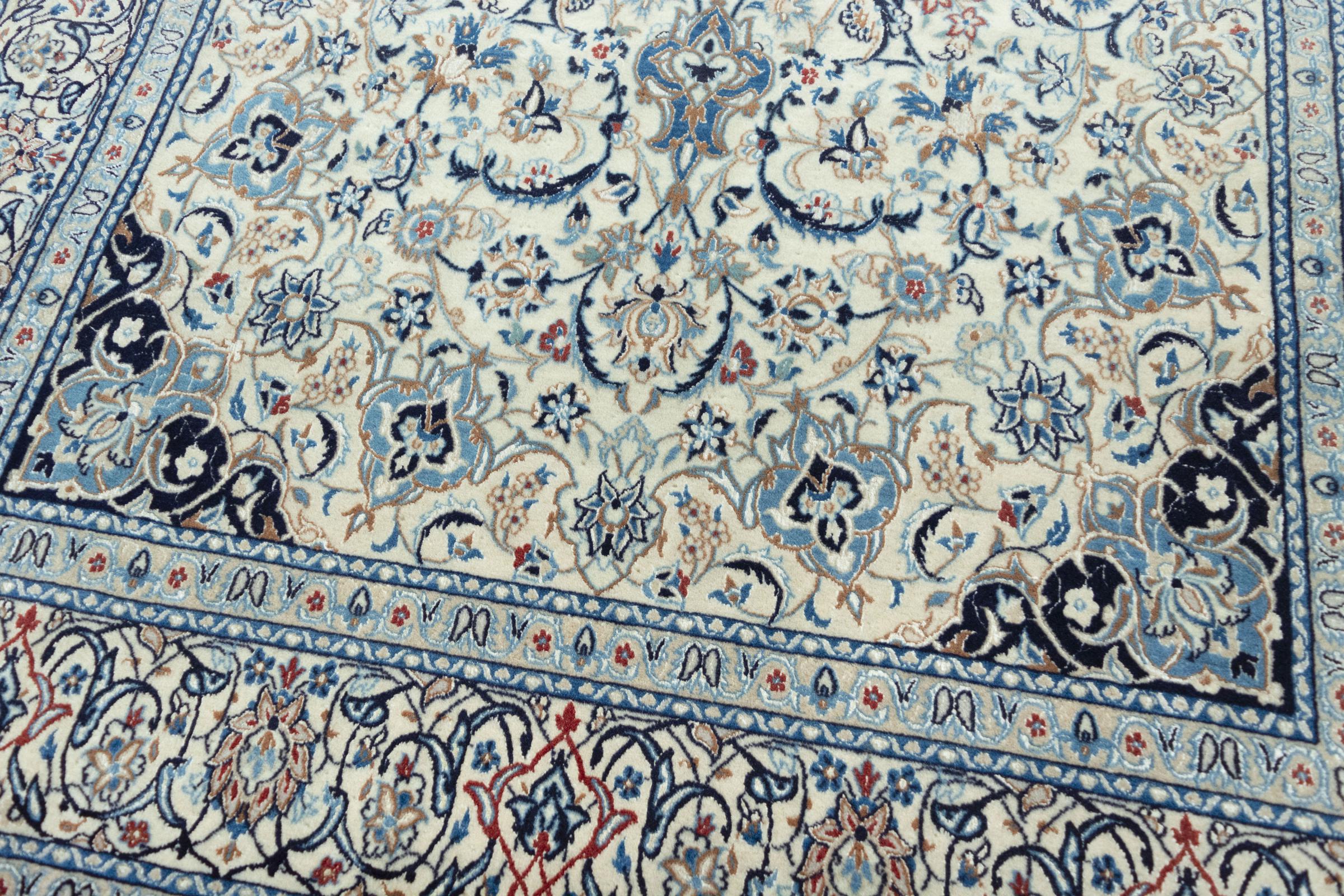 This Nain rug combines quality, tradition and an unmistakable design. It was hand-knotted from high-quality cork wool and natural silk in the desert town of the same name, Nain. Lovers of valuable rugs from Iran will love this Persian rug. With Nain rugs in the 6La and 4La classifications, you have a real work of art with an incredible level of detail that you can really lose yourself in. Nain 4La rugs are almost impossible to find today, as they are extremely elaborate to produce.
