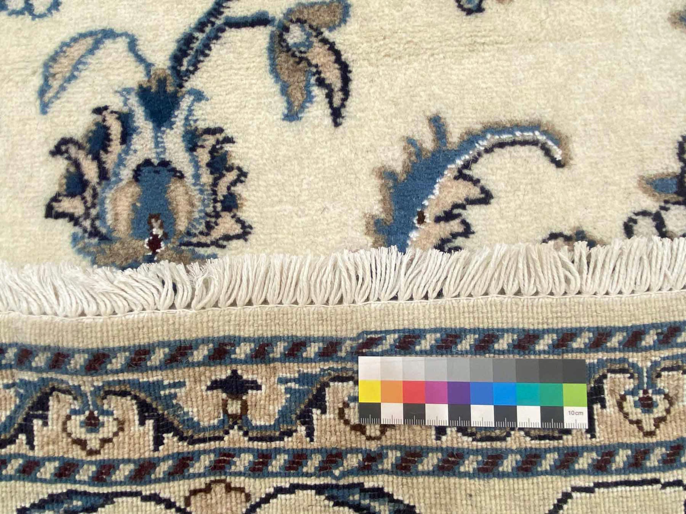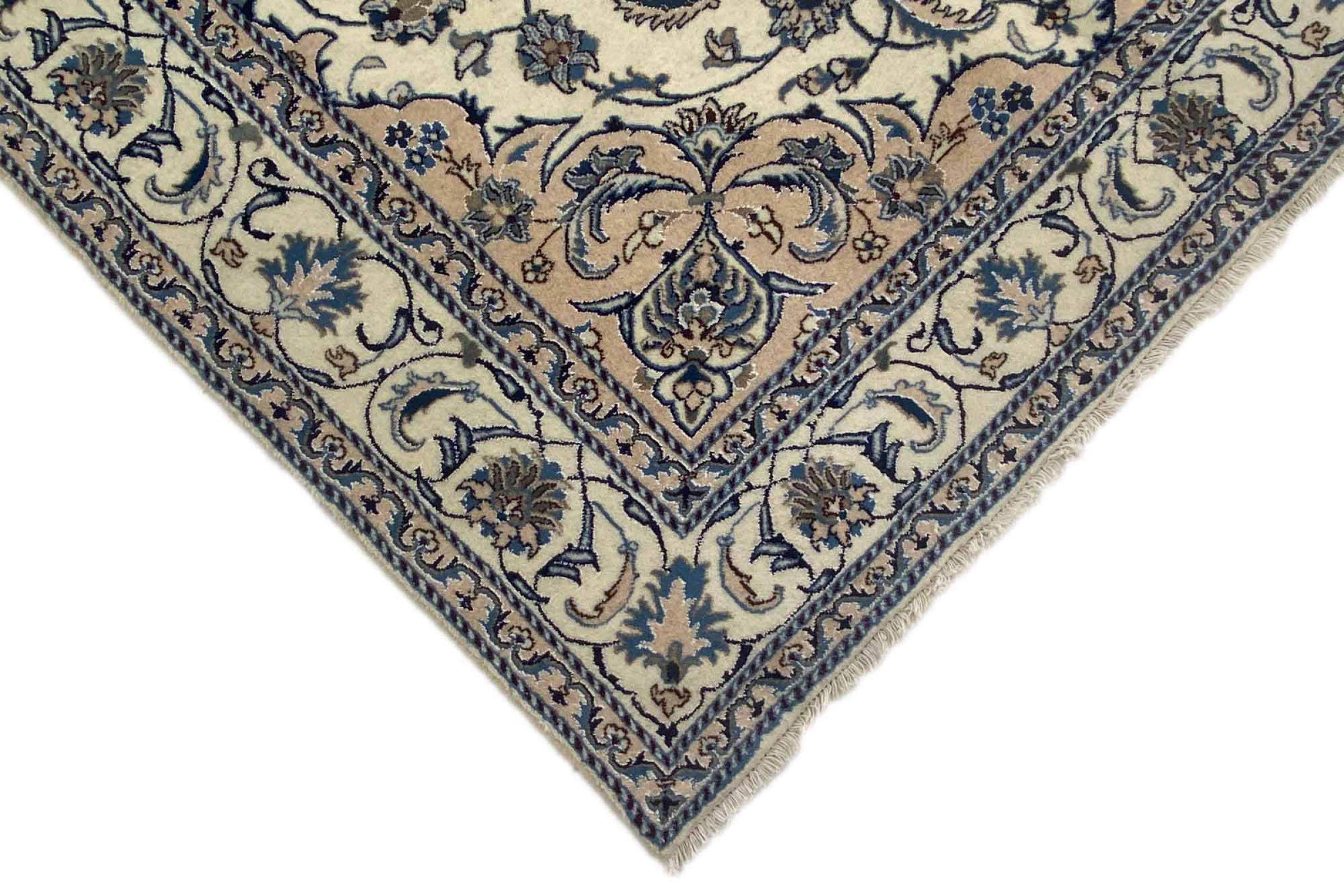 This Nain rug is classified as 12La. Its typical Nain colour scheme gives it an elegant and sophisticated look. This Persian rug was hand-knotted in the city of Nain, which lies on the western edge of the Dasht-e-Kavir desert, using high-quality wool and natural silk. At 12La, it is not as finely detailed with ornamentation as a Nain 9La or 6La.