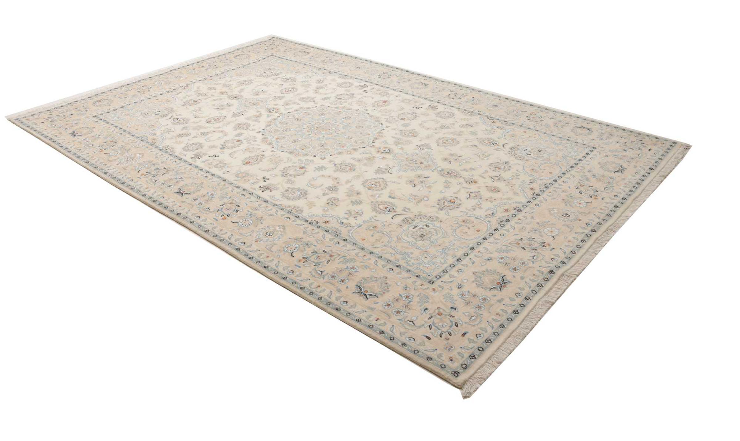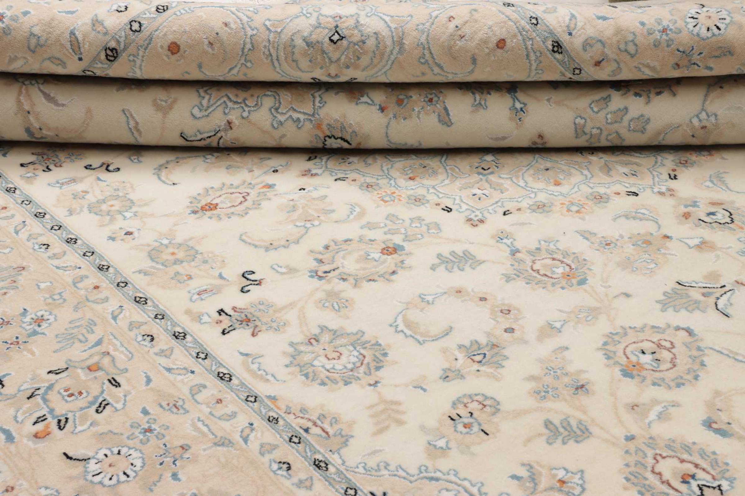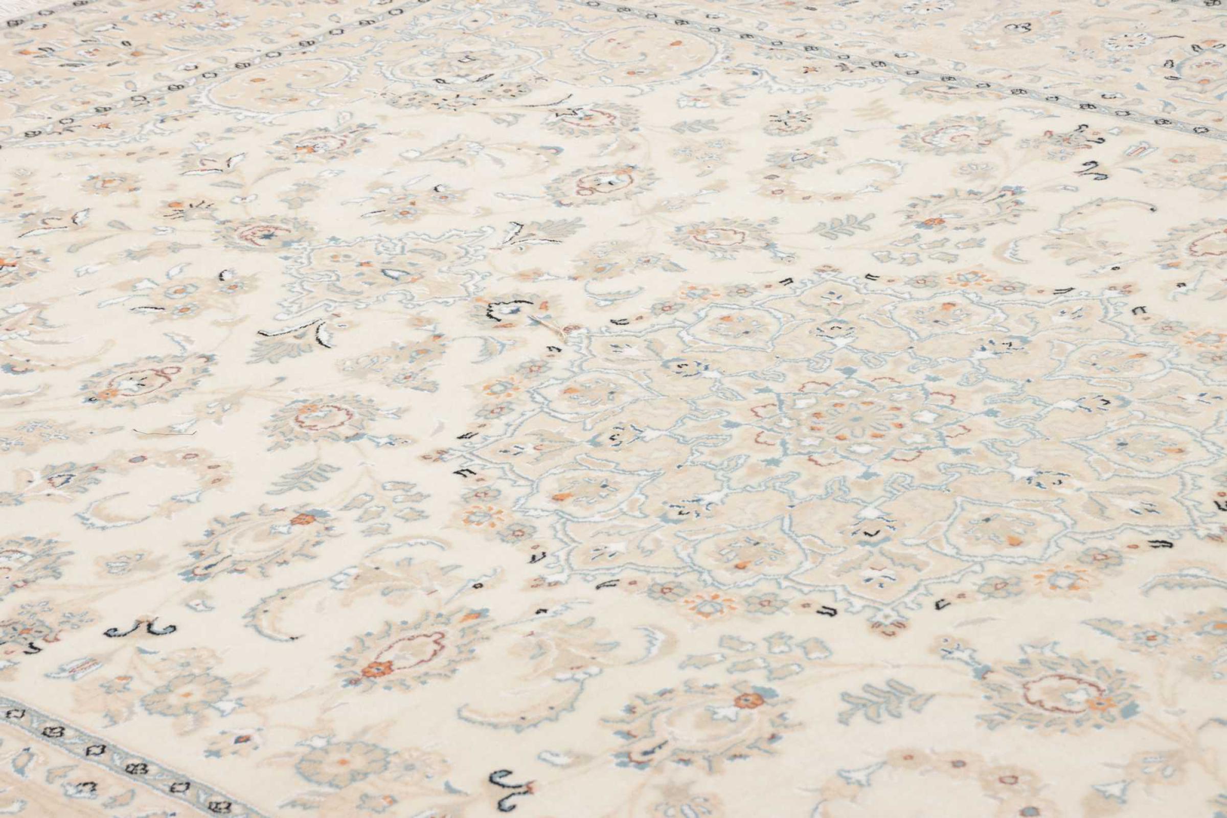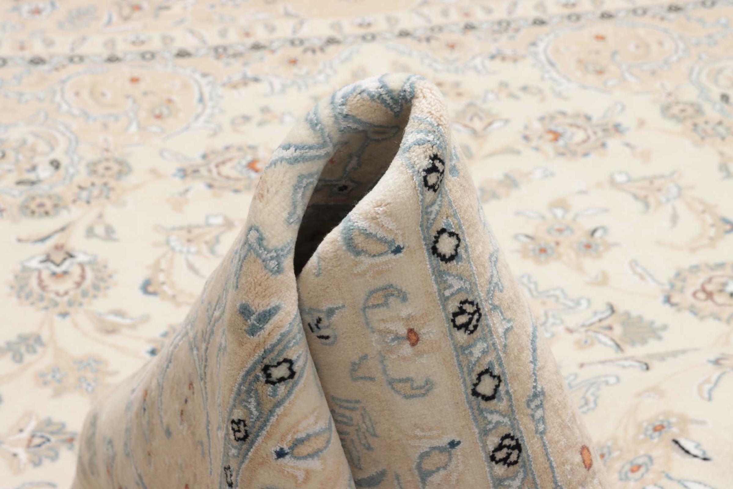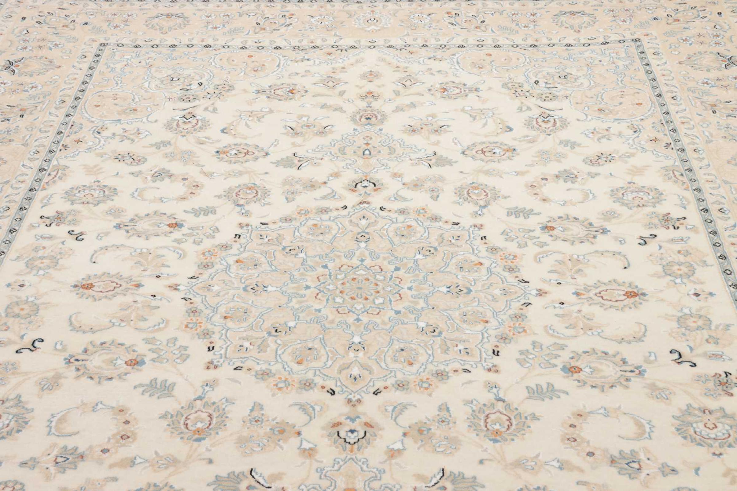 This Nain rug is classified as 9La. The excellent quality, the beautiful oriental design with its curvilinear patterns will delight every buyer. This Persian rug was hand-knotted in the city of Nain, which lies on the western edge of the Dasht-e-Kavir desert, from high-quality wool and natural silk. 9La Nain rugs are significantly finer than a 12La and already show beautiful details.