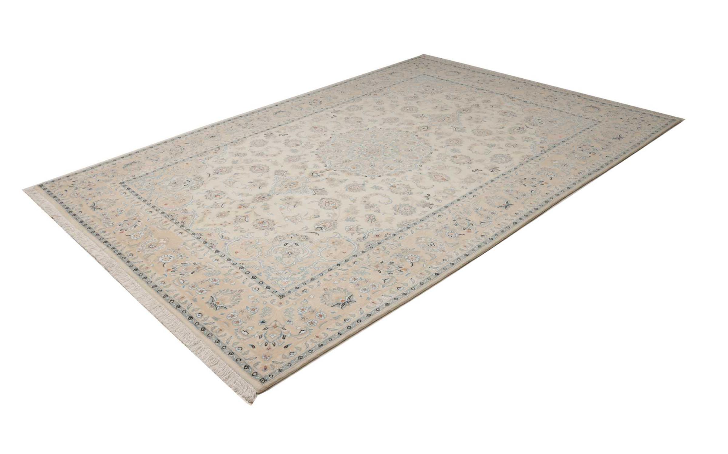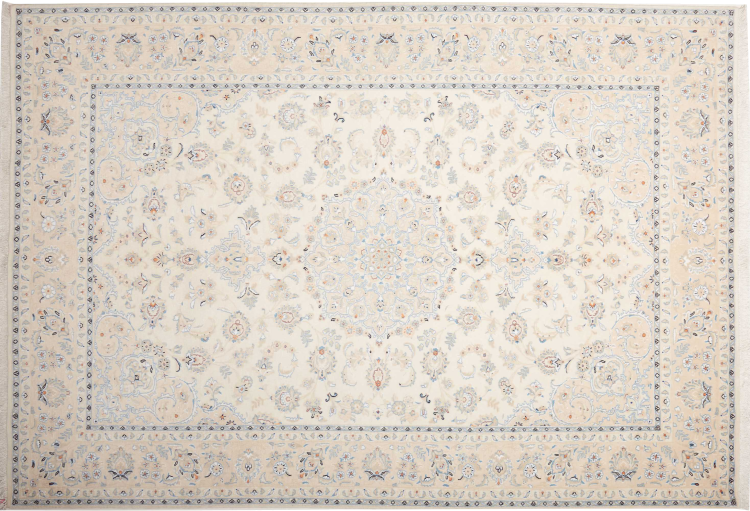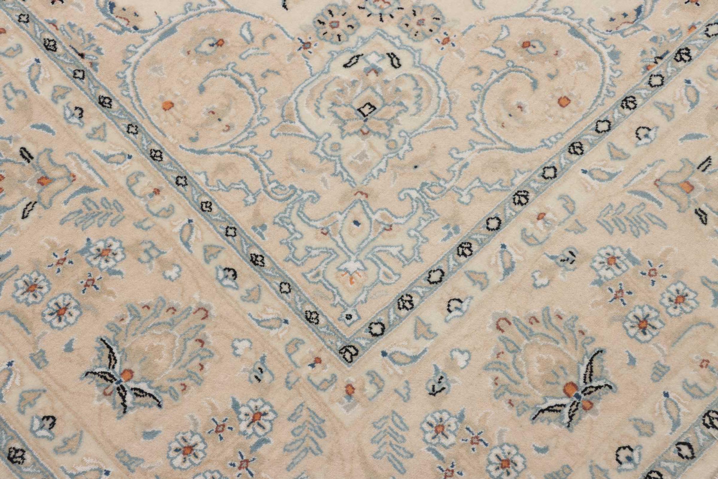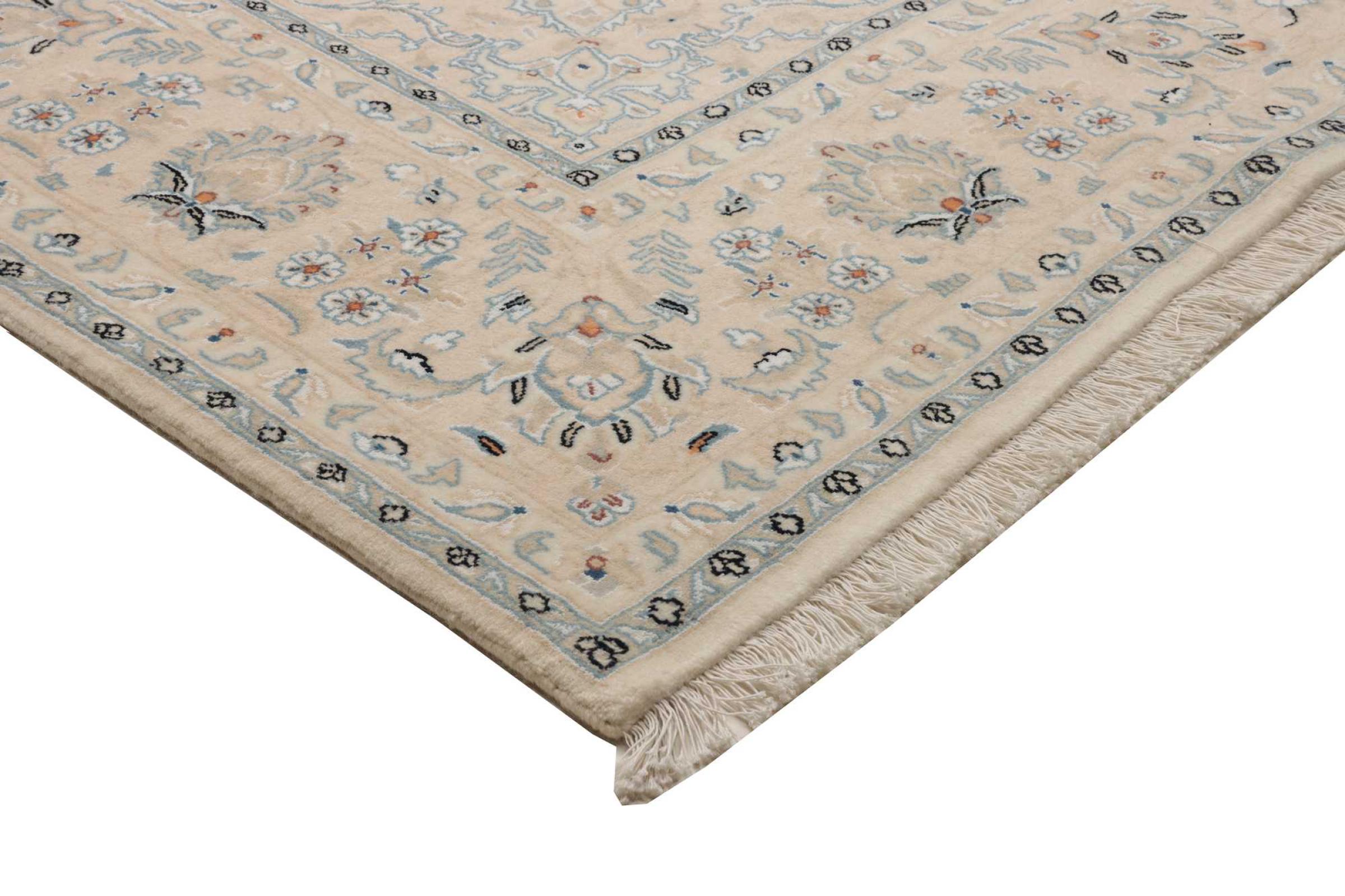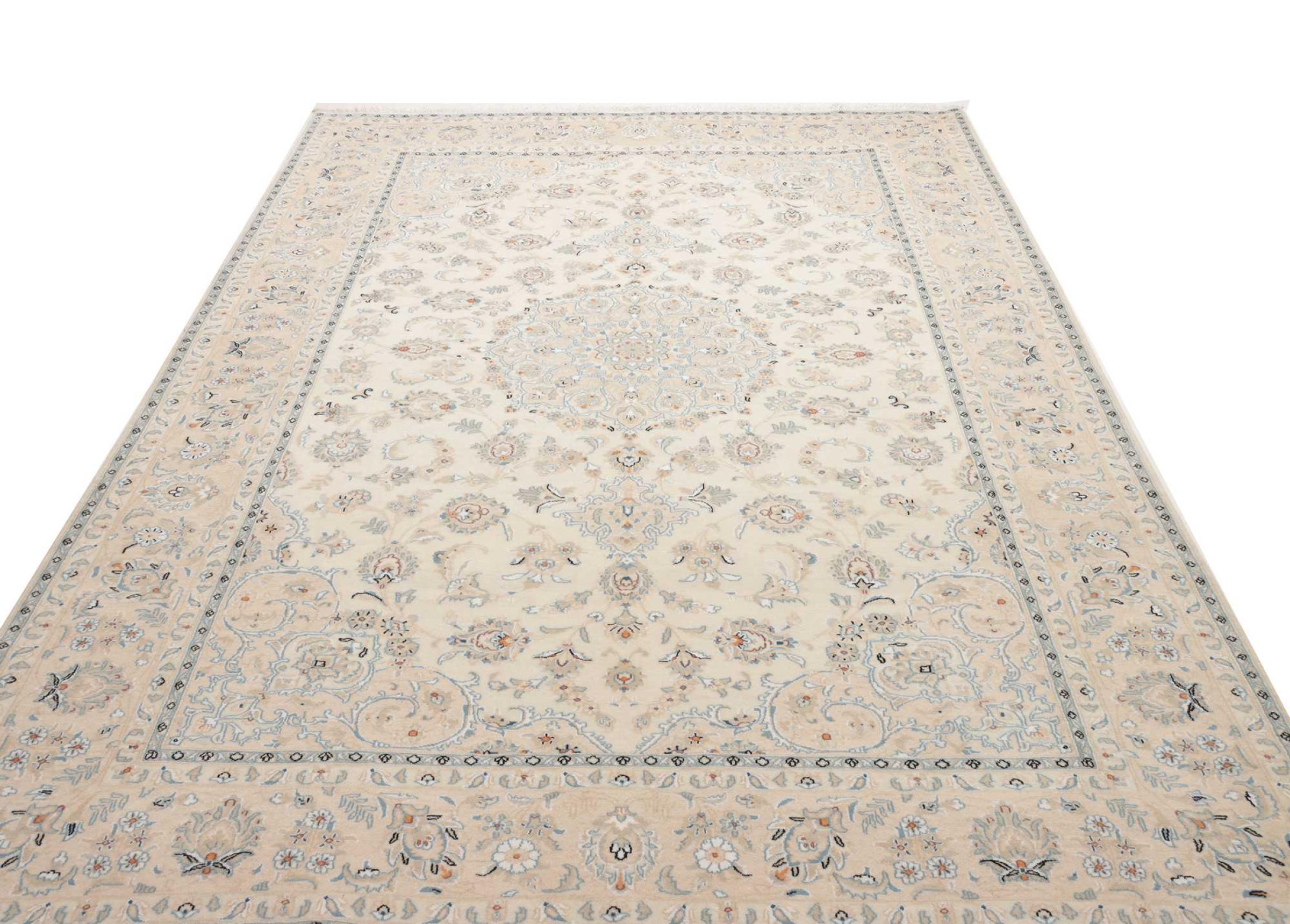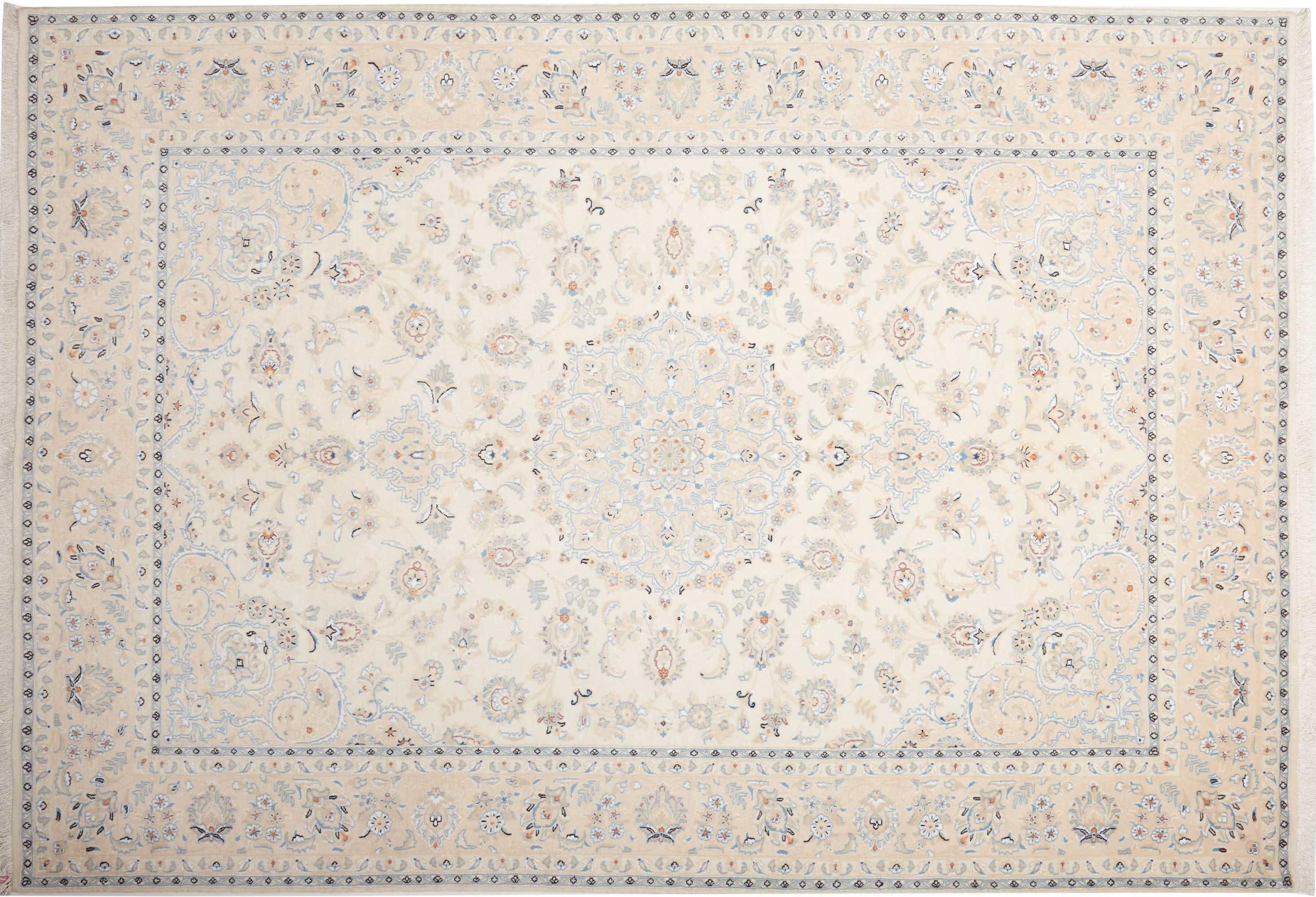 This Nain rug is classified as 9La. The excellent quality, the beautiful oriental design with its curvilinear patterns will delight every buyer. This Persian rug was hand-knotted in the city of Nain, which lies on the western edge of the Dasht-e-Kavir desert, from high-quality wool and natural silk. 9La Nain rugs are significantly finer than a 12La and already show beautiful details.