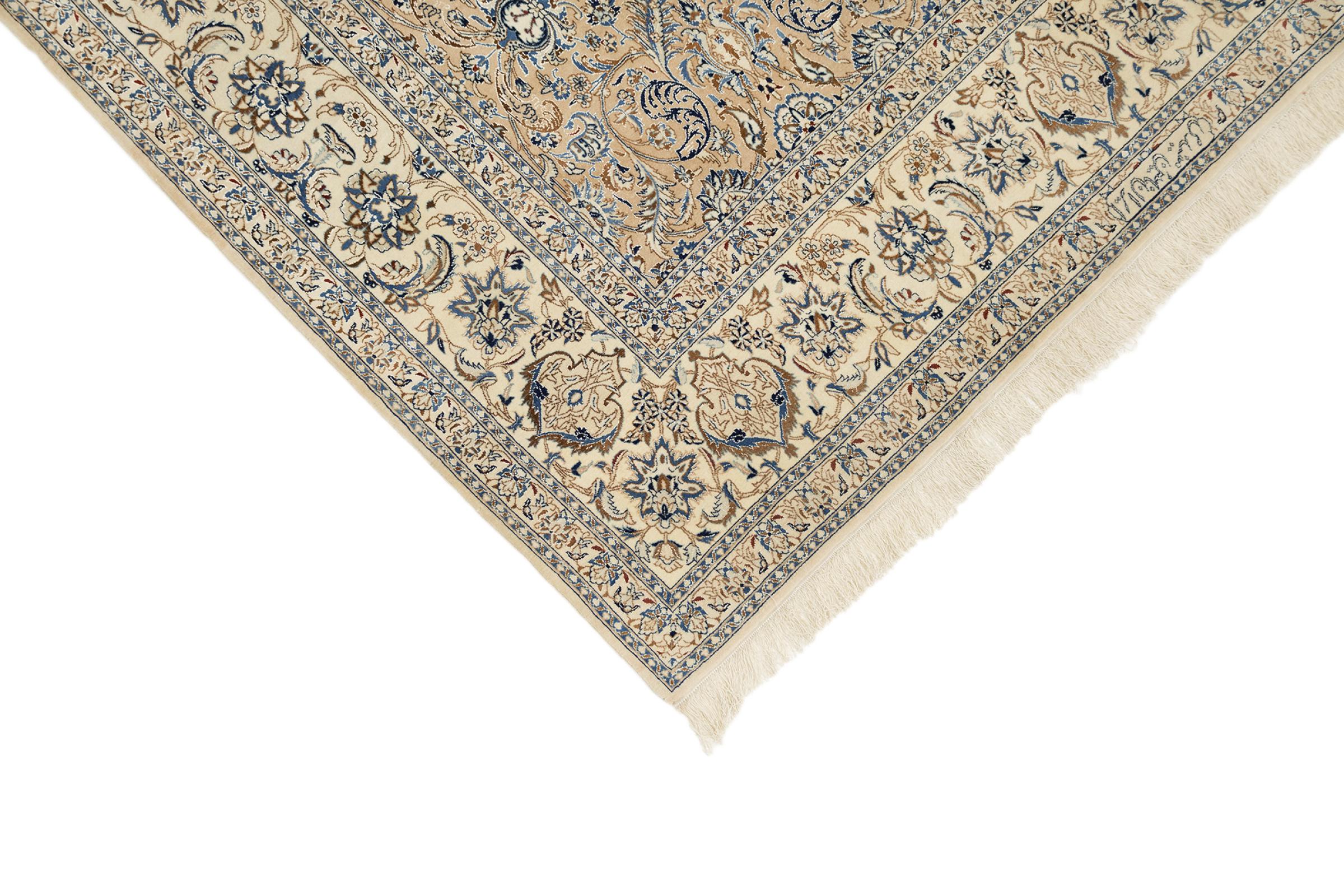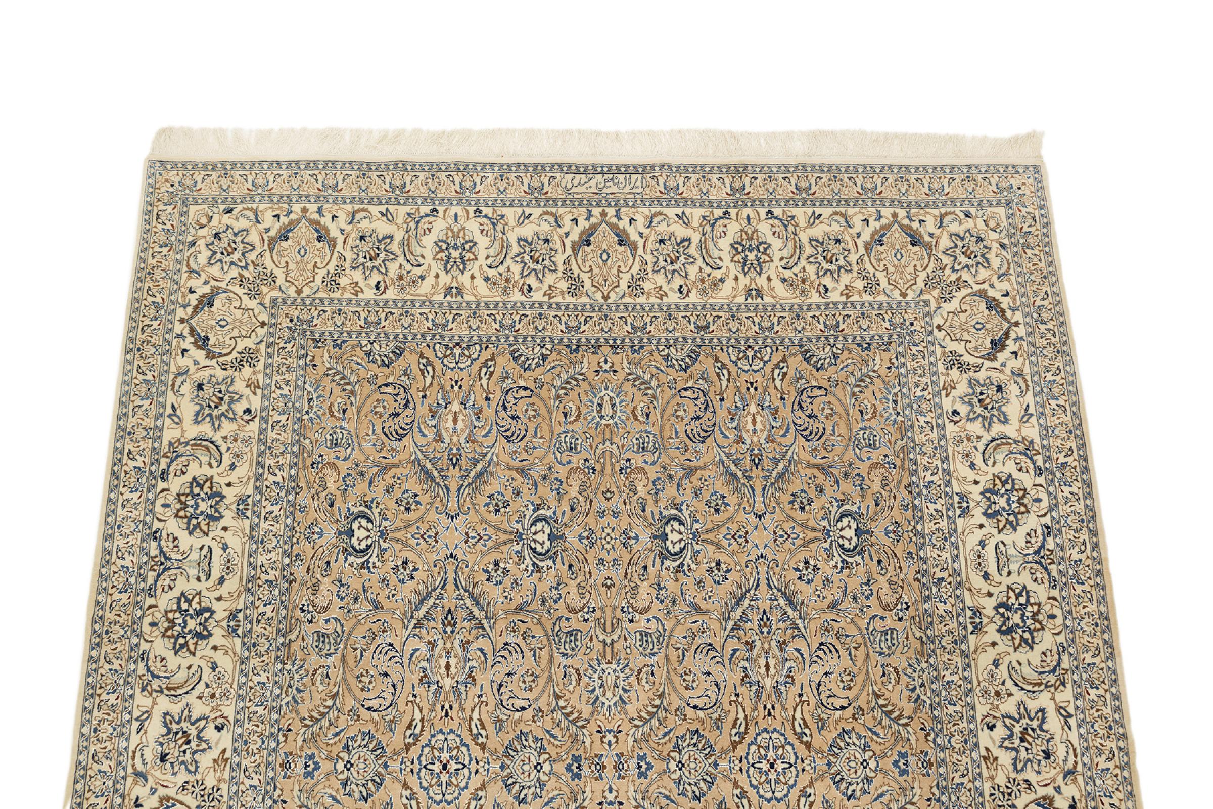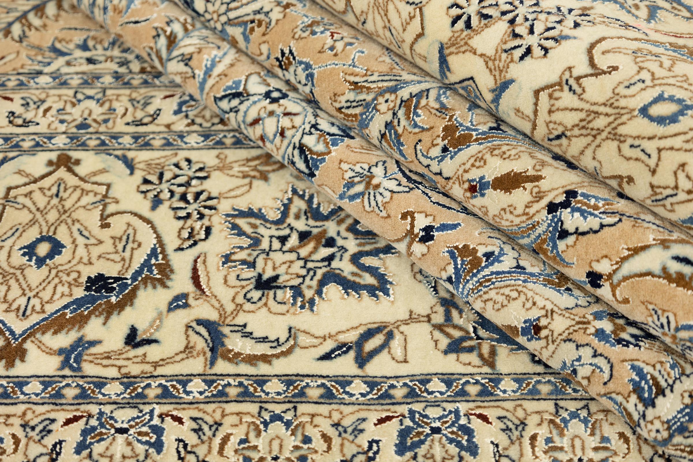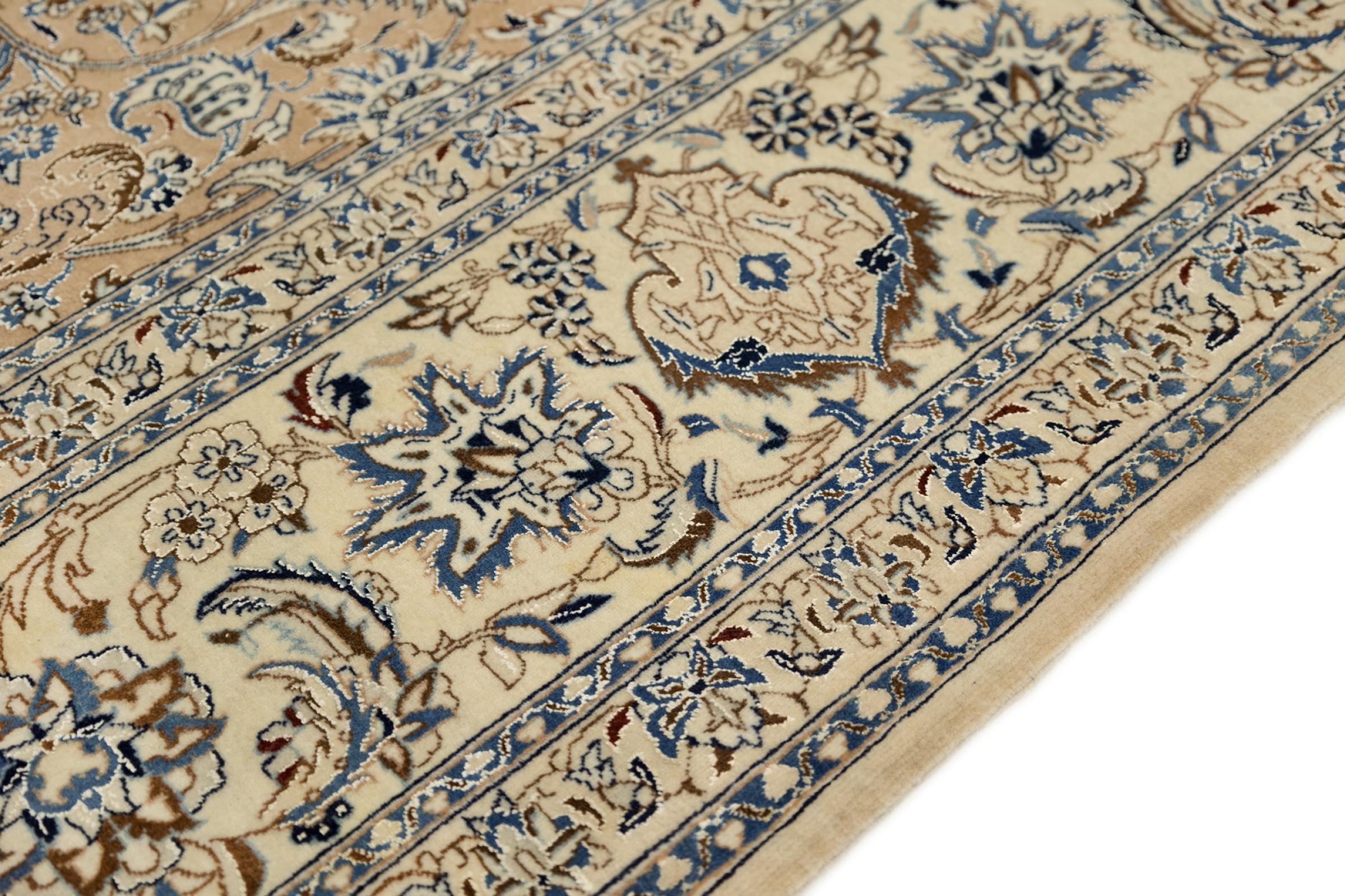 This Nain rug combines quality, tradition and an unmistakable design. It was hand-knotted from high-quality cork wool and natural silk in the desert town of the same name, Nain. Lovers of valuable rugs from Iran will love this Persian rug. With Nain rugs in the 6La and 4La classifications, you have a real work of art with an incredible level of detail that you can really lose yourself in. Nain 4La rugs are almost impossible to find today, as they are extremely elaborate to produce.