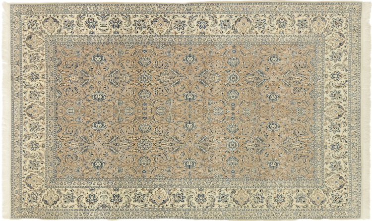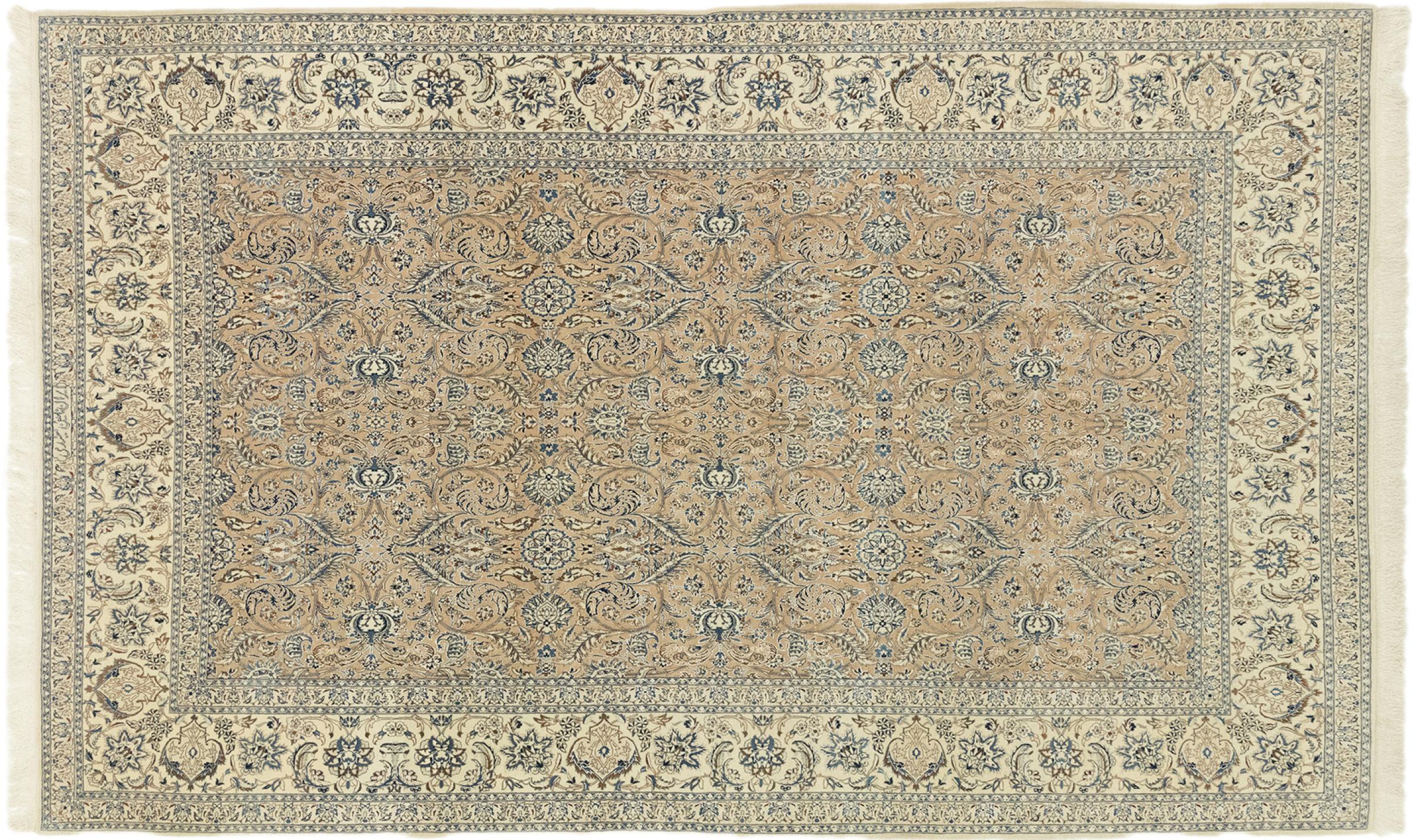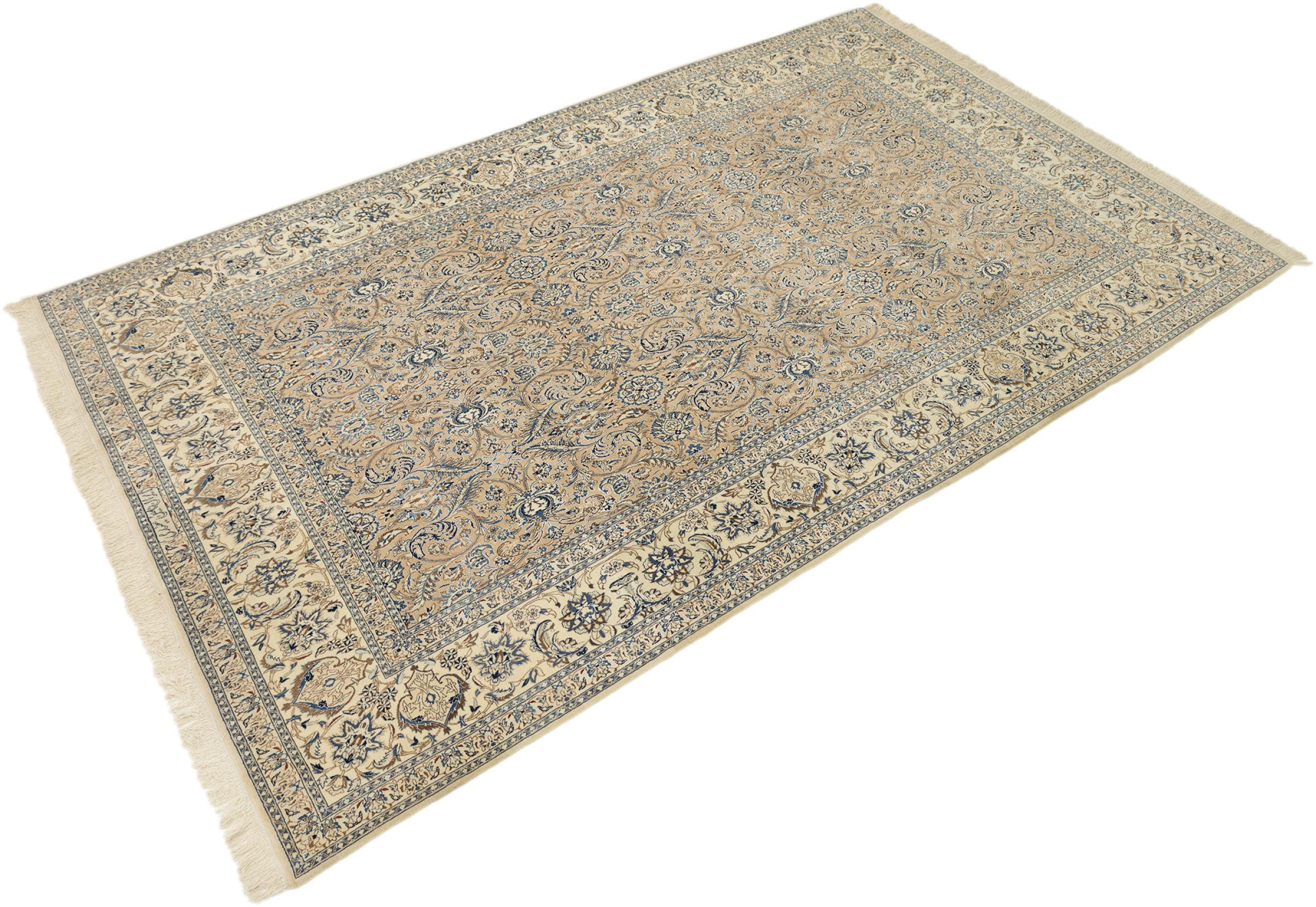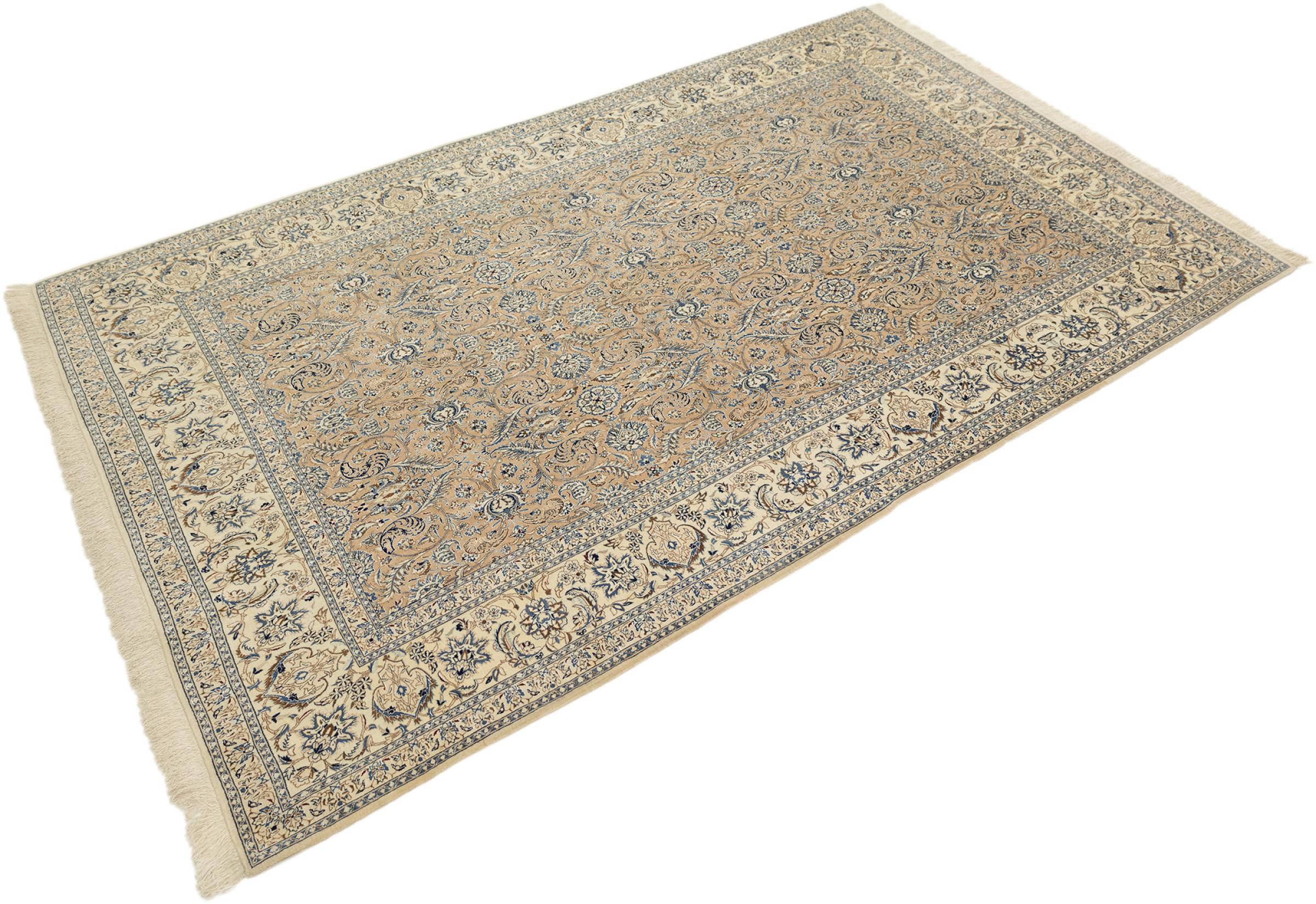 This Nain rug combines quality, tradition and an unmistakable design. It was hand-knotted from high-quality cork wool and natural silk in the desert town of the same name, Nain. Lovers of valuable rugs from Iran will love this Persian rug. With Nain rugs in the 6La and 4La classifications, you have a real work of art with an incredible level of detail that you can really lose yourself in. Nain 4La rugs are almost impossible to find today, as they are extremely elaborate to produce.