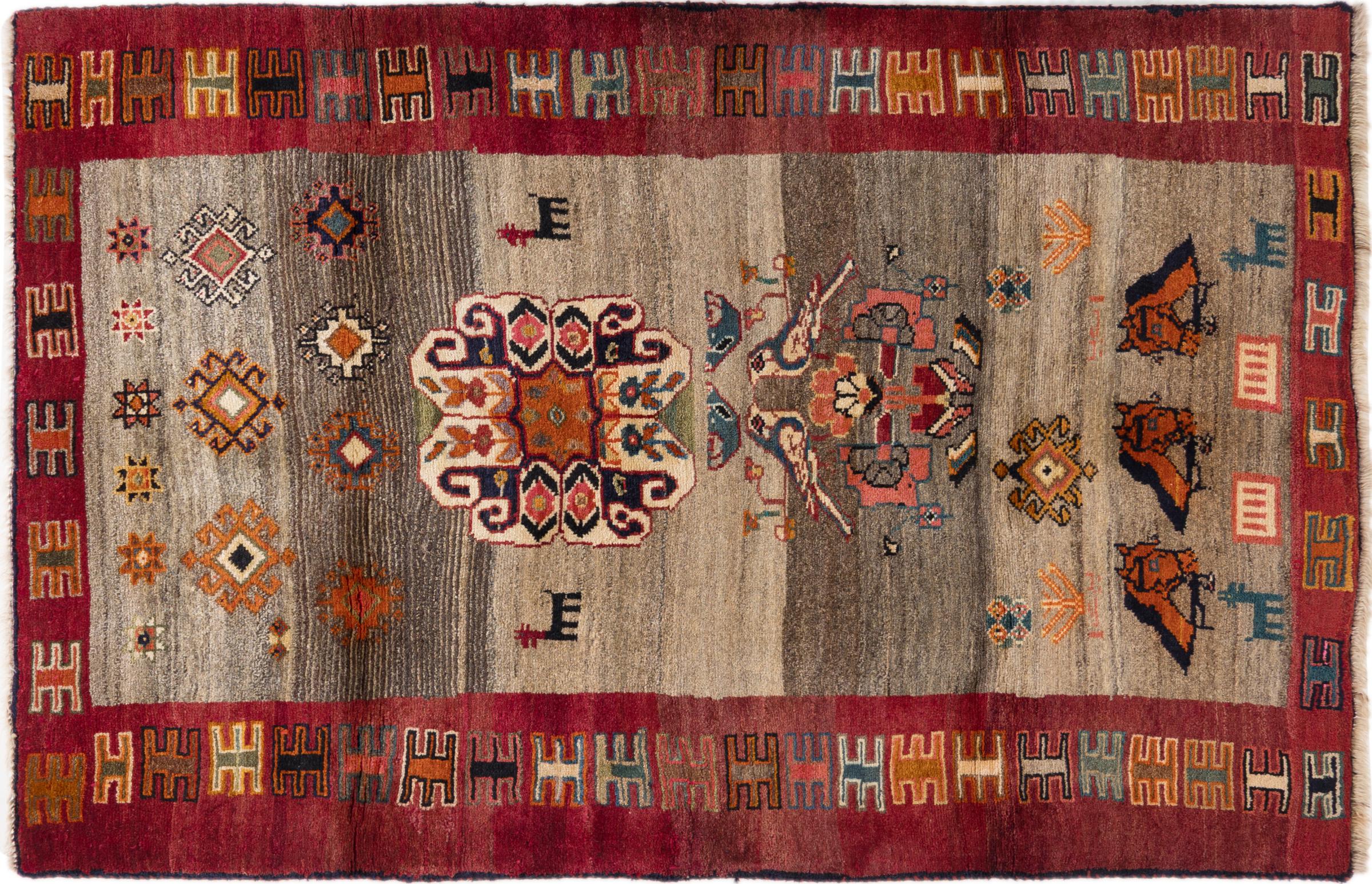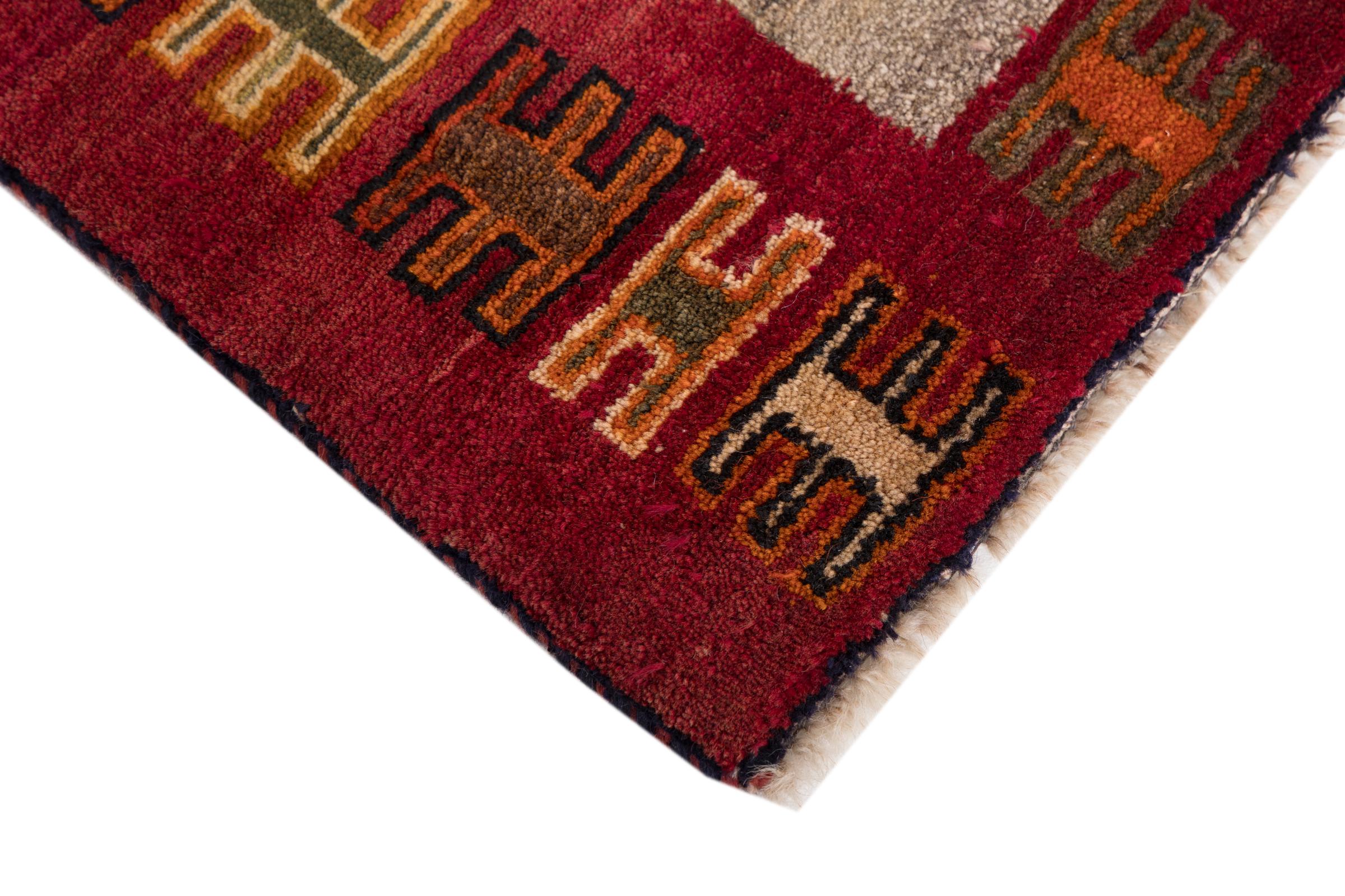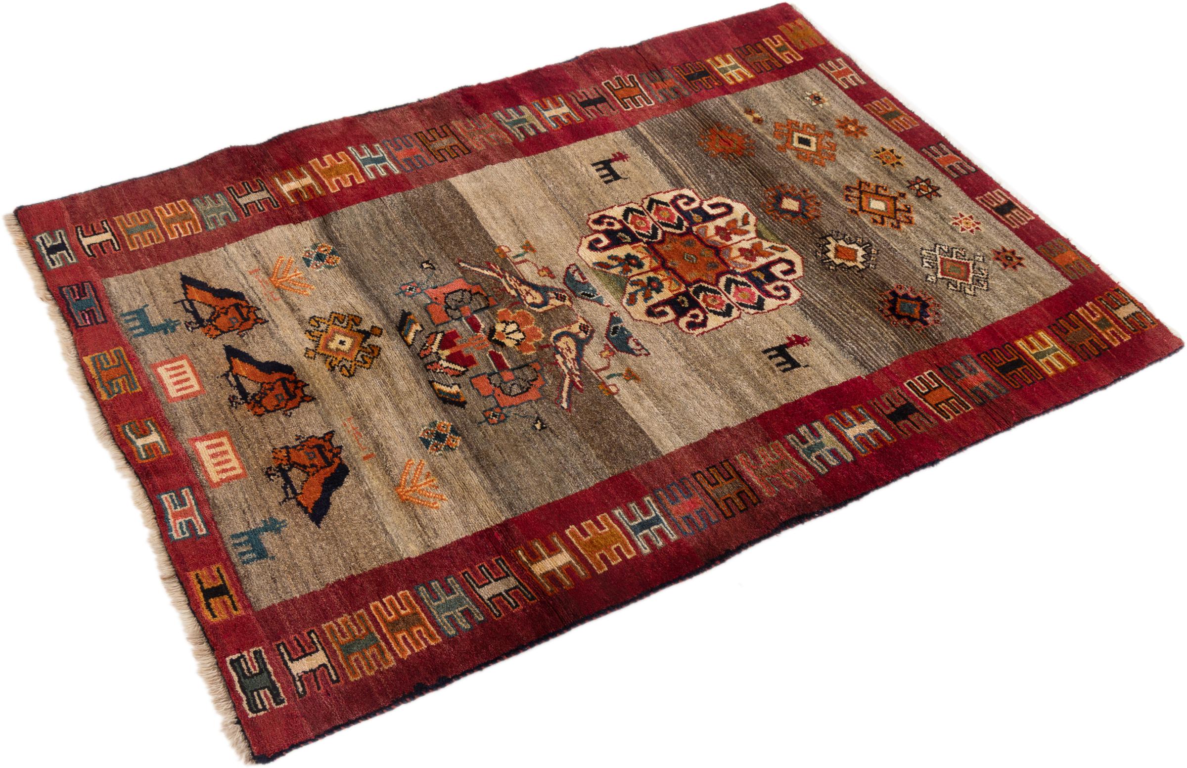 This beautiful rug is a Persian Gabbeh and thus belongs to the highest quality Gabbeh rugs. The rugs are knotted by nomads or semi-nomads in Iran following traditional handicraft. The simple motifs and patterns are mostly inspired by the nomads' close environment. For example camels, trees or bushes can be found on the traditional rugs. Persian Gabbeh rugs are made of wool from locally raised flocks of sheep. The wool is therefore mostly still spun by hand. Thus each of these oriental rugs embodies a unique character of centuries-old culture.