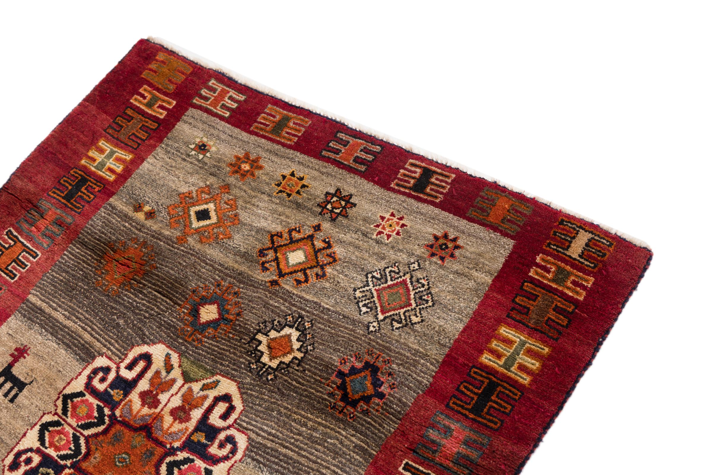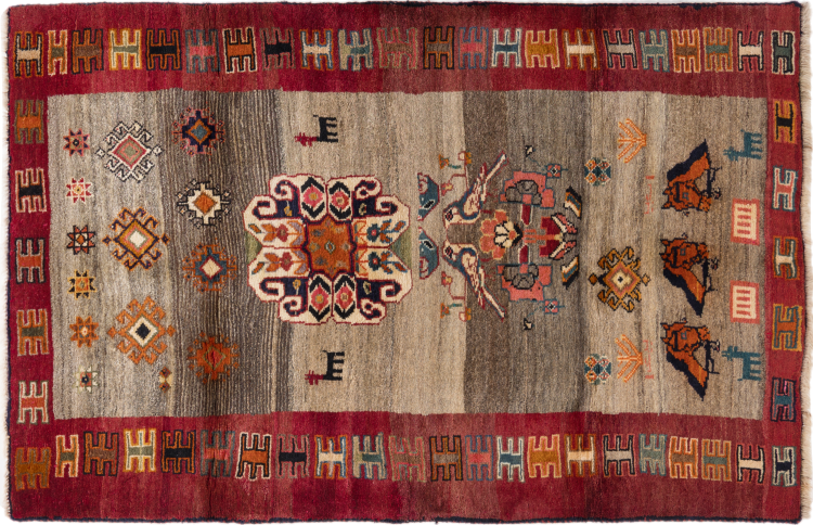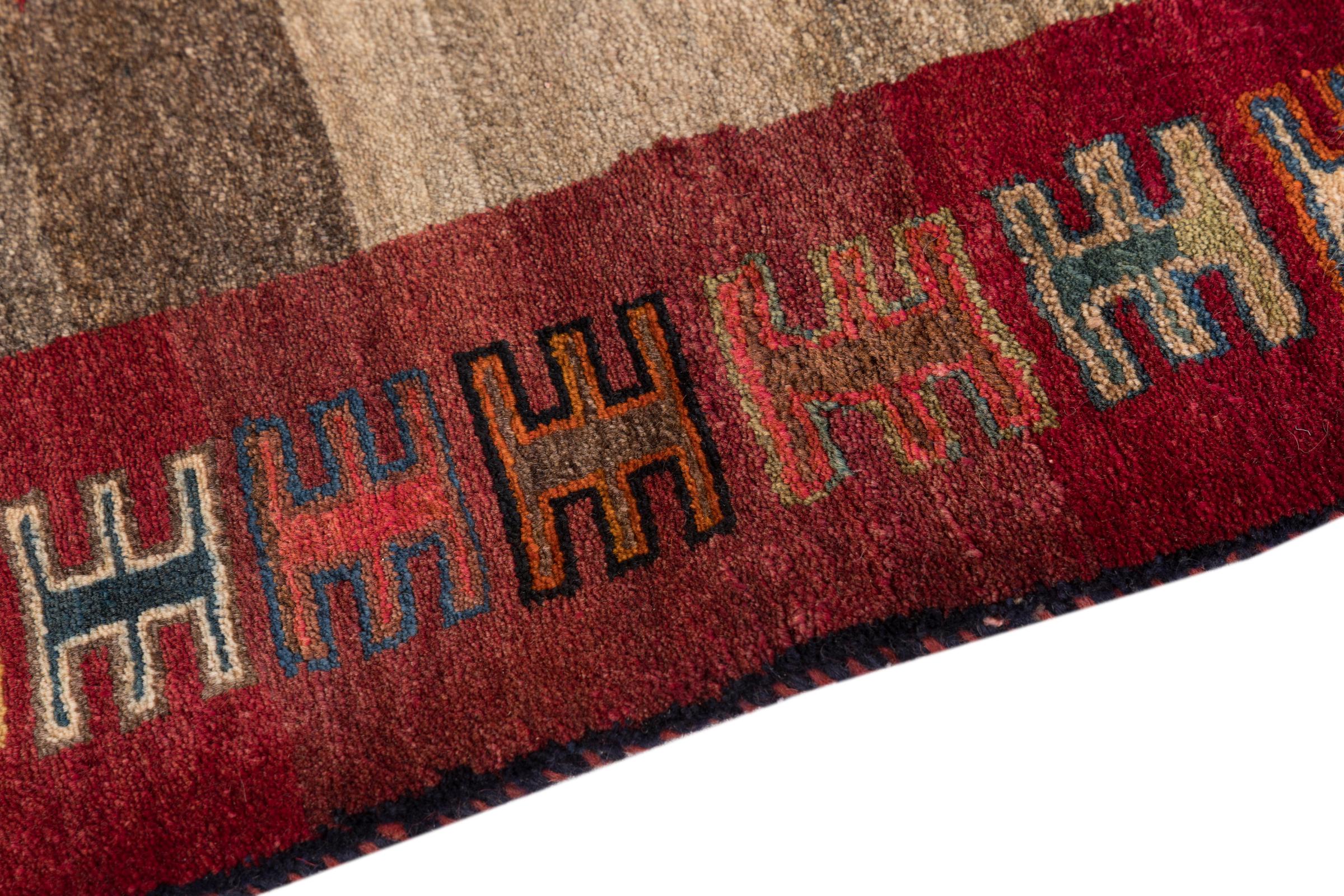 This beautiful rug is a Persian Gabbeh and thus belongs to the highest quality Gabbeh rugs. The rugs are knotted by nomads or semi-nomads in Iran following traditional handicraft. The simple motifs and patterns are mostly inspired by the nomads' close environment. For example camels, trees or bushes can be found on the traditional rugs. Persian Gabbeh rugs are made of wool from locally raised flocks of sheep. The wool is therefore mostly still spun by hand. Thus each of these oriental rugs embodies a unique character of centuries-old culture.