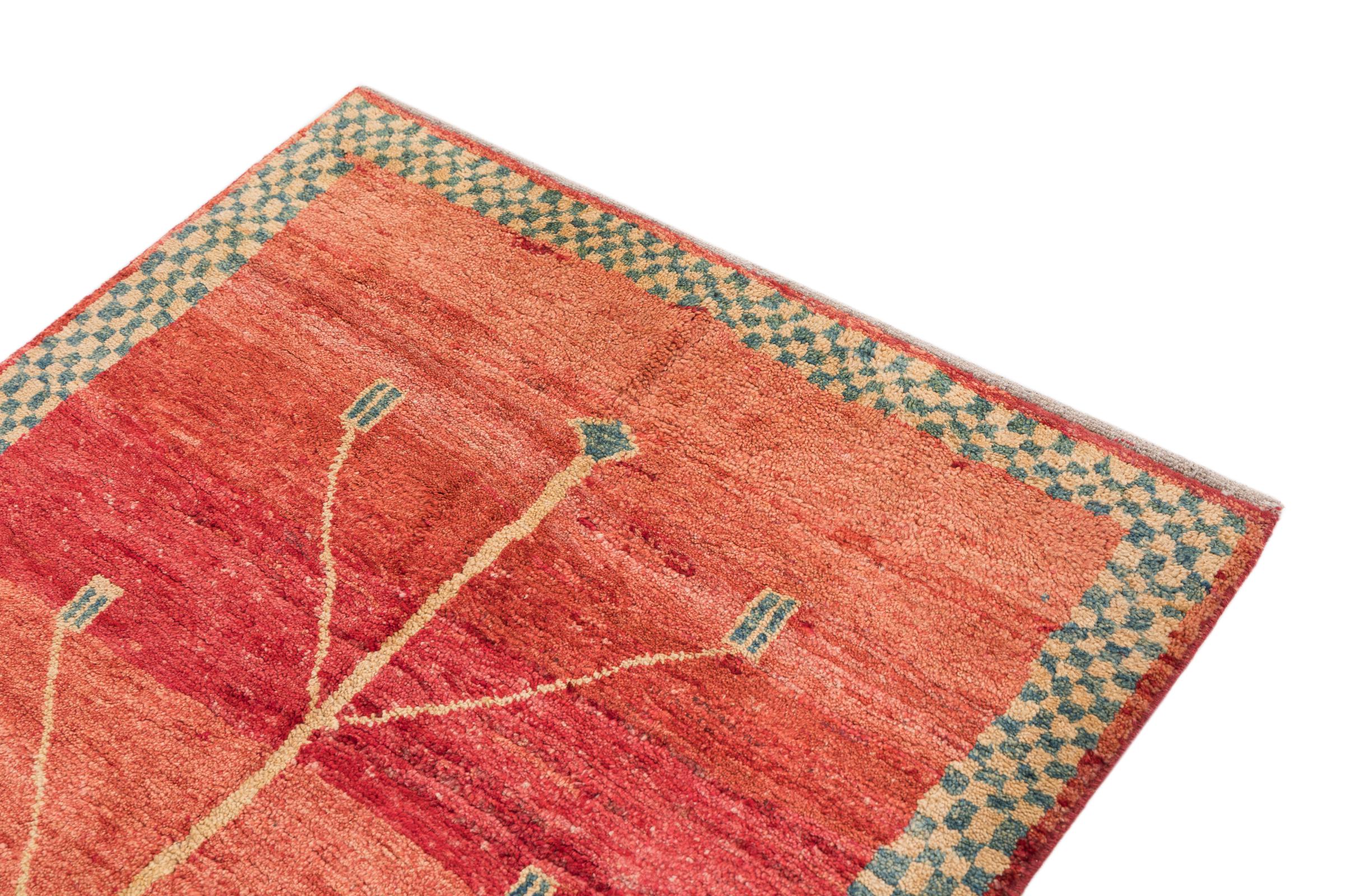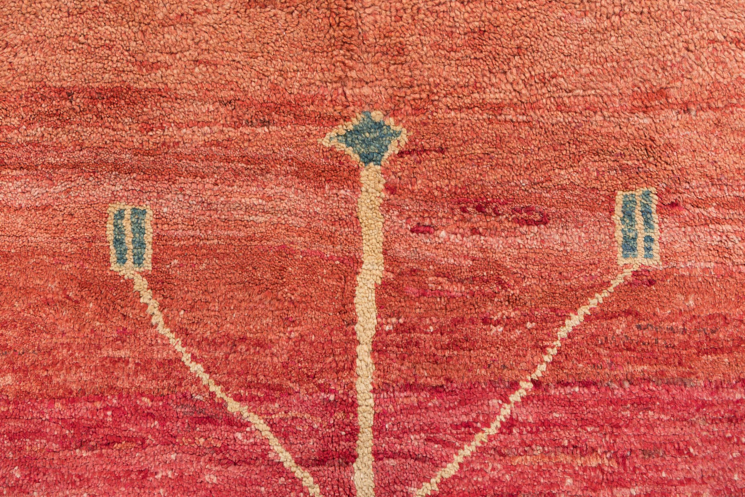 This beautiful rug is a Persian Gabbeh and thus belongs to the highest quality Gabbeh rugs. The rugs are knotted by nomads or semi-nomads in Iran following traditional handicraft. The simple motifs and patterns are mostly inspired by the nomads' close environment. For example camels, trees or bushes can be found on the traditional rugs. Persian Gabbeh rugs are made of wool from locally raised flocks of sheep. The wool is therefore mostly still spun by hand. Thus each of these oriental rugs embodies a unique character of centuries-old culture.