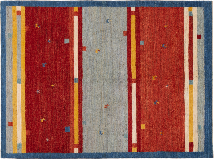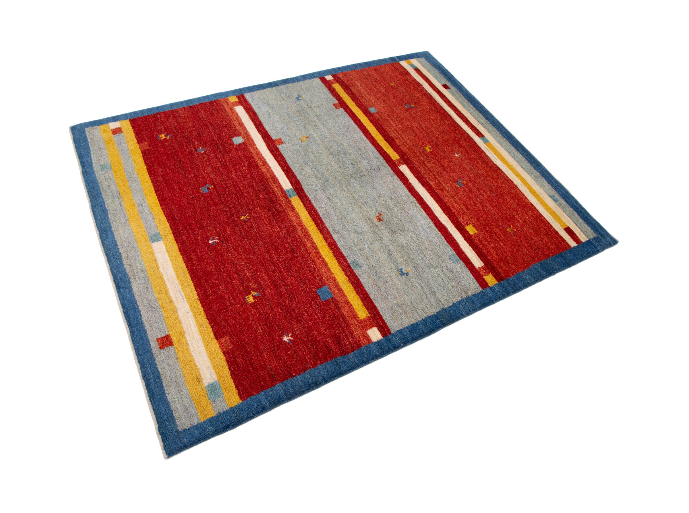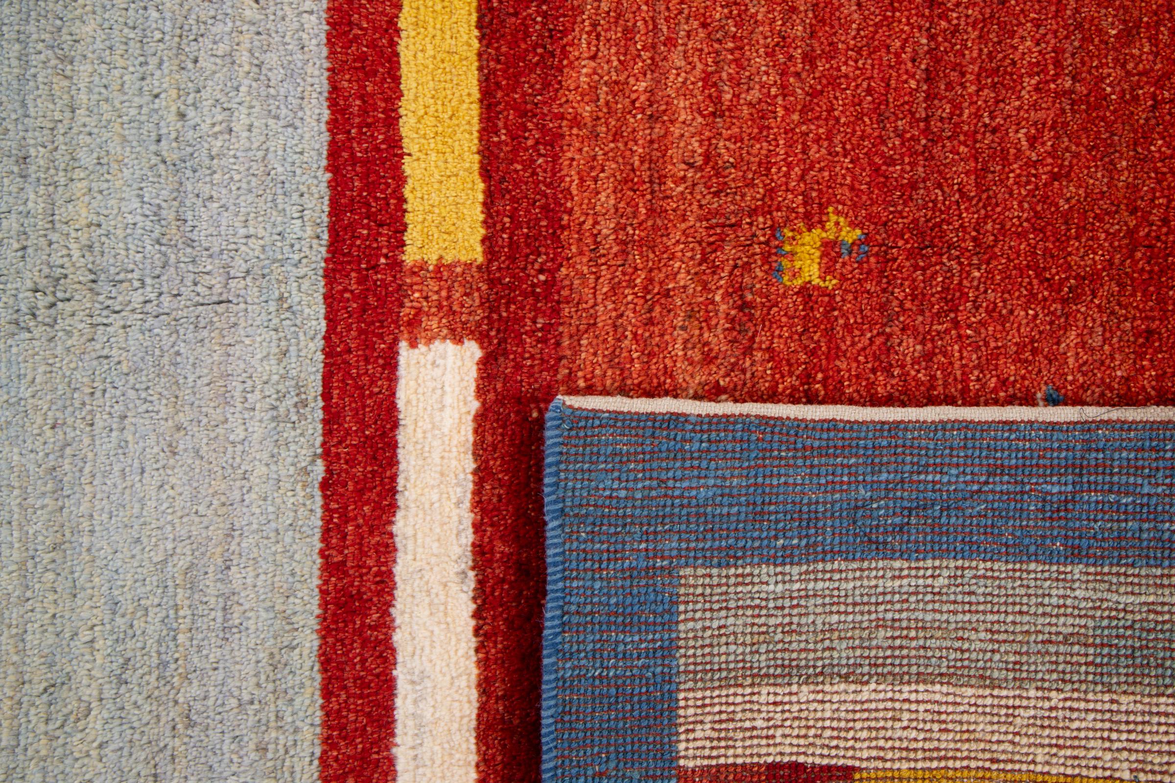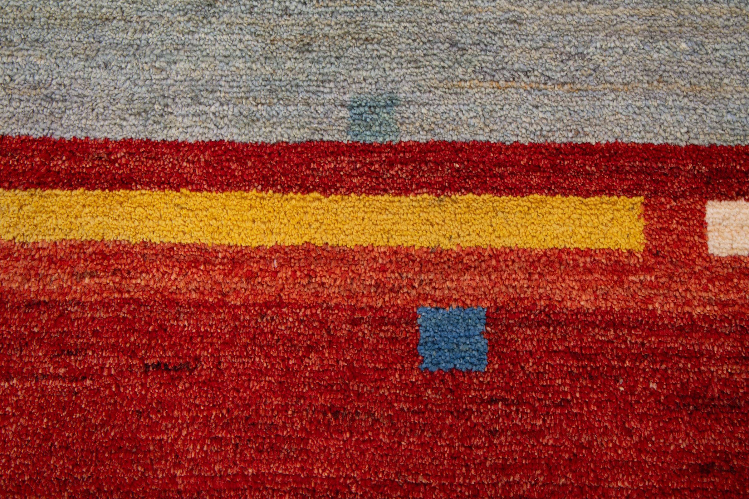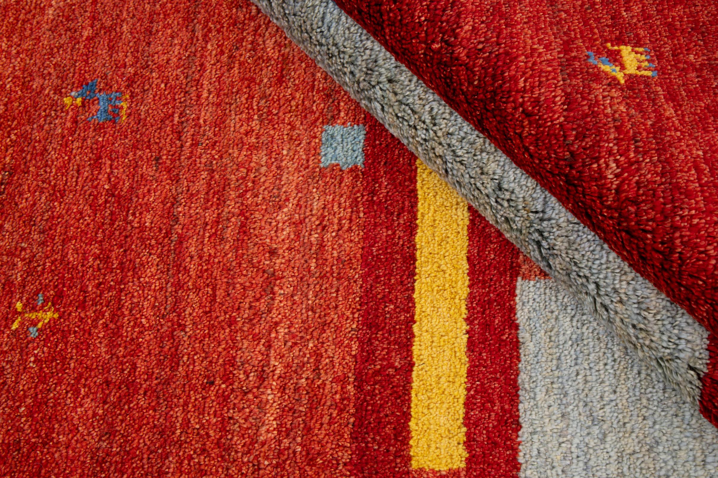 This beautiful rug is a Persian Gabbeh and thus belongs to the highest quality Gabbeh rugs. The rugs are knotted by nomads or semi-nomads in Iran following traditional handicraft. The simple motifs and patterns are mostly inspired by the nomads' close environment. For example camels, trees or bushes can be found on the traditional rugs. Persian Gabbeh rugs are made of wool from locally raised flocks of sheep. The wool is therefore mostly still spun by hand. Thus each of these oriental rugs embodies a unique character of centuries-old culture.
