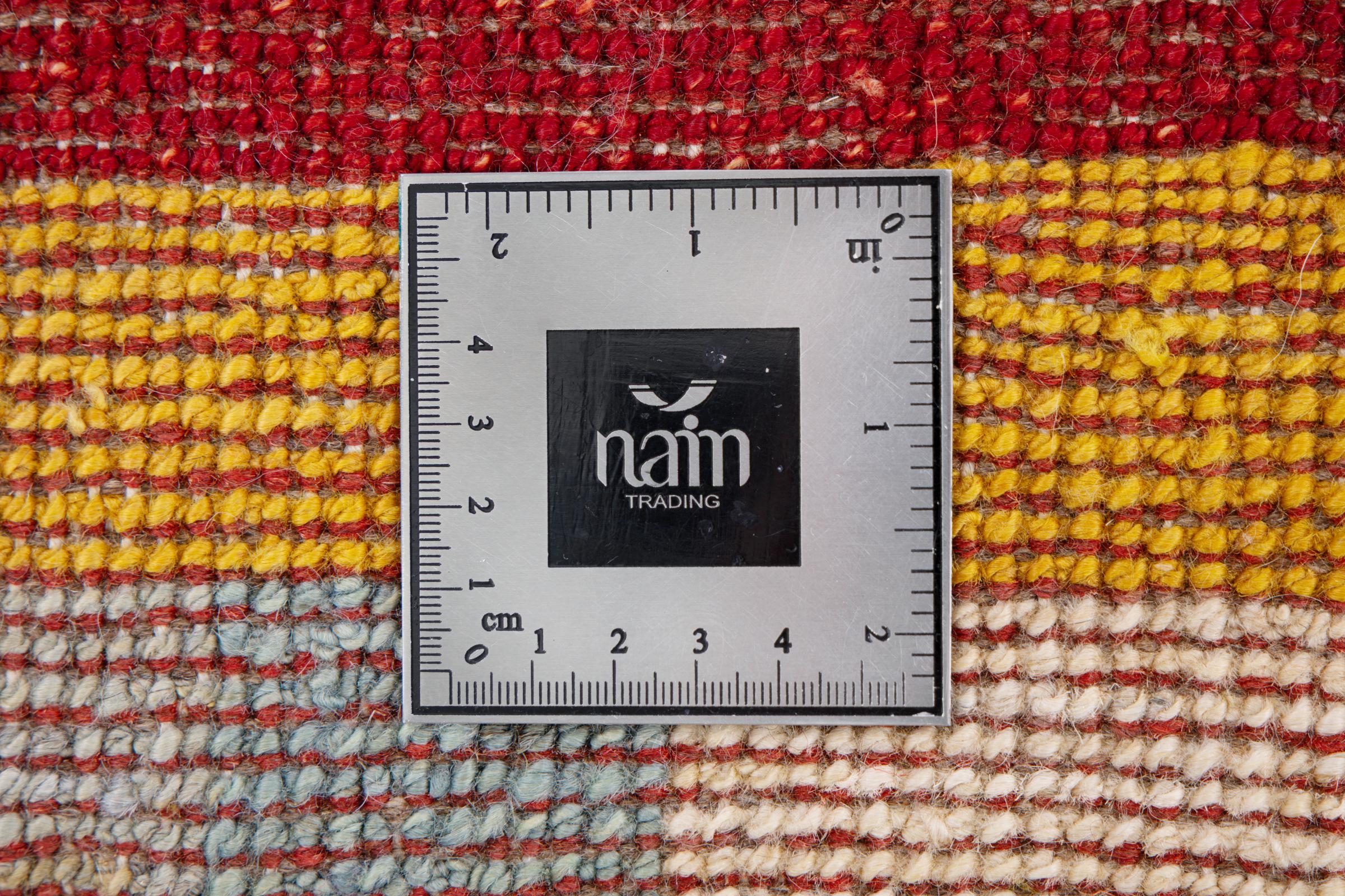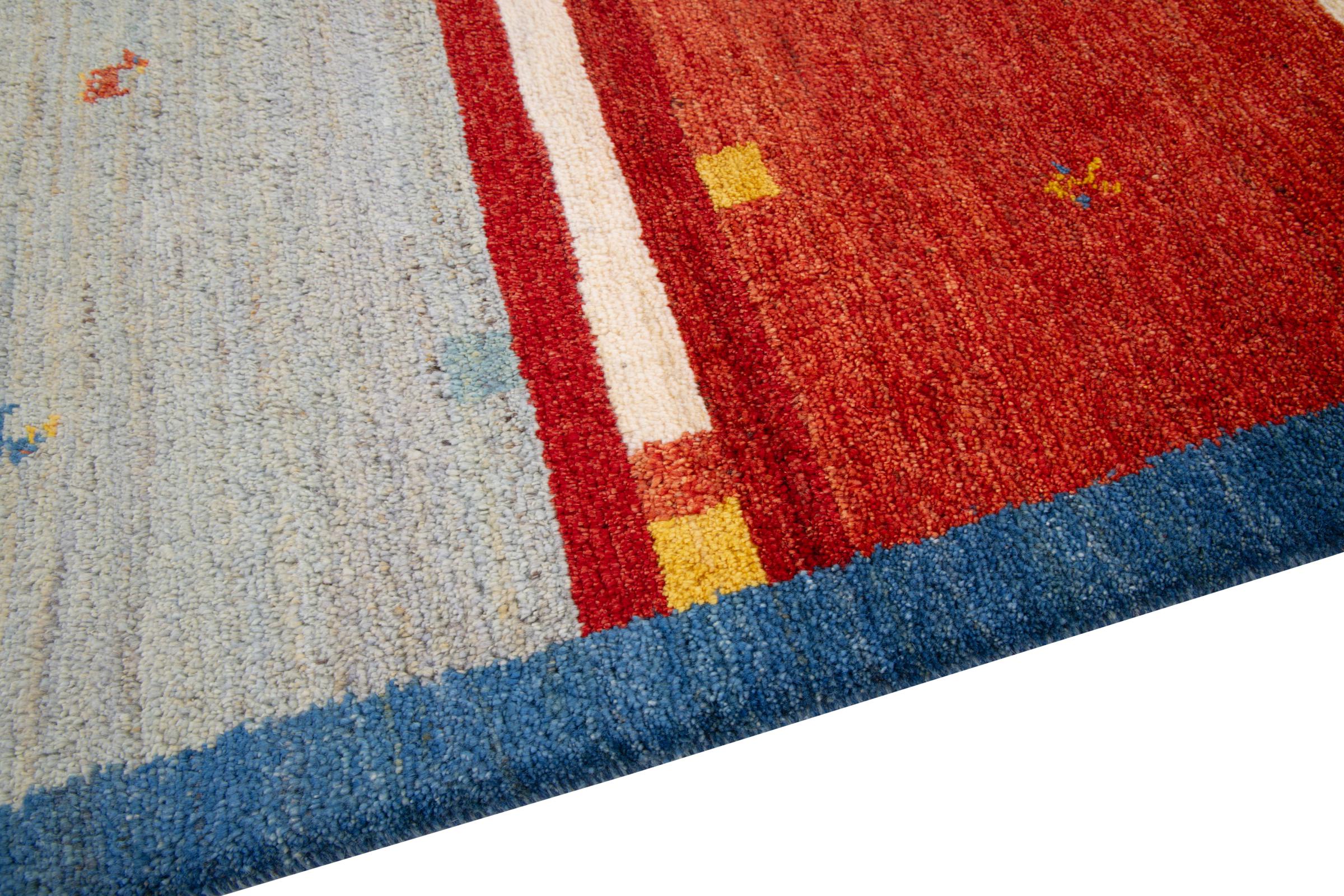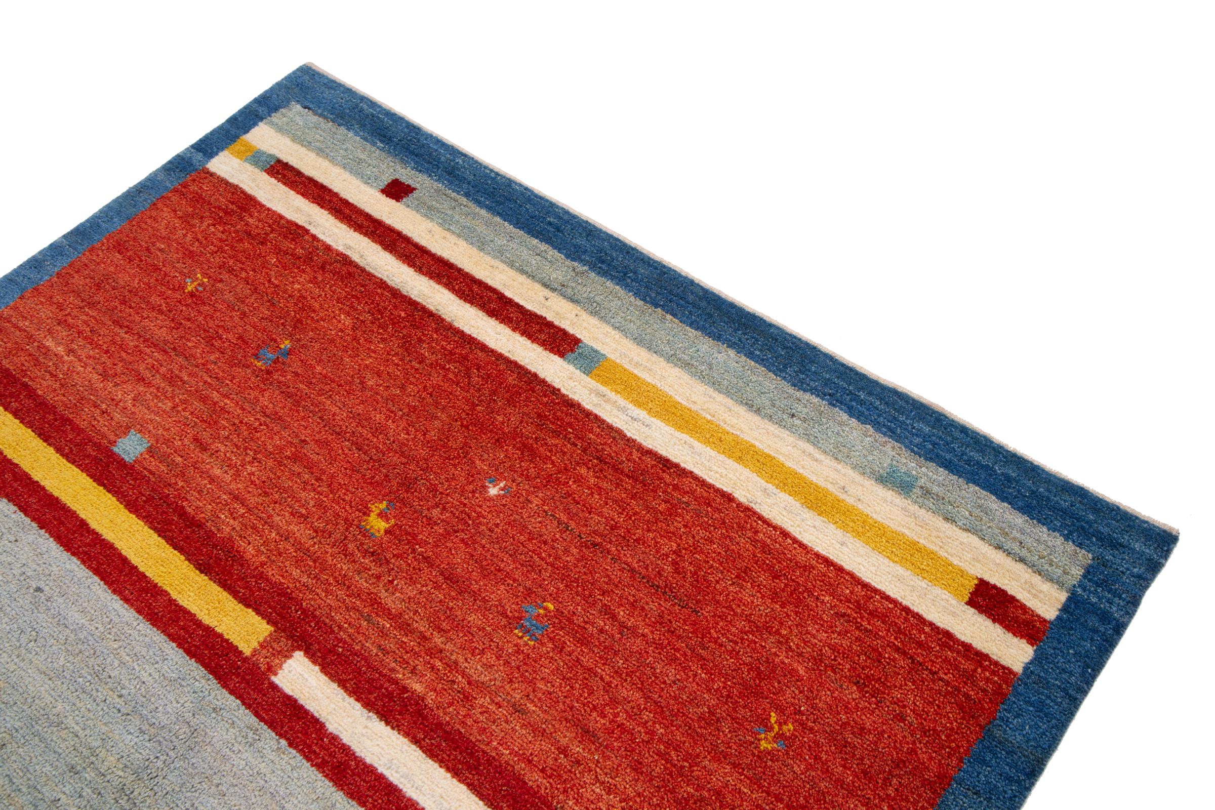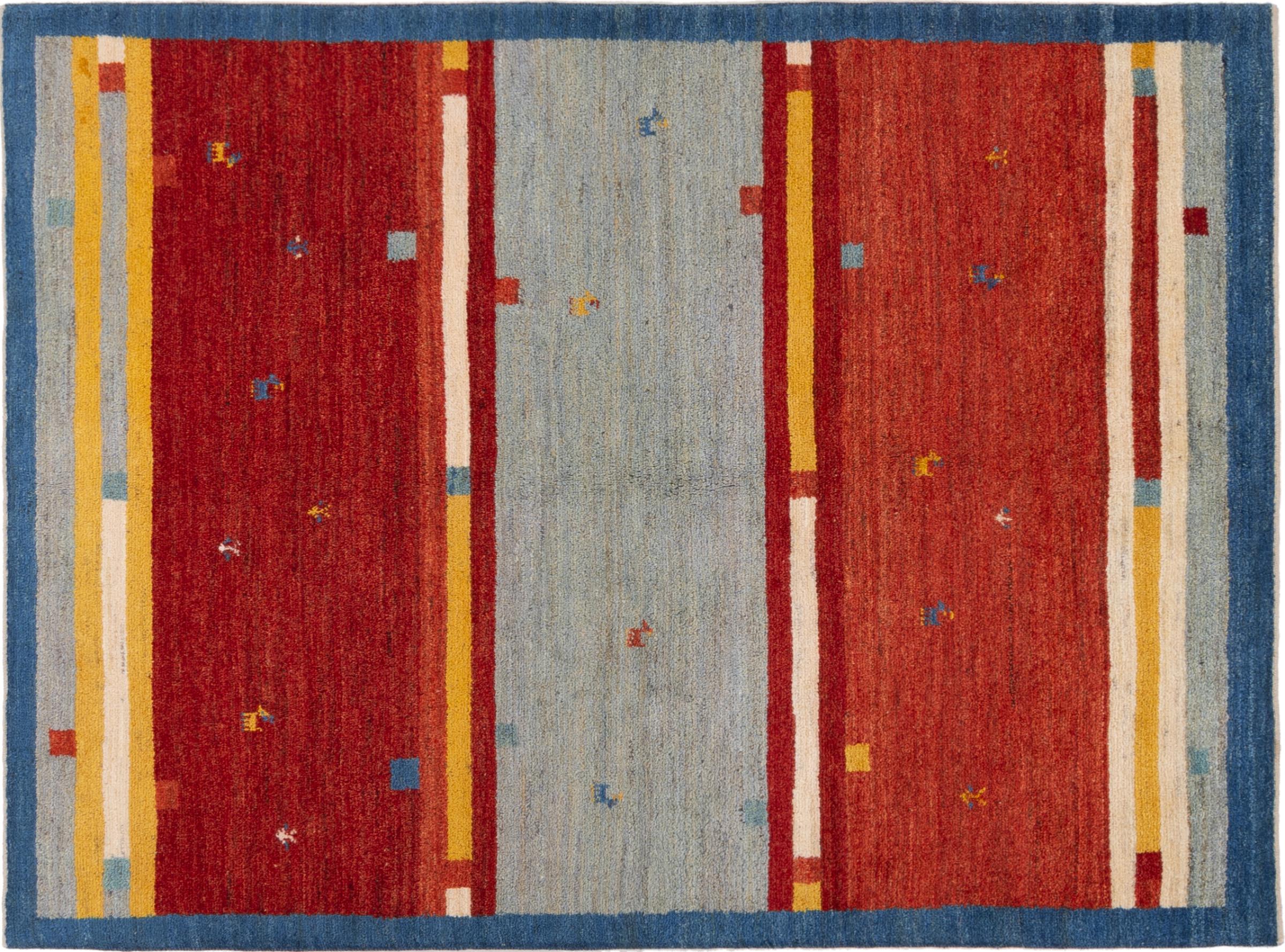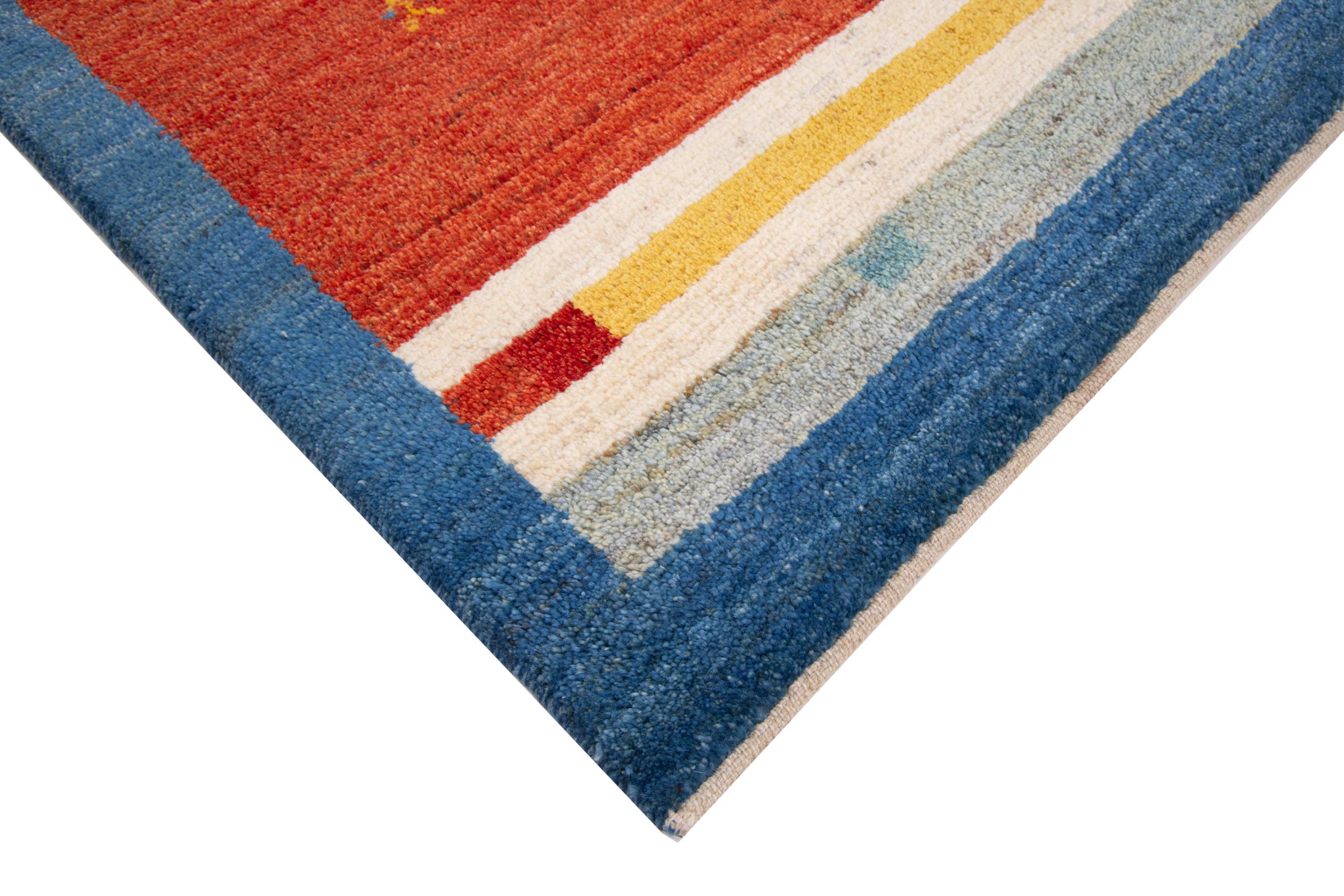This beautiful rug is a Persian Gabbeh and thus belongs to the highest quality Gabbeh rugs. The rugs are knotted by nomads or semi-nomads in Iran following traditional handicraft. The simple motifs and patterns are mostly inspired by the nomads' close environment. For example camels, trees or bushes can be found on the traditional rugs. Persian Gabbeh rugs are made of wool from locally raised flocks of sheep. The wool is therefore mostly still spun by hand. Thus each of these oriental rugs embodies a unique character of centuries-old culture.