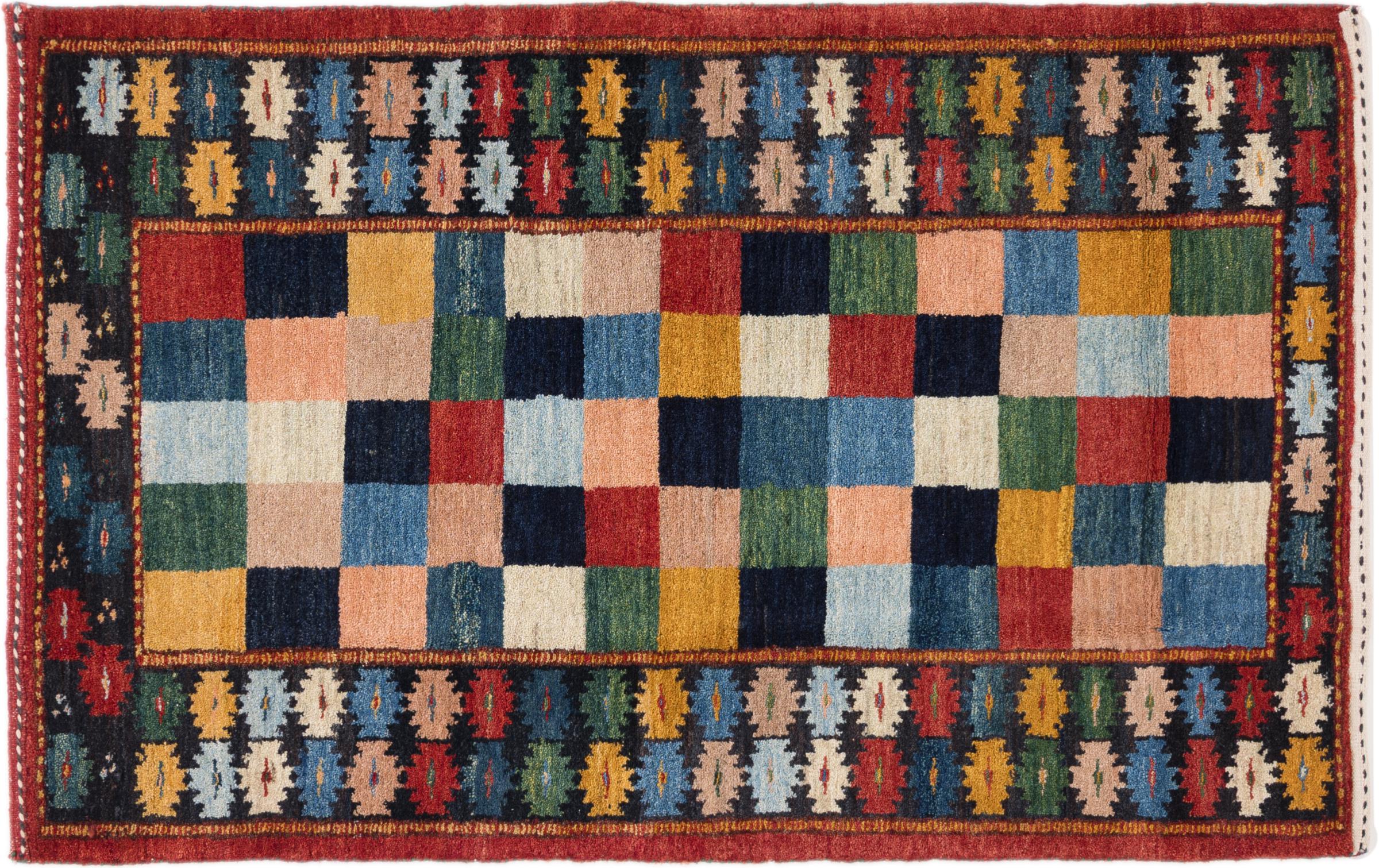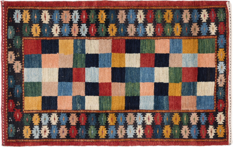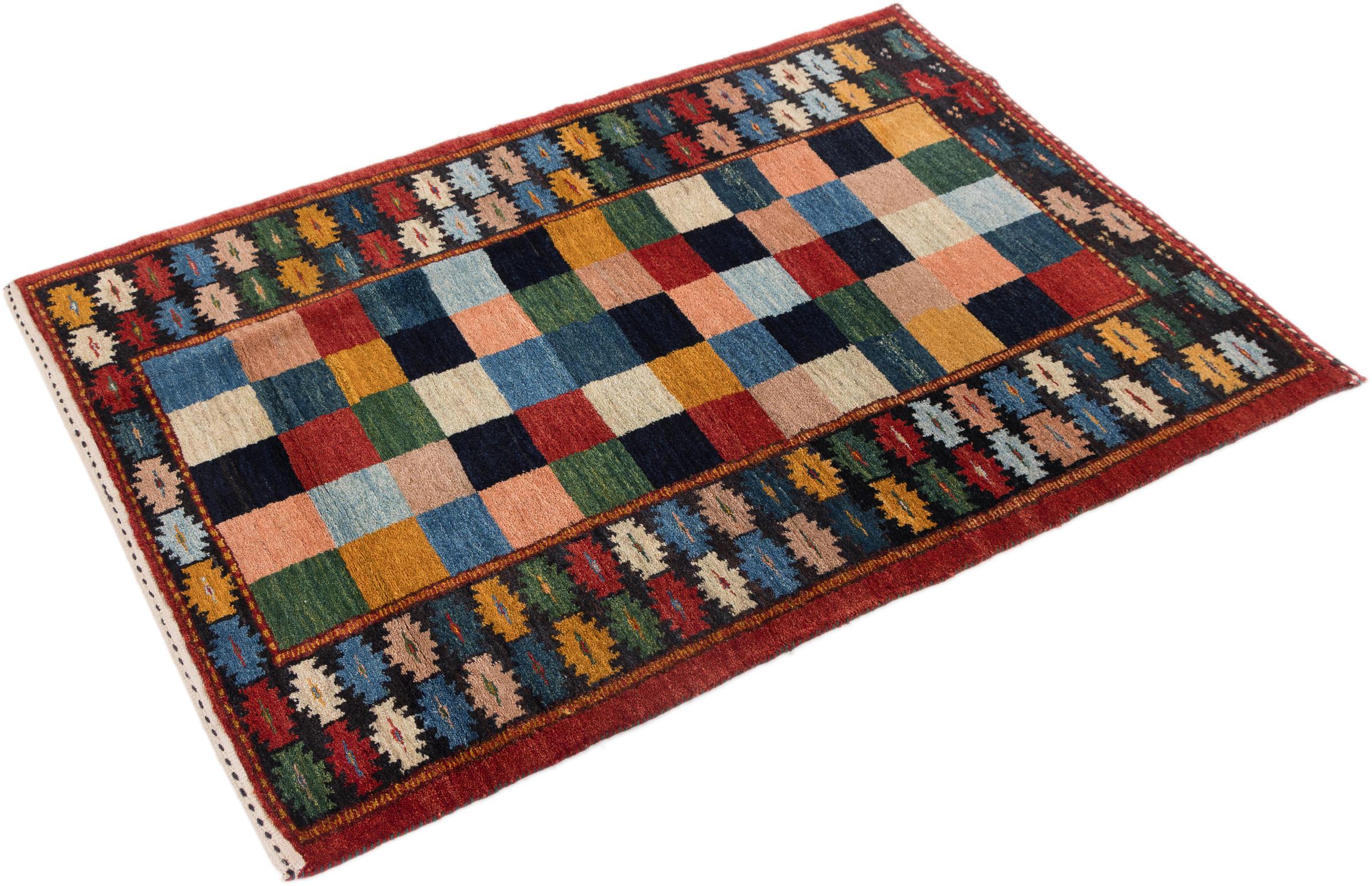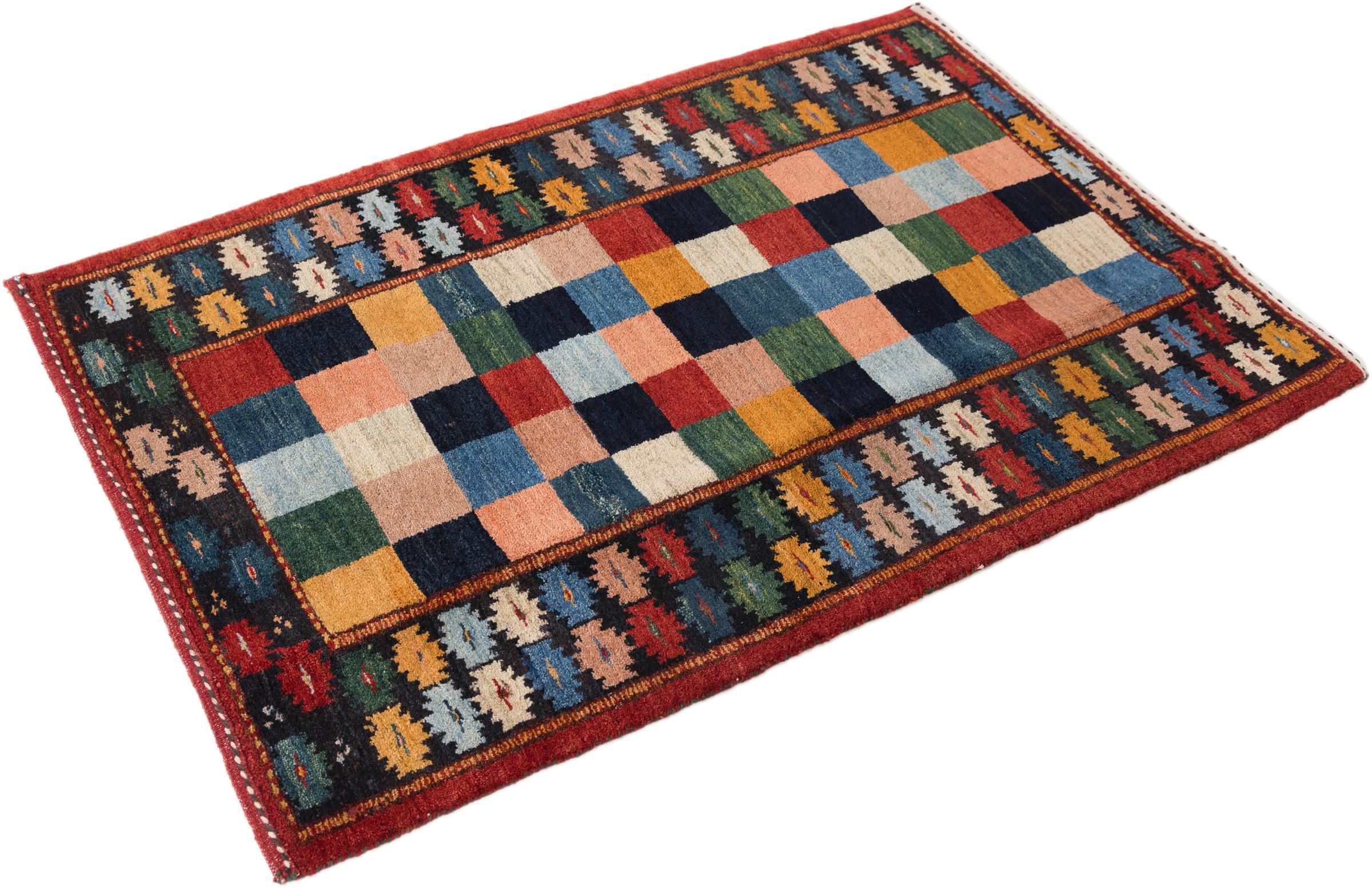 This beautiful rug is a Persian Gabbeh and thus belongs to the highest quality Gabbeh rugs. The rugs are knotted by nomads or semi-nomads in Iran following traditional handicraft. The simple motifs and patterns are mostly inspired by the nomads' close environment. For example camels, trees or bushes can be found on the traditional rugs. Persian Gabbeh rugs are made of wool from locally raised flocks of sheep. The wool is therefore mostly still spun by hand. Thus each of these oriental rugs embodies a unique character of centuries-old culture.