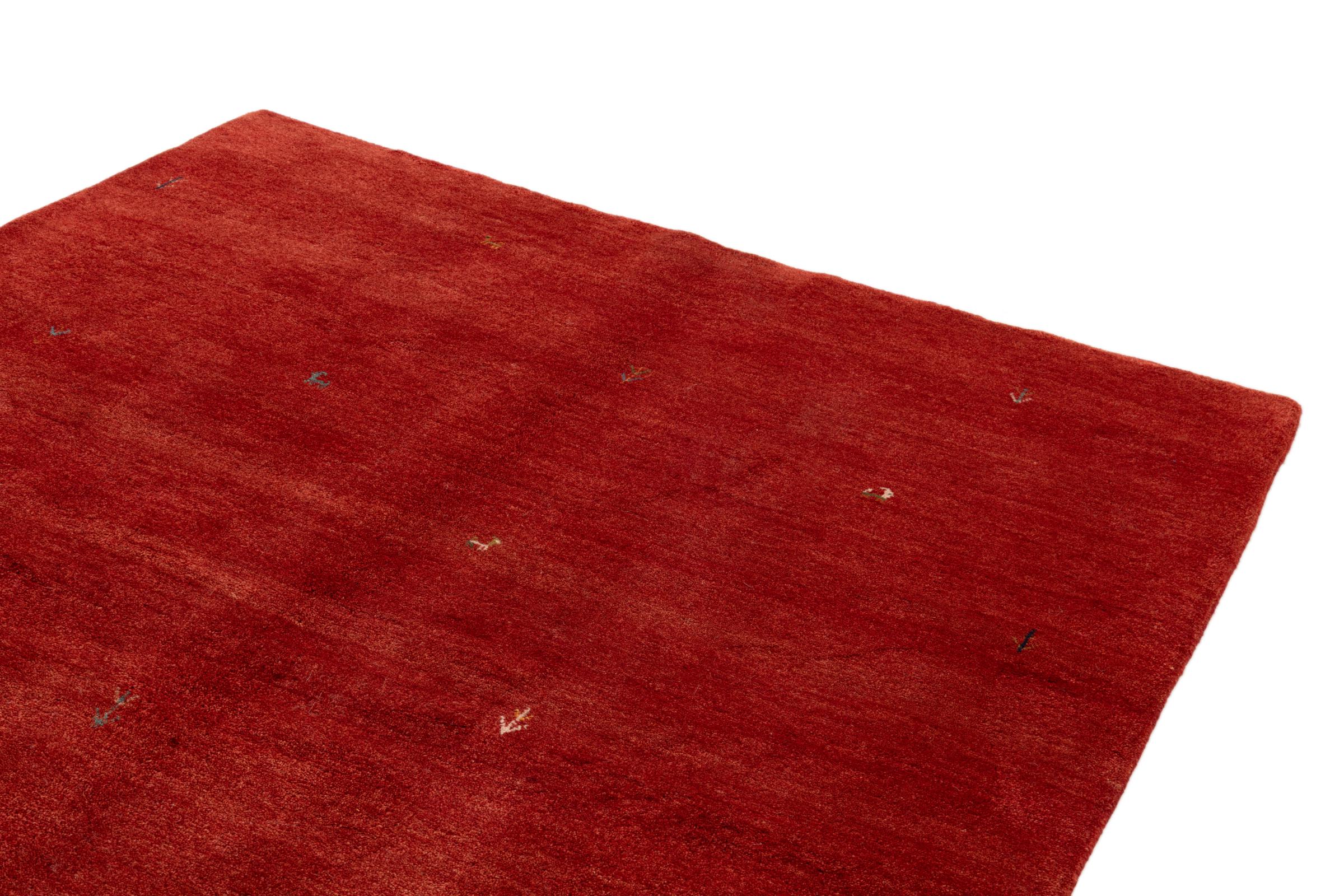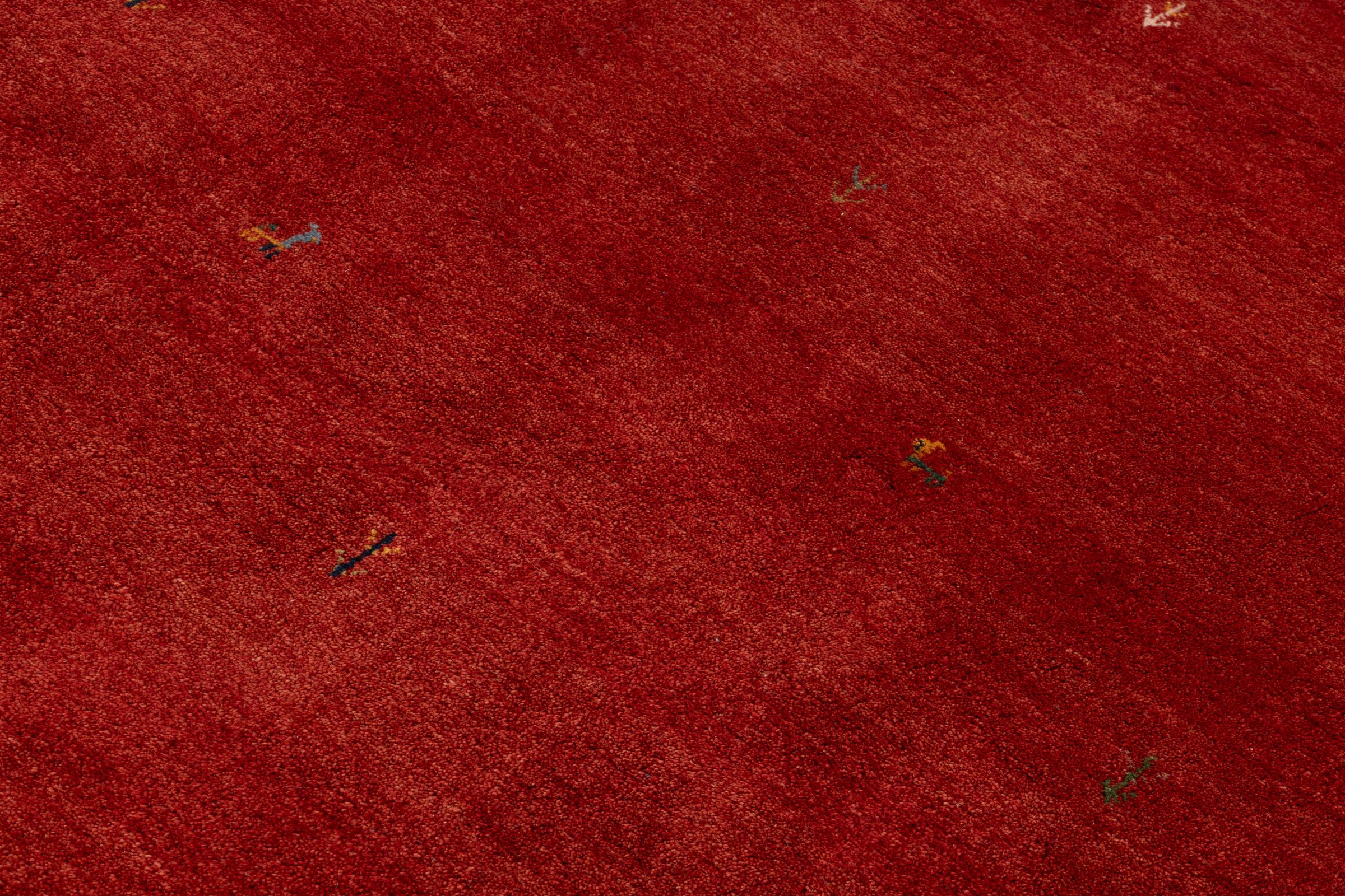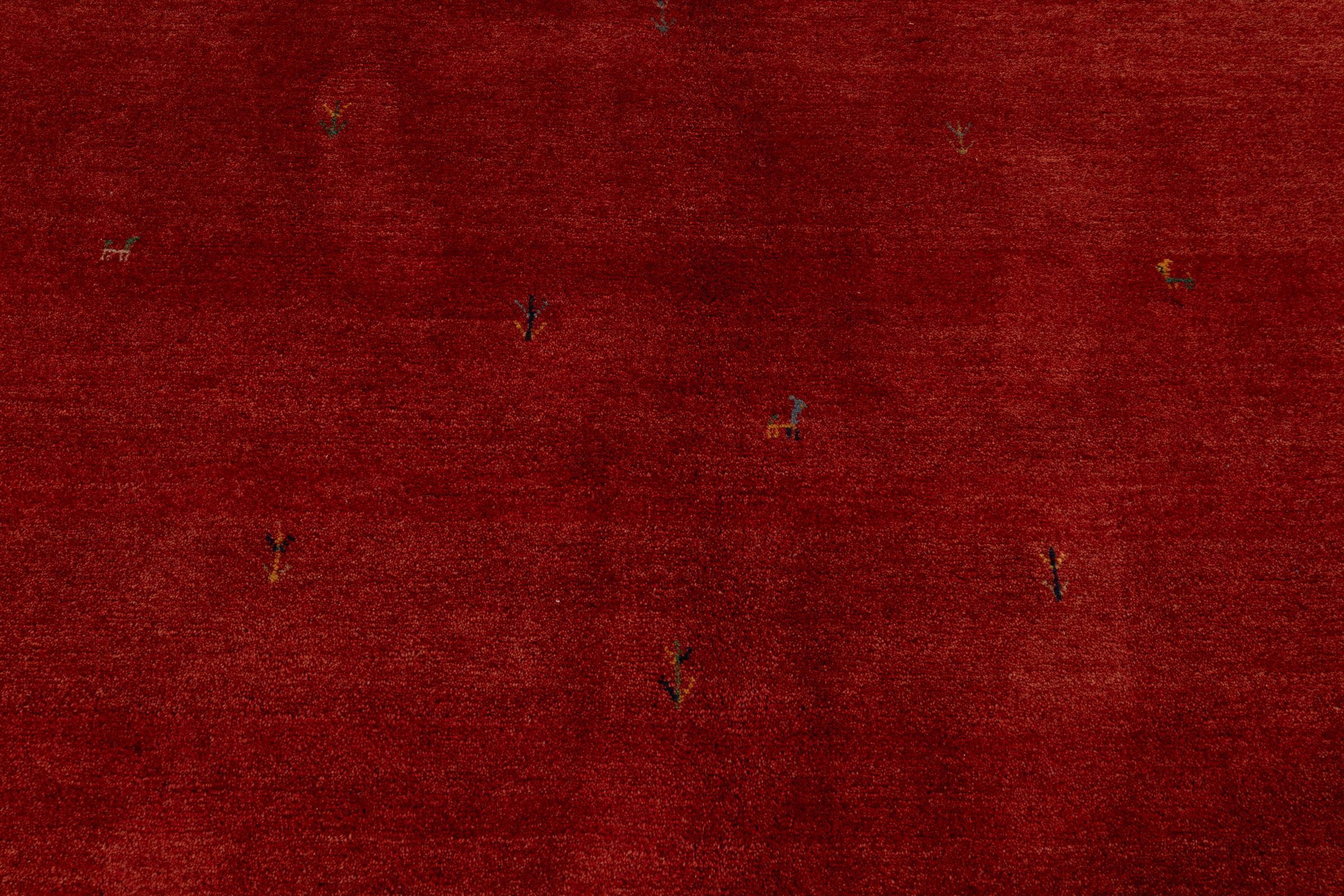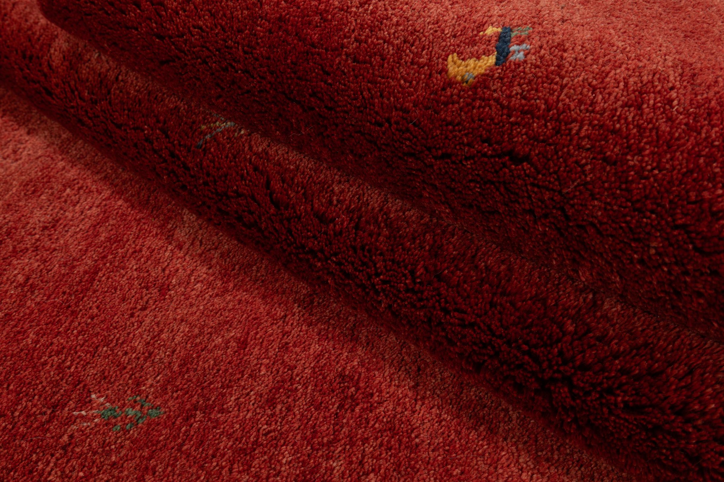 This beautiful rug is a Persian Gabbeh and thus belongs to the highest quality Gabbeh rugs. The rugs are knotted by nomads or semi-nomads in Iran following traditional handicraft. The simple motifs and patterns are mostly inspired by the nomads' close environment. For example camels, trees or bushes can be found on the traditional rugs. Persian Gabbeh rugs are made of wool from locally raised flocks of sheep. The wool is therefore mostly still spun by hand. Thus each of these oriental rugs embodies a unique character of centuries-old culture.