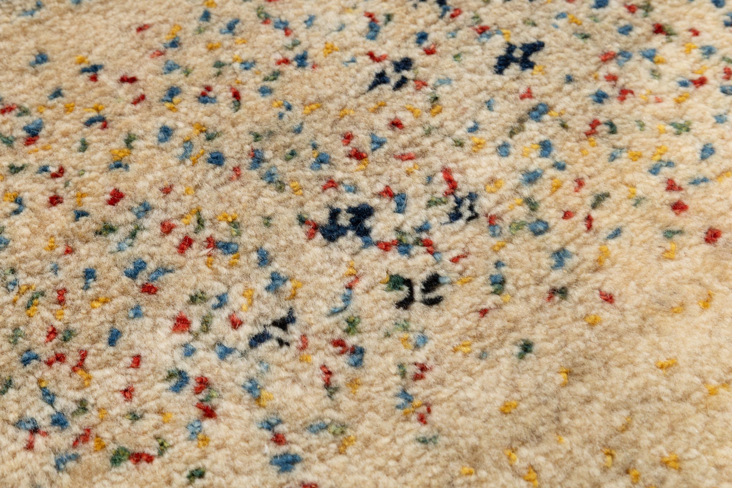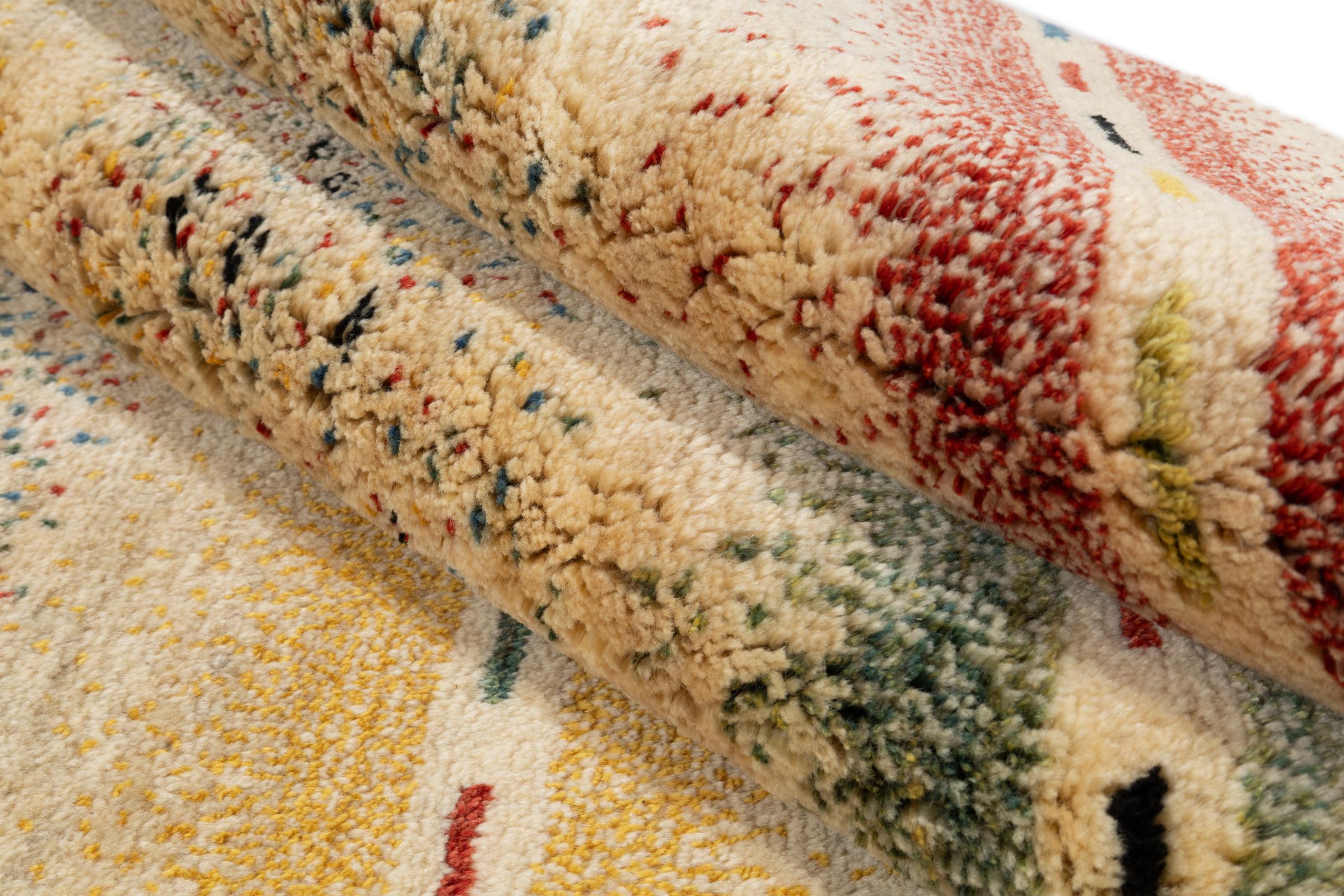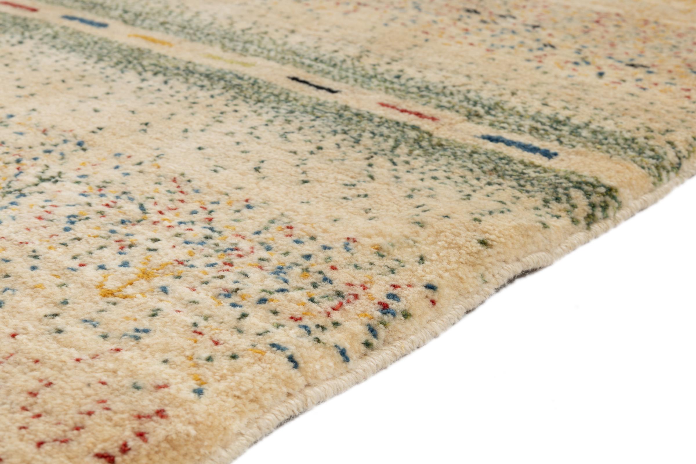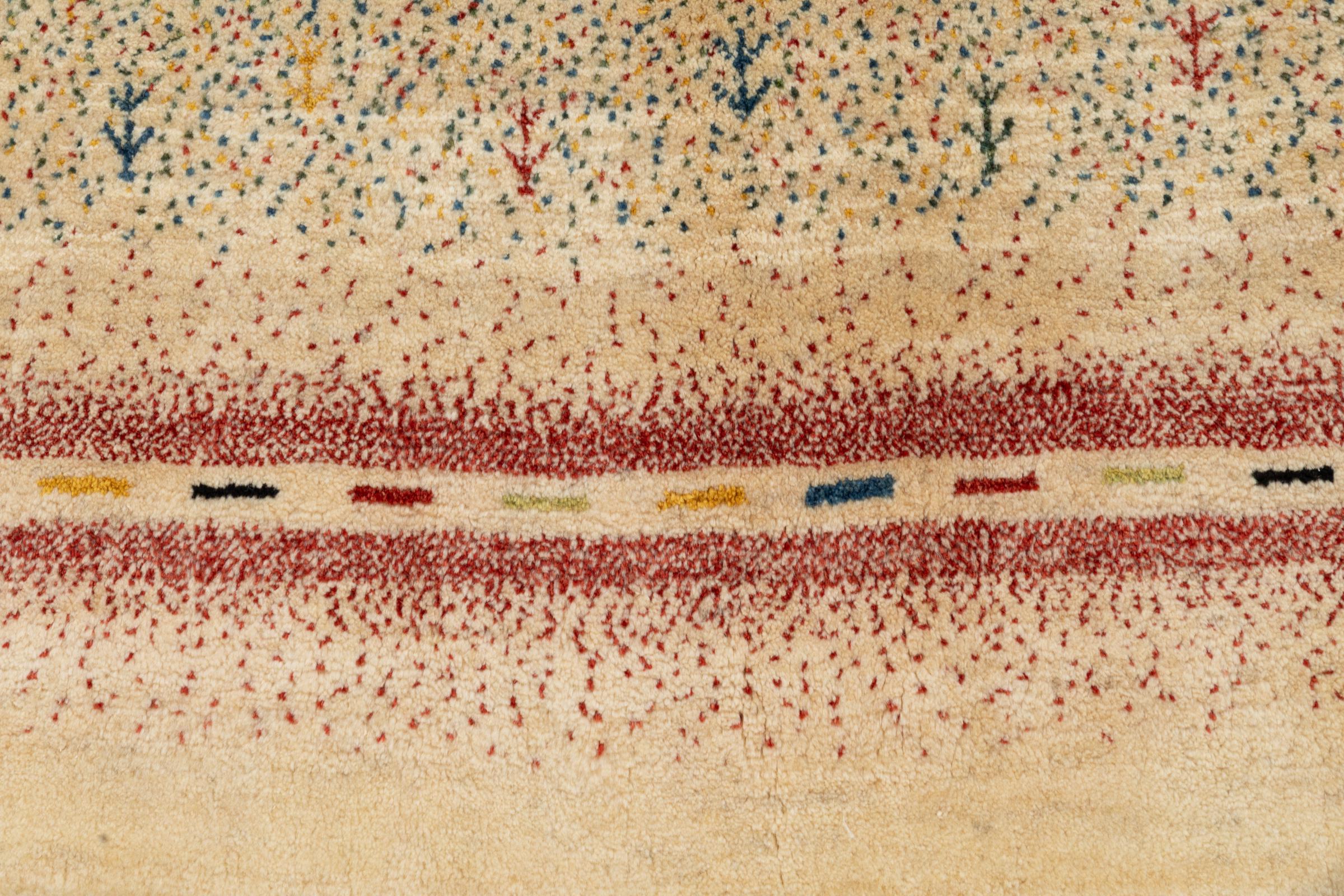 This beautiful rug is a Persian Gabbeh and thus belongs to the highest quality Gabbeh rugs. The rugs are knotted by nomads or semi-nomads in Iran following traditional handicraft. The simple motifs and patterns are mostly inspired by the nomads' close environment. For example camels, trees or bushes can be found on the traditional rugs. Persian Gabbeh rugs are made of wool from locally raised flocks of sheep. The wool is therefore mostly still spun by hand. Thus each of these oriental rugs embodies a unique character of centuries-old culture.