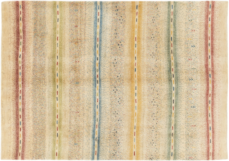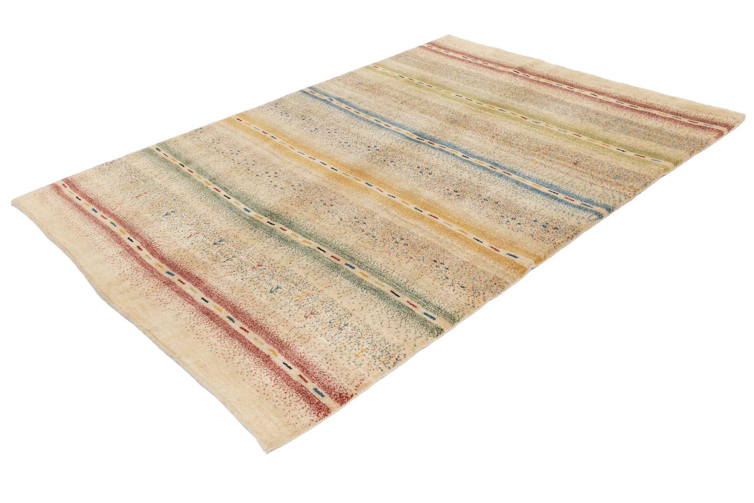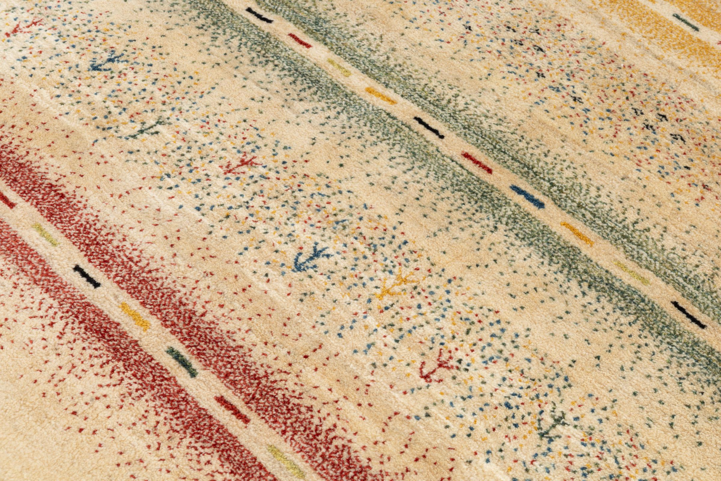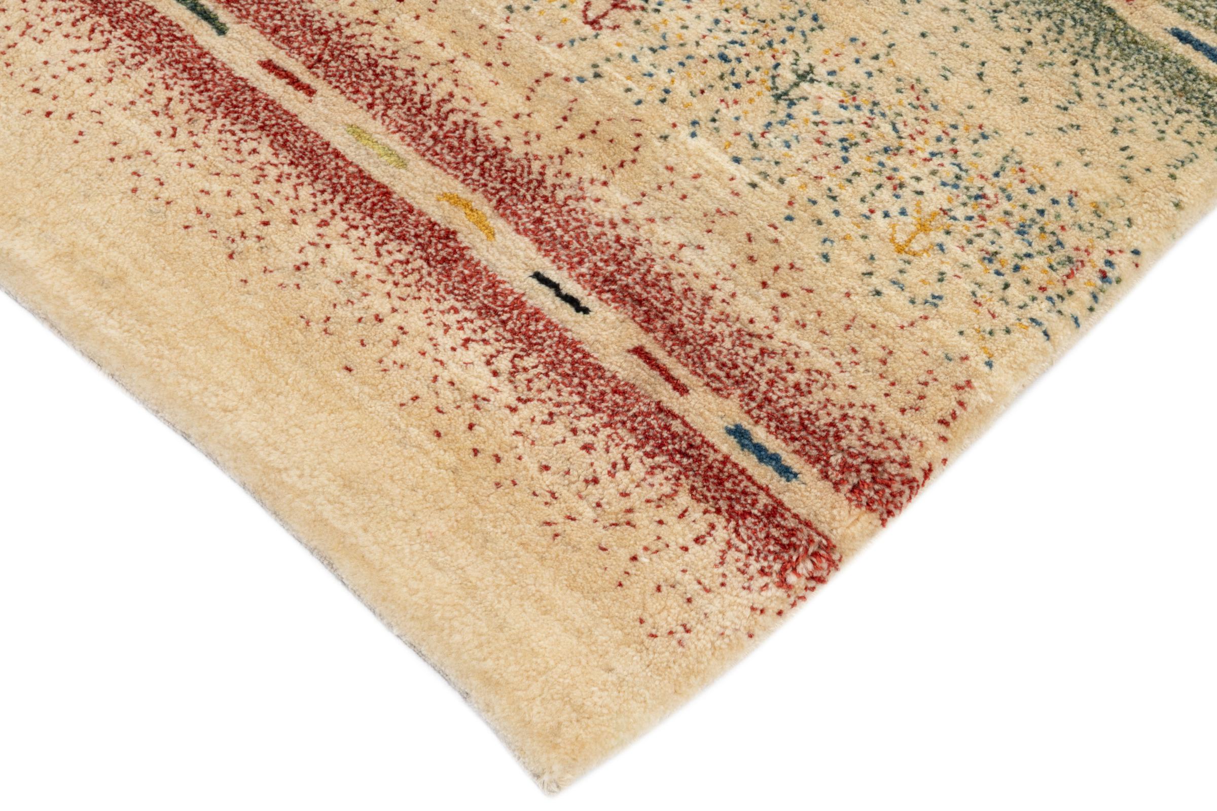 This beautiful rug is a Persian Gabbeh and thus belongs to the highest quality Gabbeh rugs. The rugs are knotted by nomads or semi-nomads in Iran following traditional handicraft. The simple motifs and patterns are mostly inspired by the nomads' close environment. For example camels, trees or bushes can be found on the traditional rugs. Persian Gabbeh rugs are made of wool from locally raised flocks of sheep. The wool is therefore mostly still spun by hand. Thus each of these oriental rugs embodies a unique character of centuries-old culture.