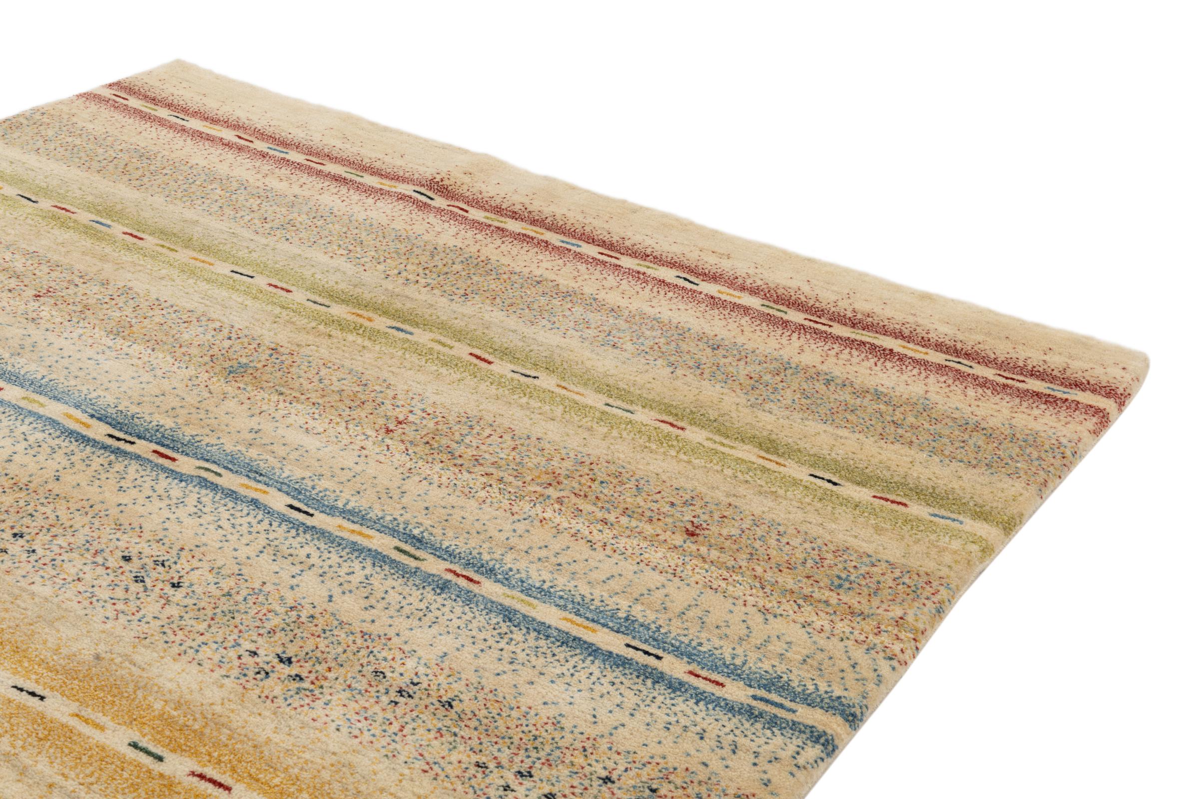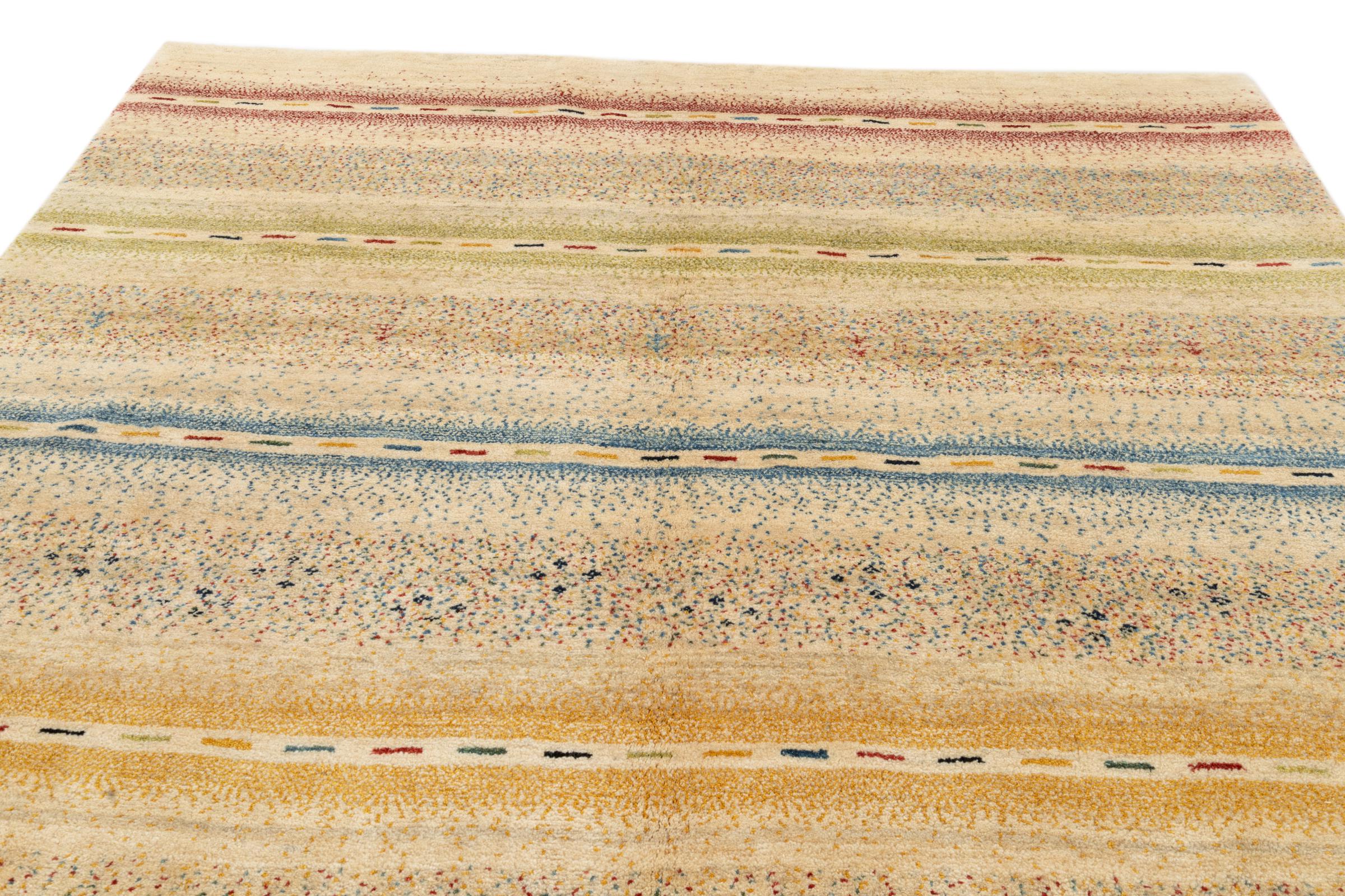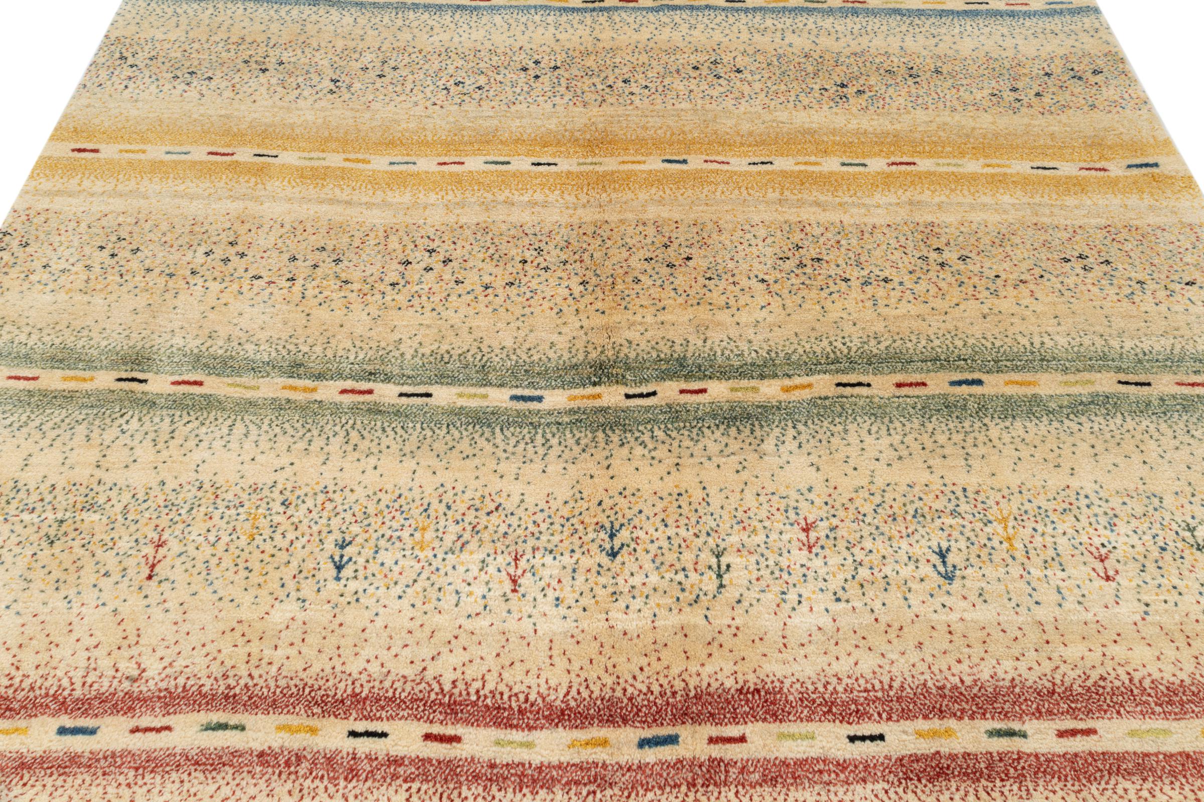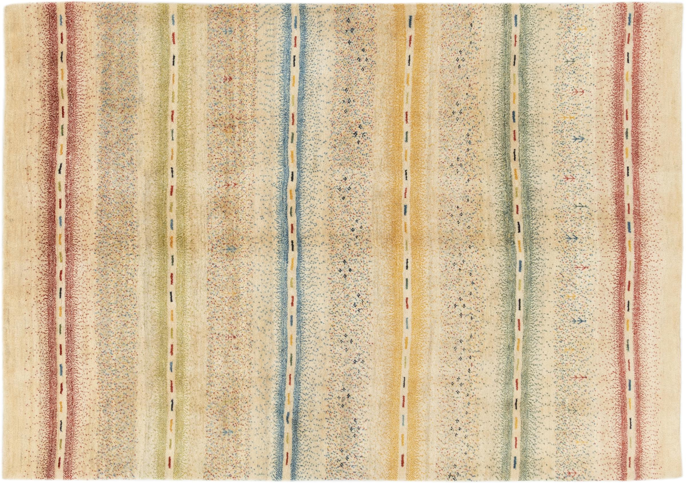 This beautiful rug is a Persian Gabbeh and thus belongs to the highest quality Gabbeh rugs. The rugs are knotted by nomads or semi-nomads in Iran following traditional handicraft. The simple motifs and patterns are mostly inspired by the nomads' close environment. For example camels, trees or bushes can be found on the traditional rugs. Persian Gabbeh rugs are made of wool from locally raised flocks of sheep. The wool is therefore mostly still spun by hand. Thus each of these oriental rugs embodies a unique character of centuries-old culture.