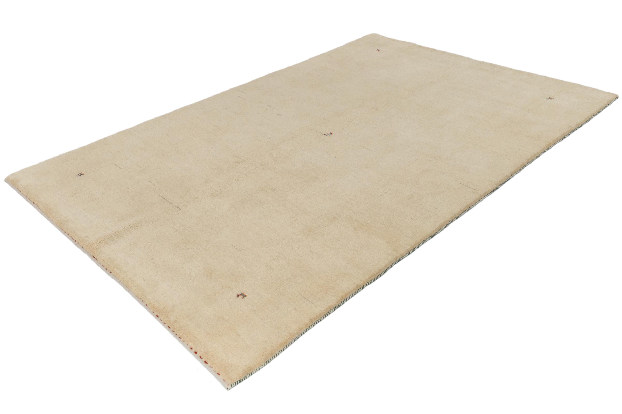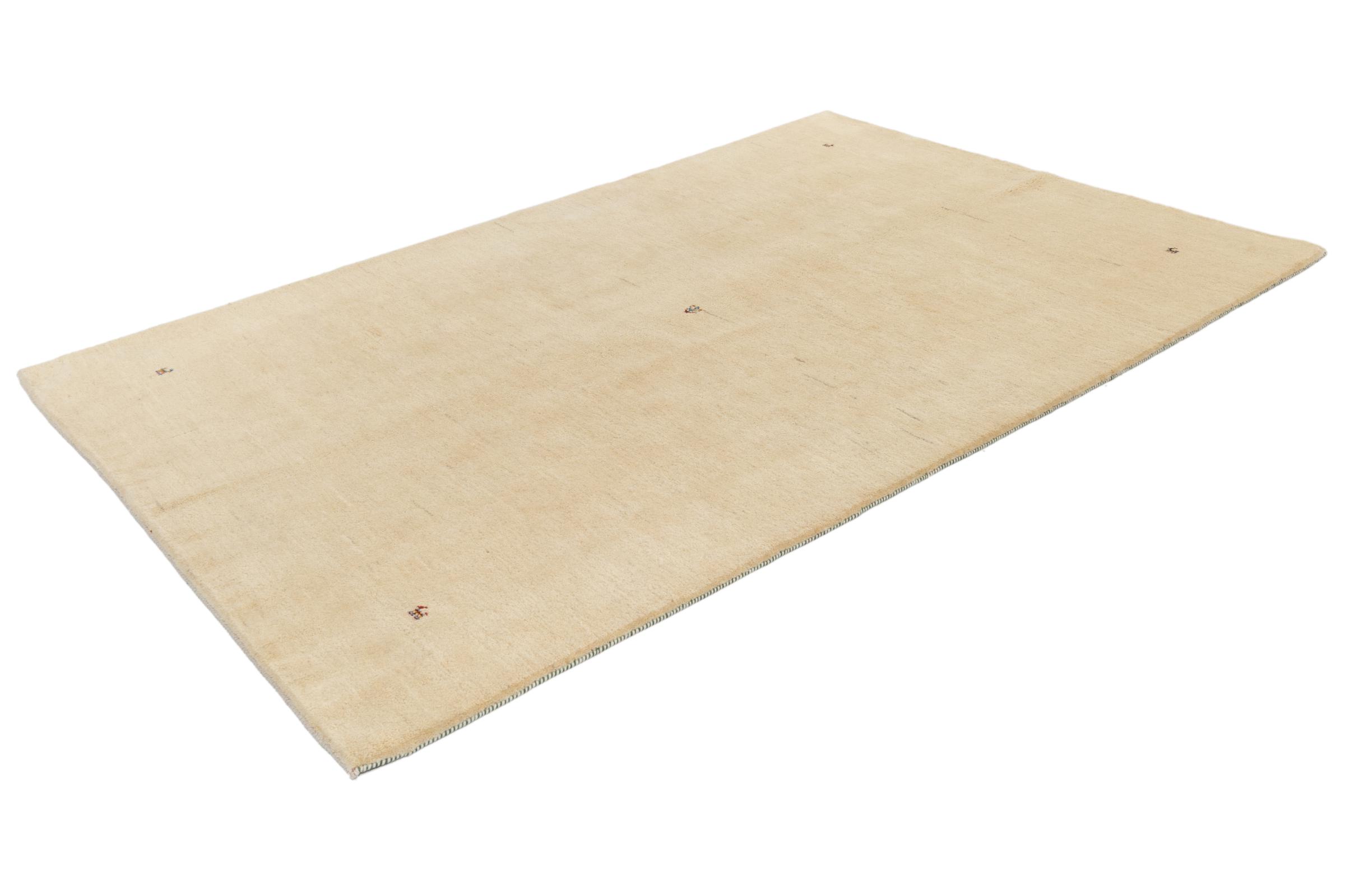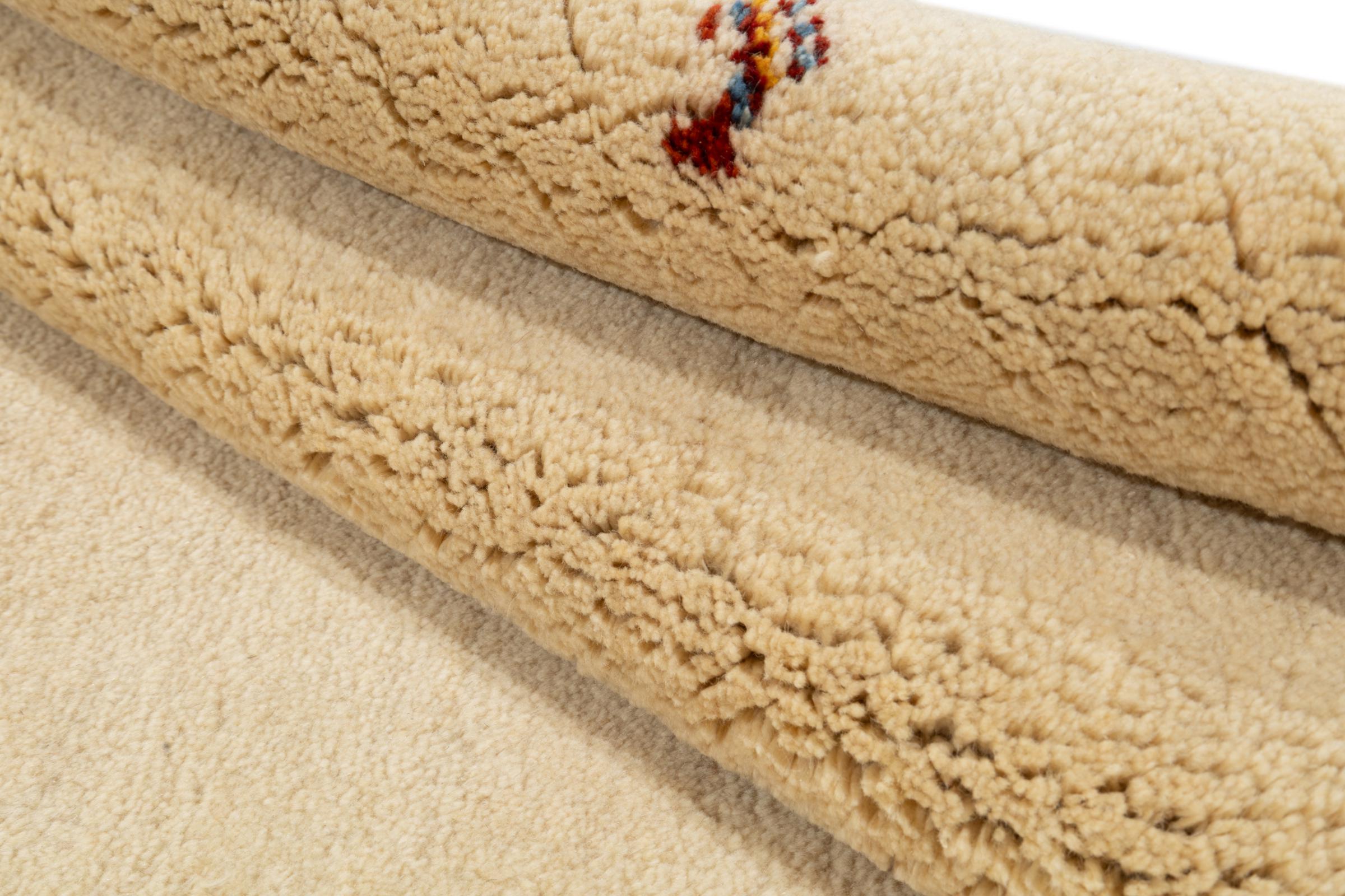 This beautiful rug is a Persian Gabbeh and thus belongs to the highest quality Gabbeh rugs. The rugs are knotted by nomads or semi-nomads in Iran following traditional handicraft. The simple motifs and patterns are mostly inspired by the nomads' close environment. For example camels, trees or bushes can be found on the traditional rugs. Persian Gabbeh rugs are made of wool from locally raised flocks of sheep. The wool is therefore mostly still spun by hand. Thus each of these oriental rugs embodies a unique character of centuries-old culture.