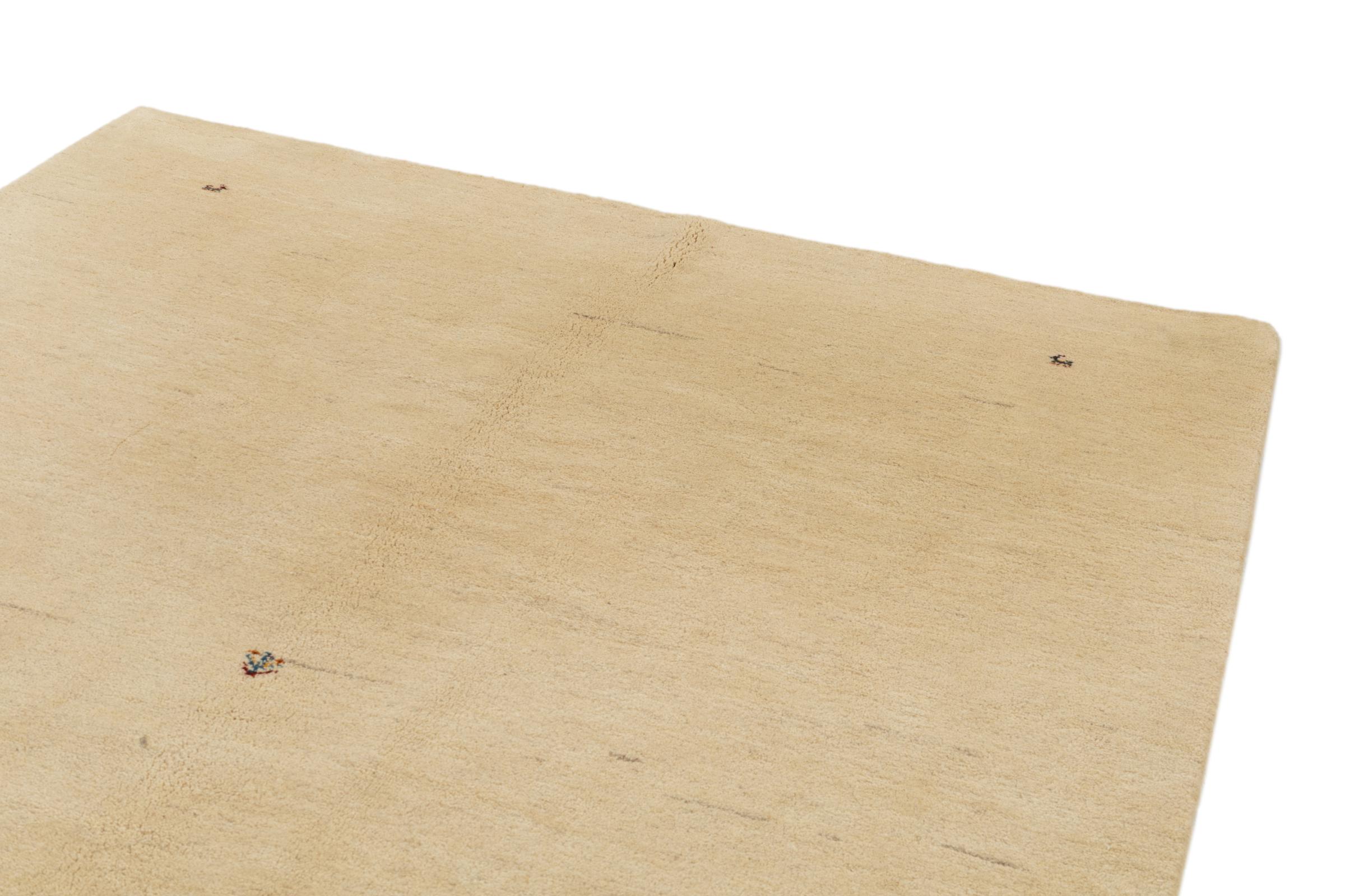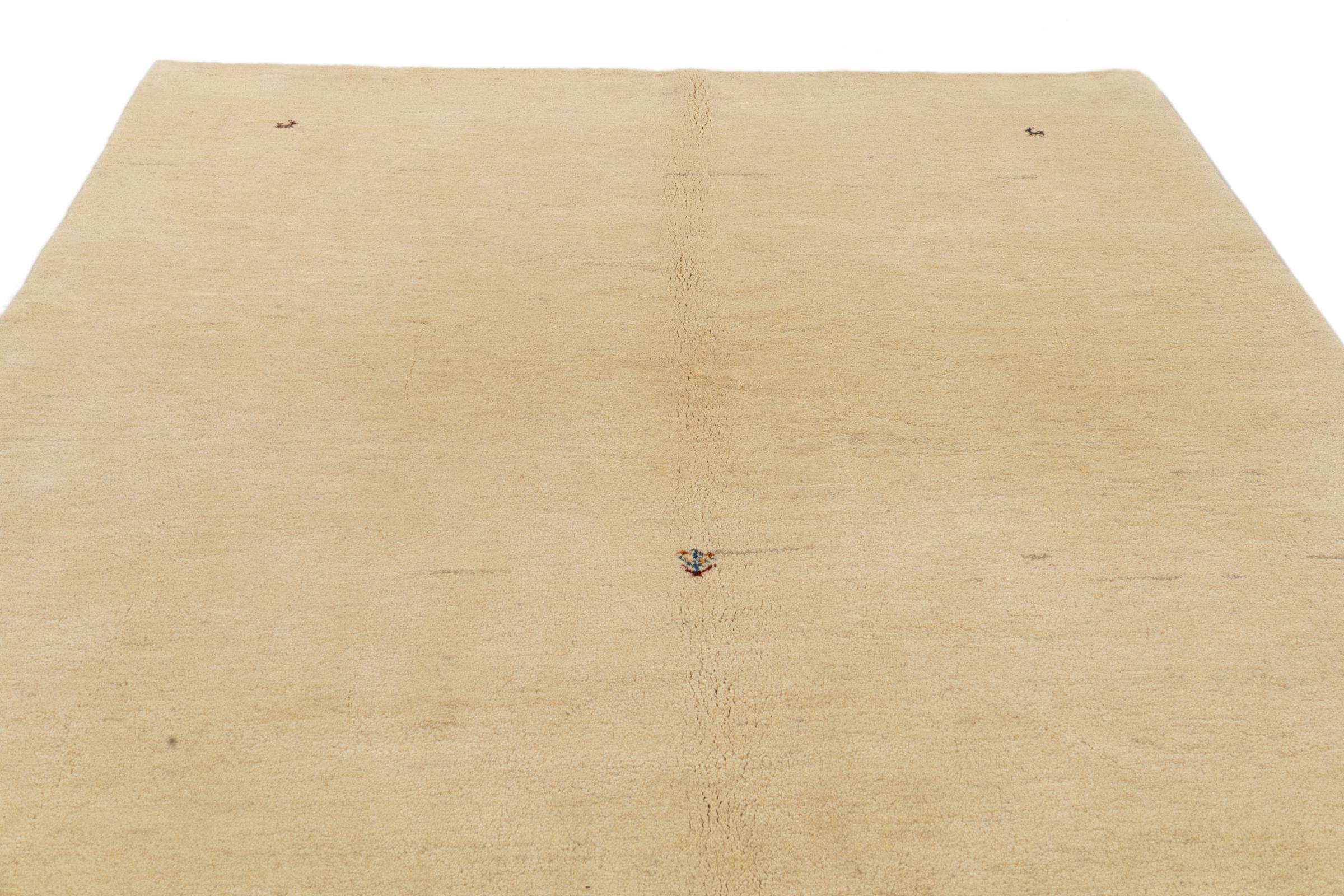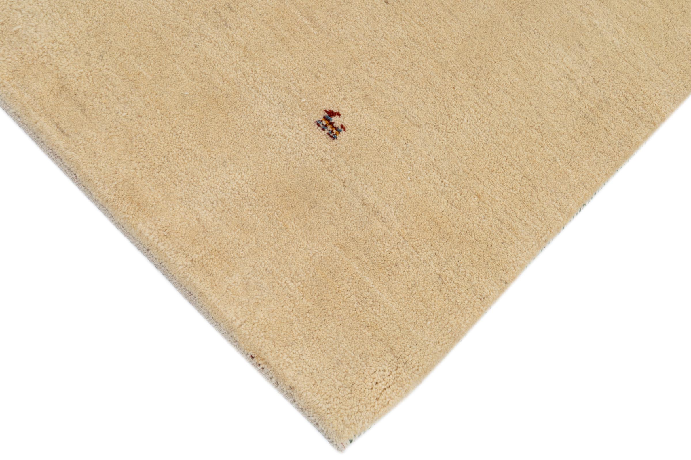 This beautiful rug is a Persian Gabbeh and thus belongs to the highest quality Gabbeh rugs. The rugs are knotted by nomads or semi-nomads in Iran following traditional handicraft. The simple motifs and patterns are mostly inspired by the nomads' close environment. For example camels, trees or bushes can be found on the traditional rugs. Persian Gabbeh rugs are made of wool from locally raised flocks of sheep. The wool is therefore mostly still spun by hand. Thus each of these oriental rugs embodies a unique character of centuries-old culture.