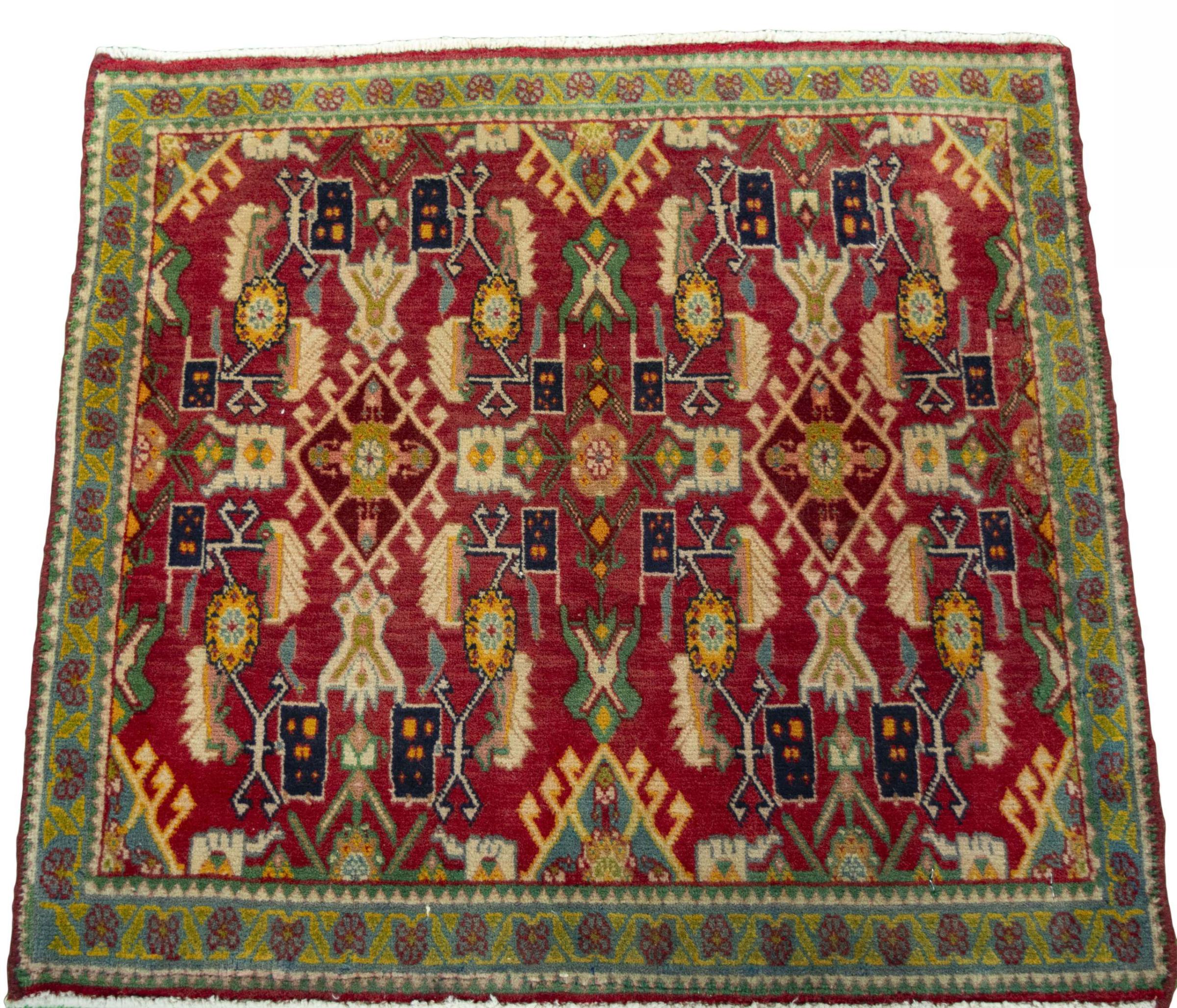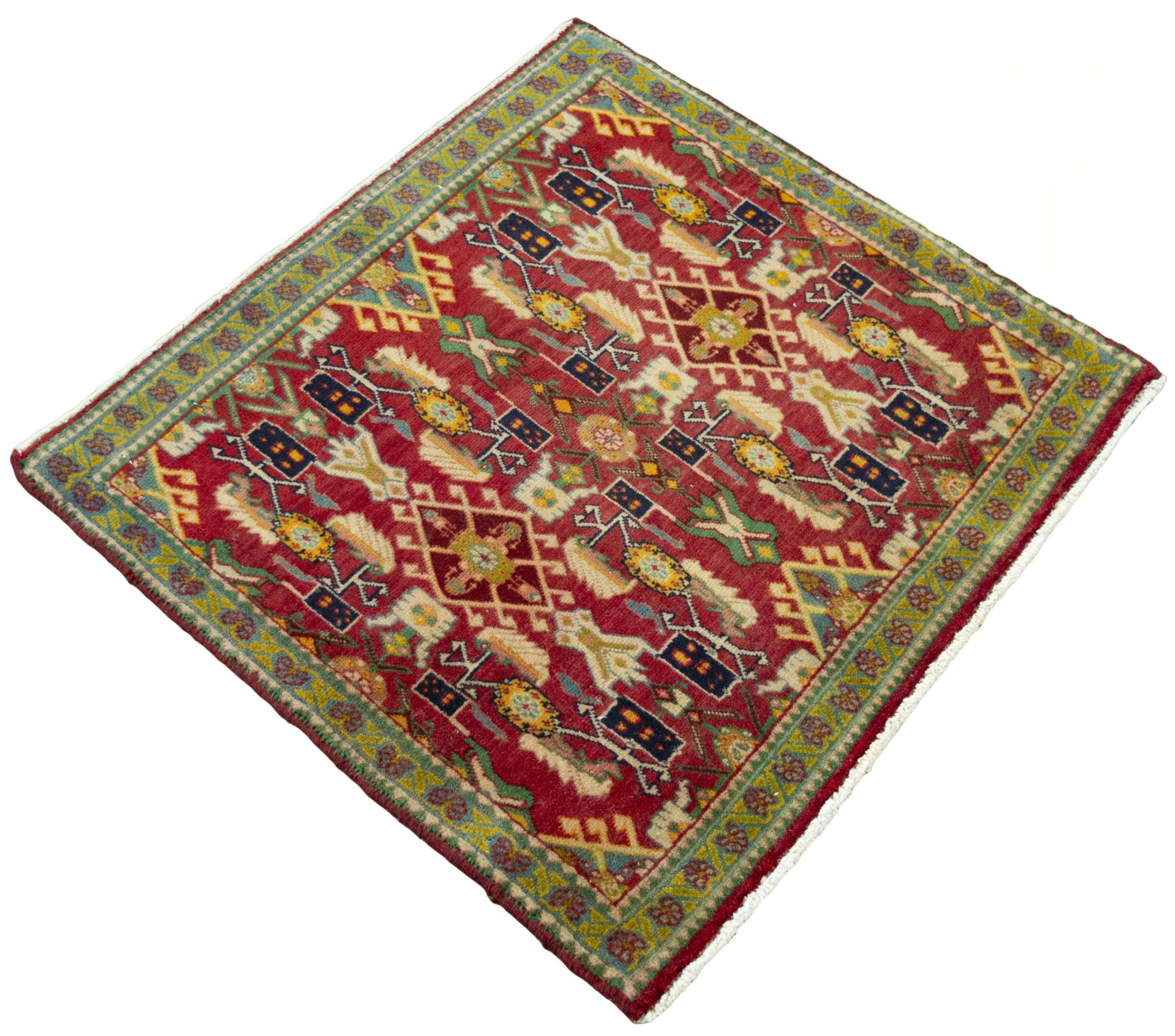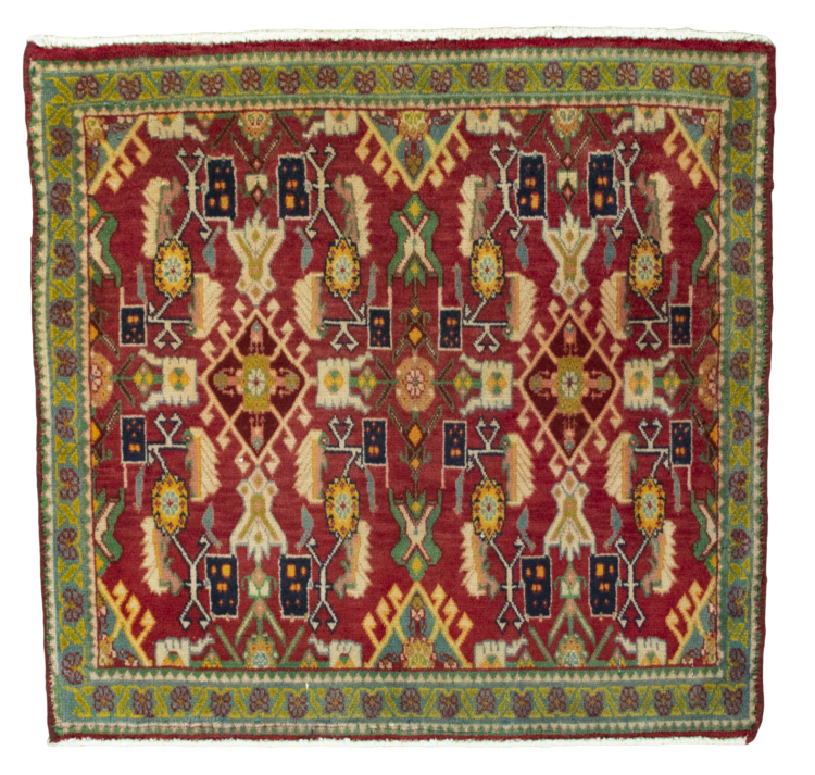 Carpet ID: 300149009405043 Size: 61x66 cm Thickness: ap. 10 mm Knot density: 96 000 - 120 000 / m² Manufacturing: Knotted by hand Pile: Handspun wool Warp: Sheep wool Origin: Persia Age: New Weight: ap. 1 kg In stock: Unique - Only 1 in stock