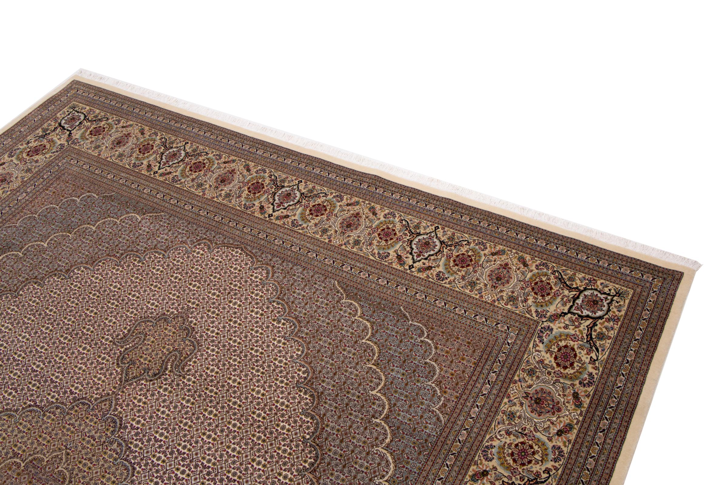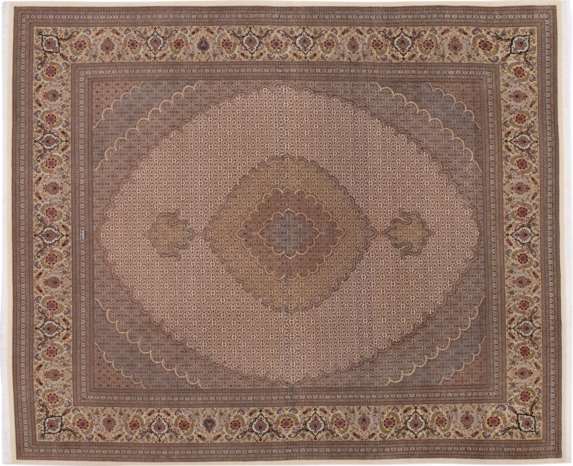 Carpet ID: 292751003635896 Size: 299x246 cm Thickness: ap. 7 mm Knot density: 440 000 - 490 000 / m² Manufacturing: Knotted by hand Pile: Wool with silk Warp: Cotton Origin: Persia Age: New Weight: ap. 22 kg Also know as Tabriz, Tabris, Täbris, Tebriz, Tebris, 40Raj, 50Raj In stock: Unique - Only 1 in stock