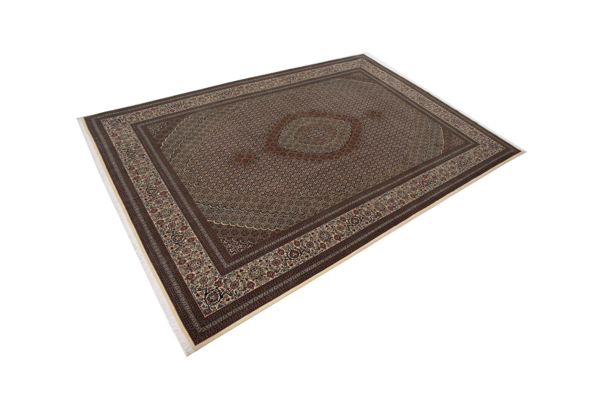 Carpet ID: 293755009585090 Size: 351x249 cm Thickness: ap. 7 mm Knot density: 440 000 - 490 000 / m² Manufacturing: Knotted by hand Pile: Wool with silk Warp: Cotton Origin: Persia Age: New Weight: ap. 26 kg Also know as Tabriz, Tabris, Täbris, Tebriz, Tebris, 40Raj, 50Raj In stock: Unique - Only 1 in stock
