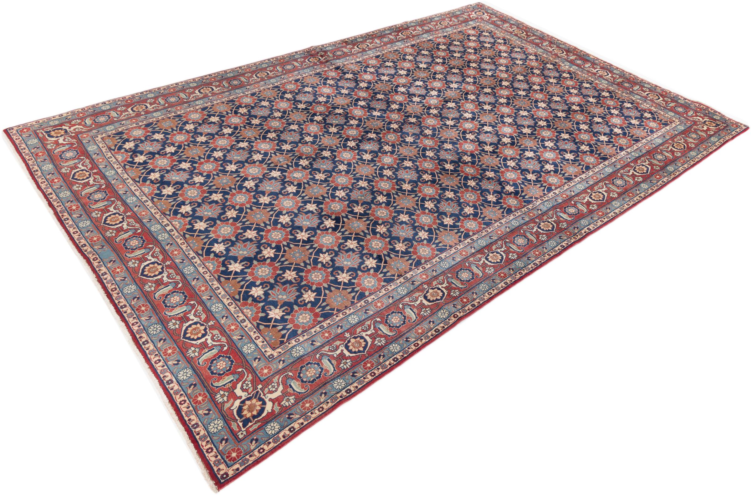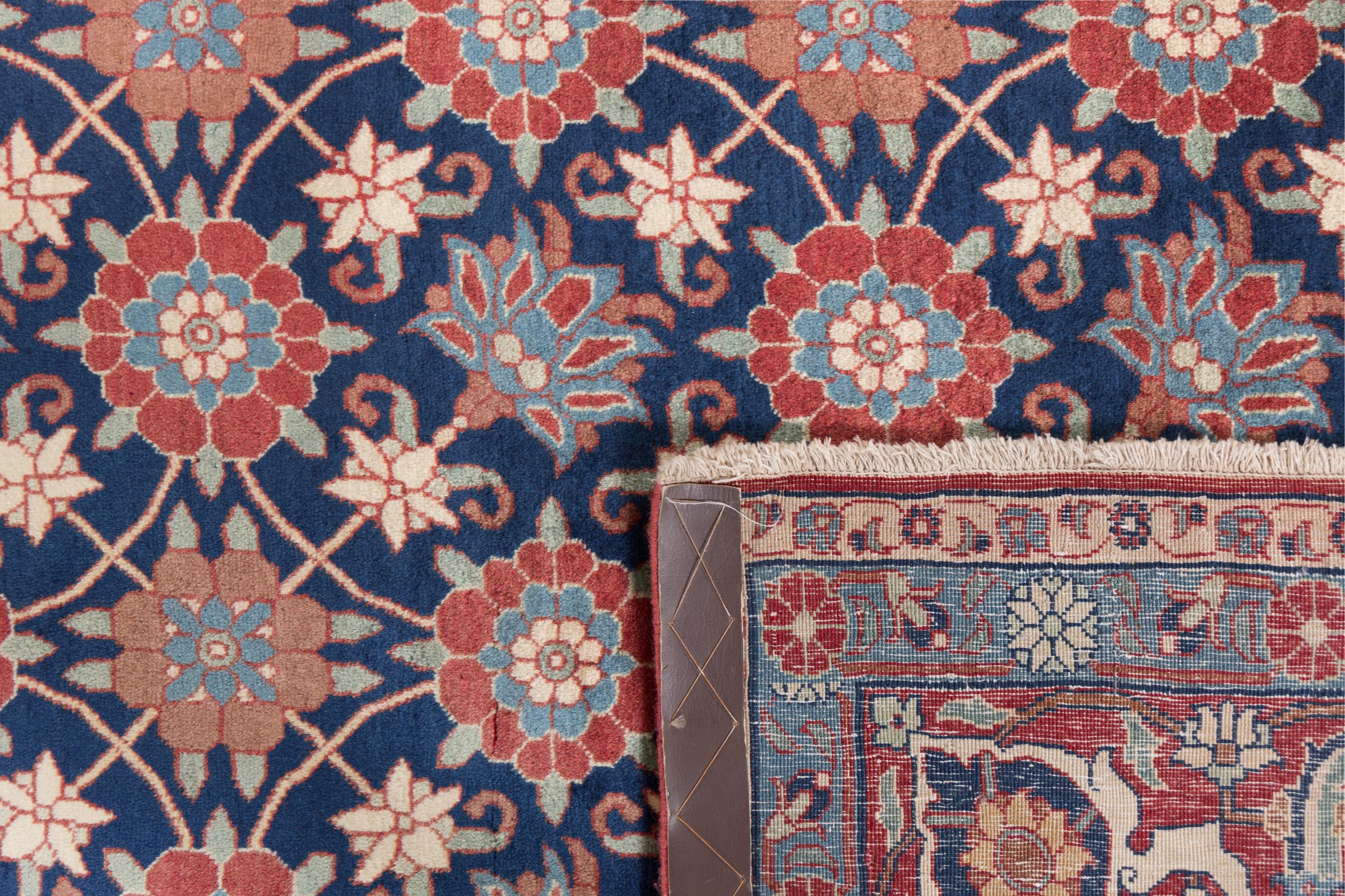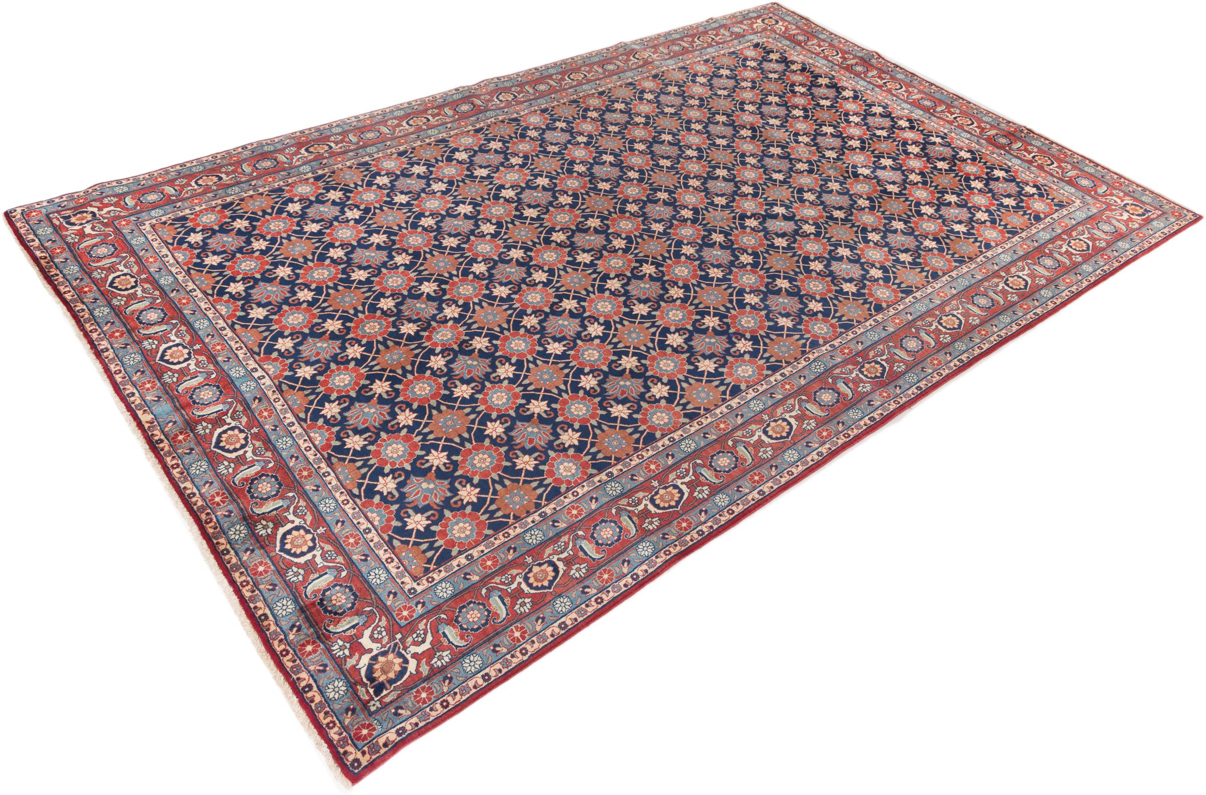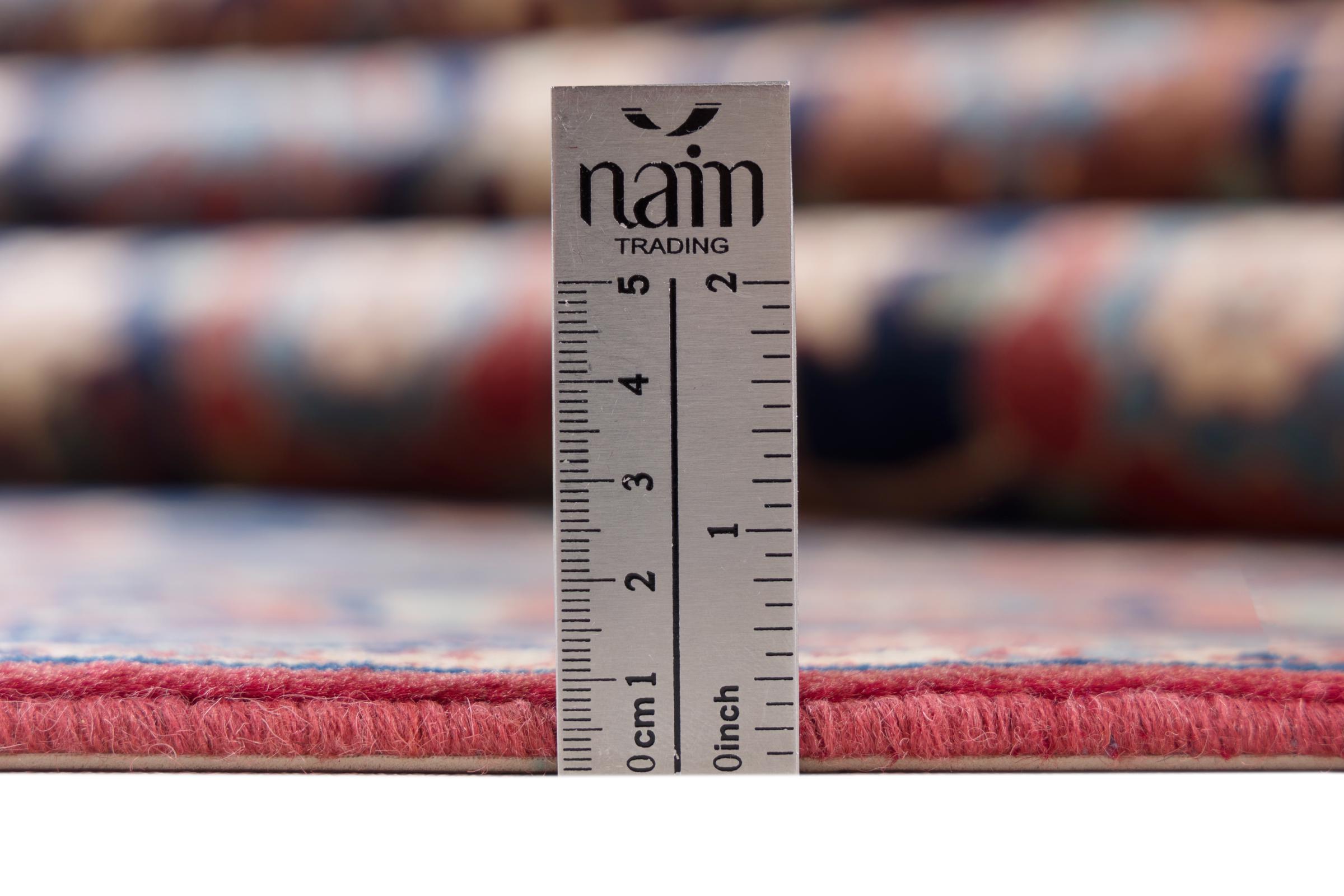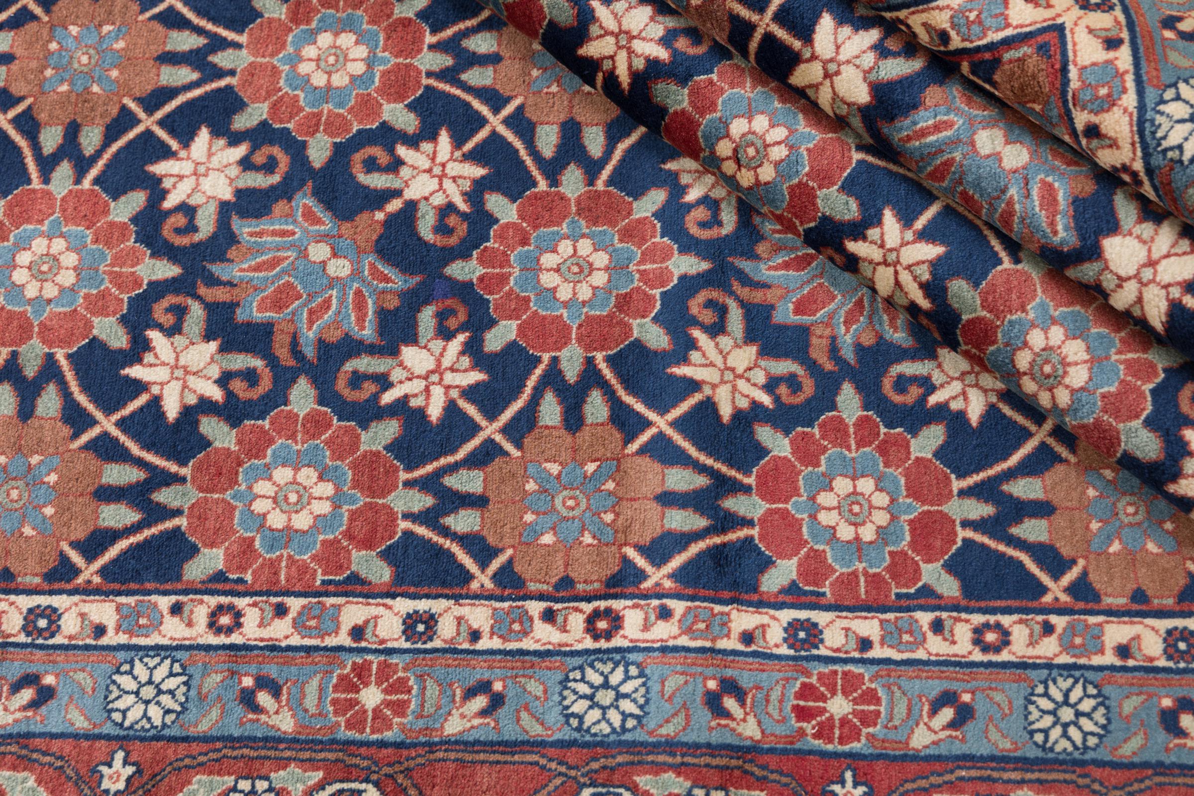 This exquisite Persian rug from the Iranian city of Varamin pampers your eyes with a symmetrical pattern in oriental colours. The hand-knotted model is a unique piece of contemporary history - made from robust but soft sheep's wool of the highest quality. With its floral elements, the rug gives your home a cosy atmosphere full of oriental joie de vivre.