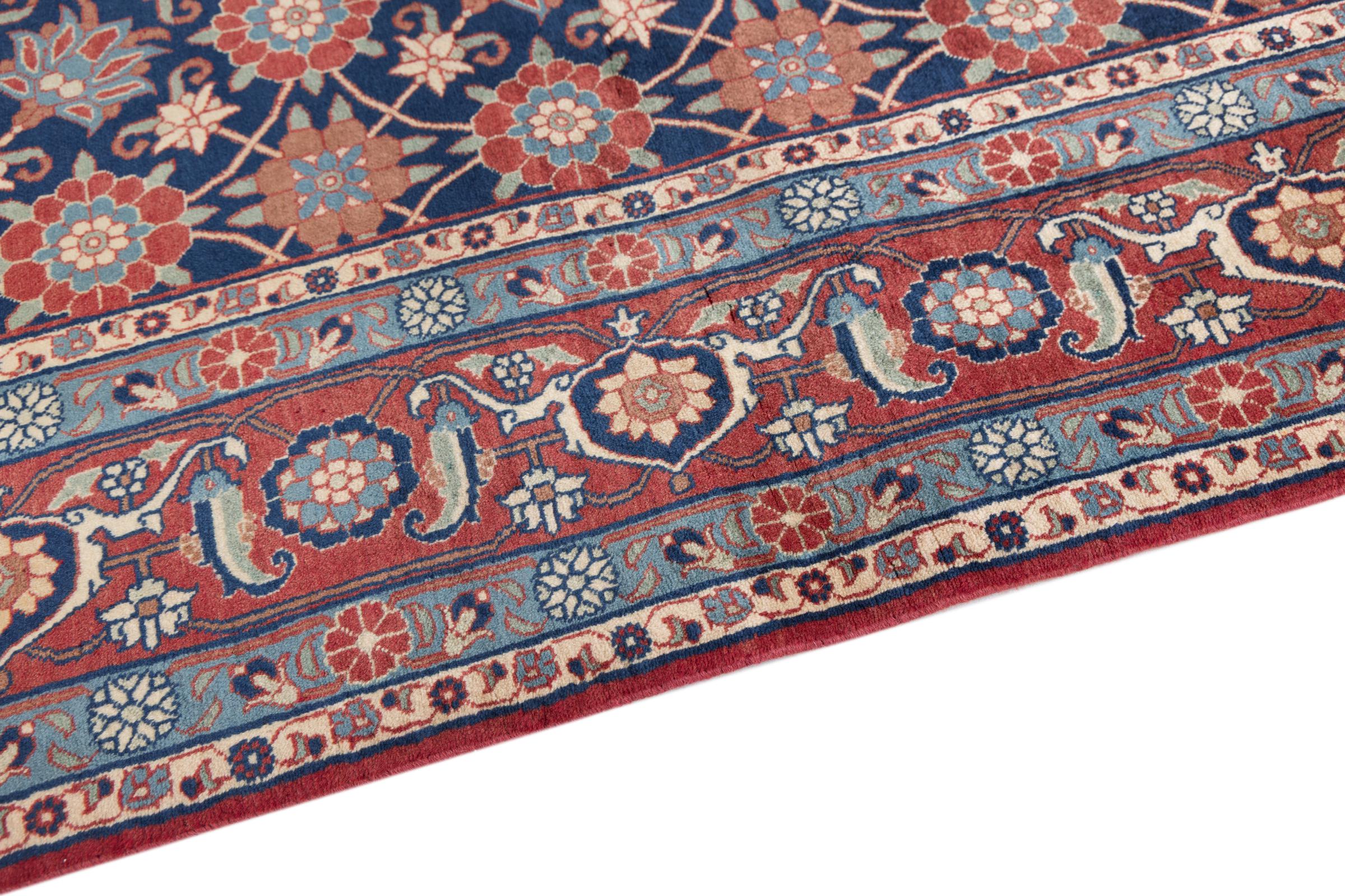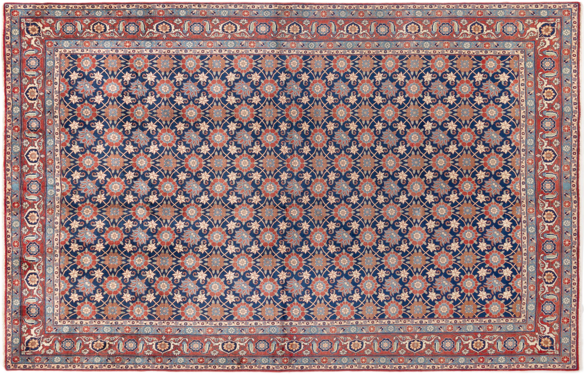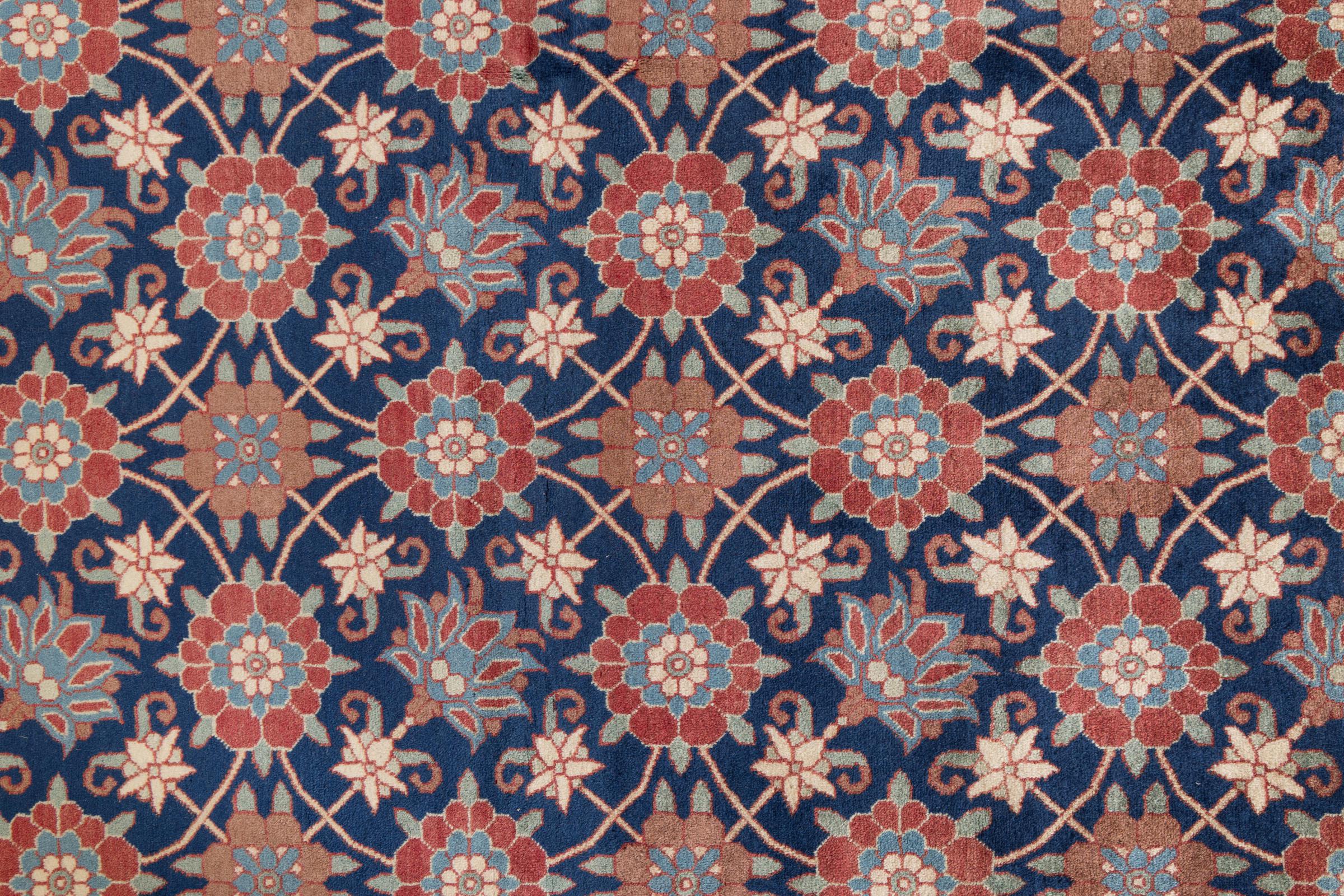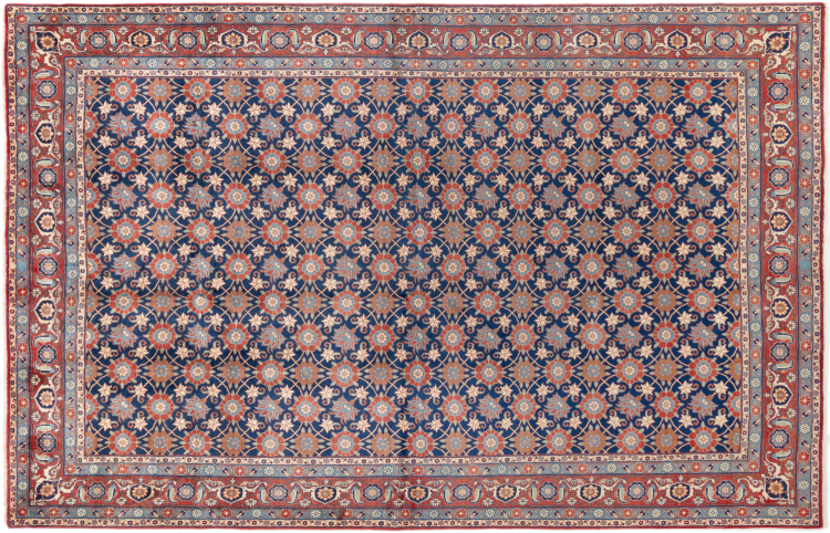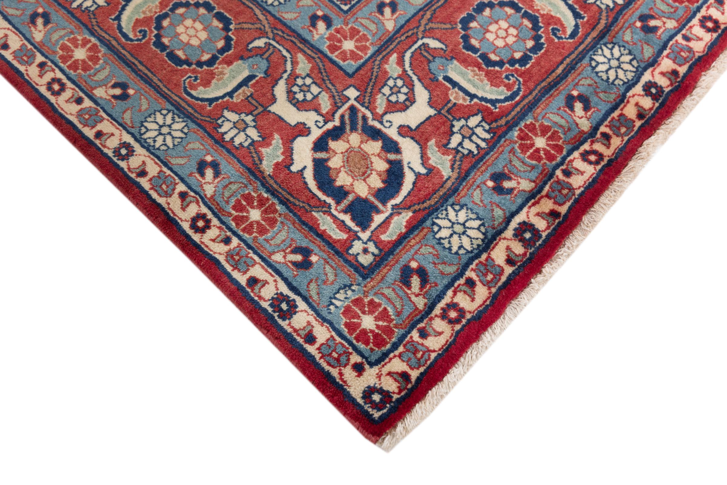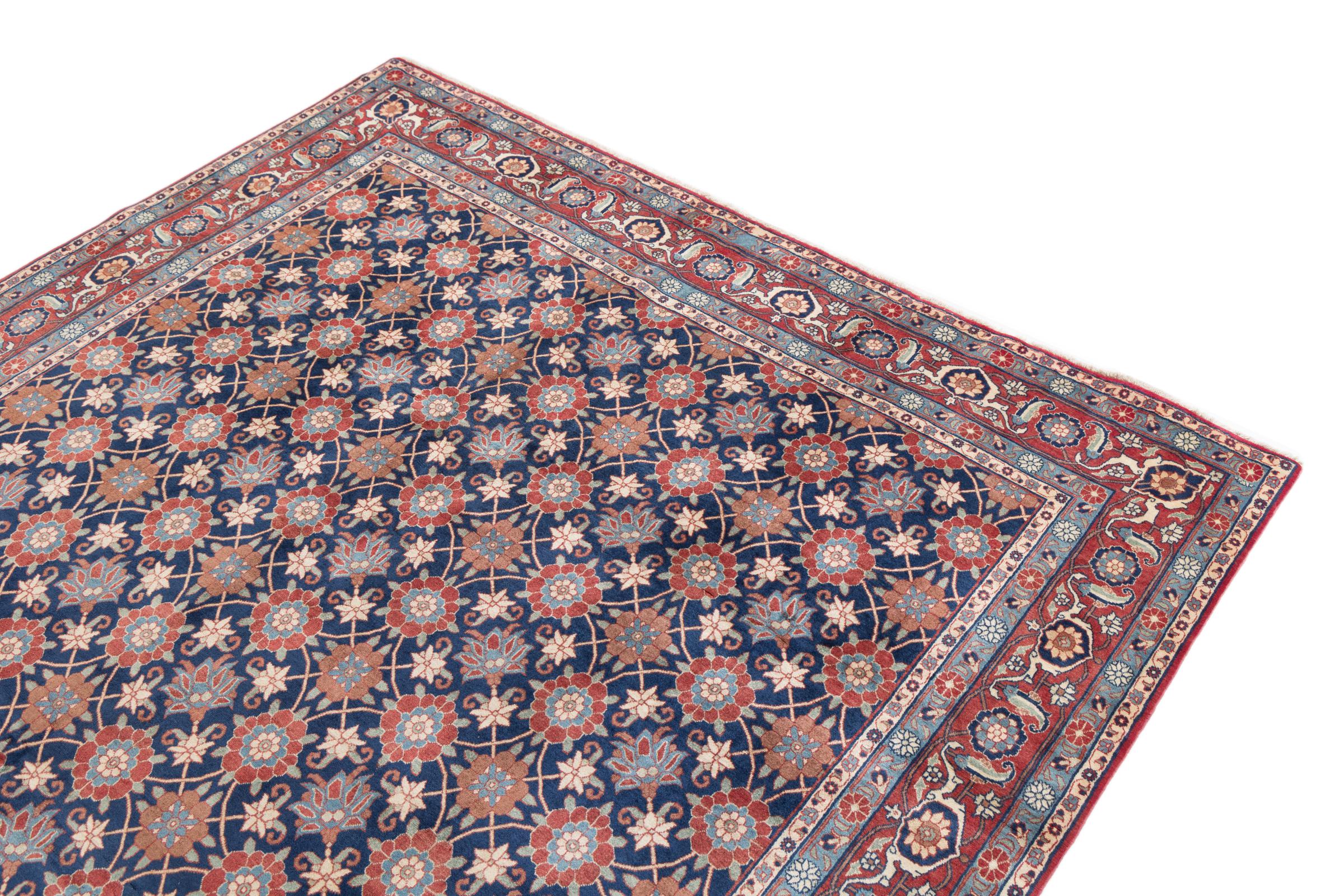 This exquisite Persian rug from the Iranian city of Varamin pampers your eyes with a symmetrical pattern in oriental colours. The hand-knotted model is a unique piece of contemporary history - made from robust but soft sheep's wool of the highest quality. With its floral elements, the rug gives your home a cosy atmosphere full of oriental joie de vivre.